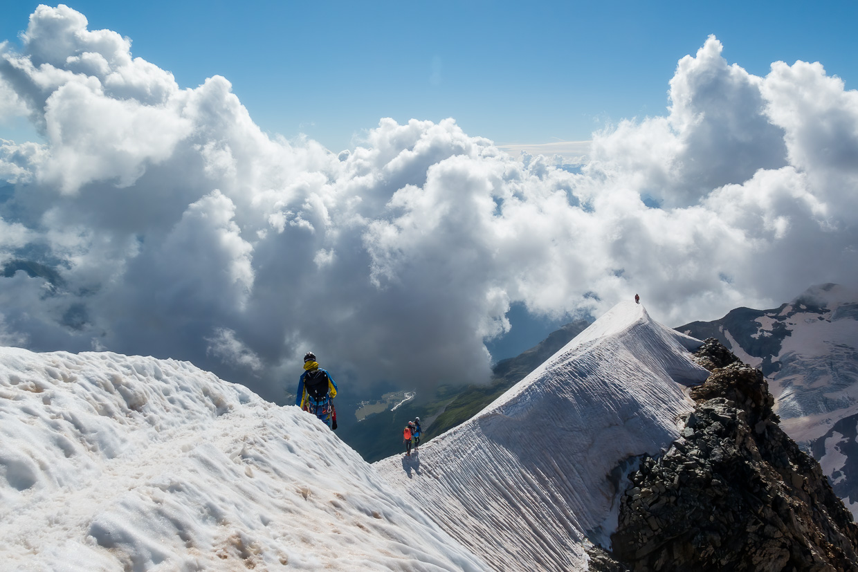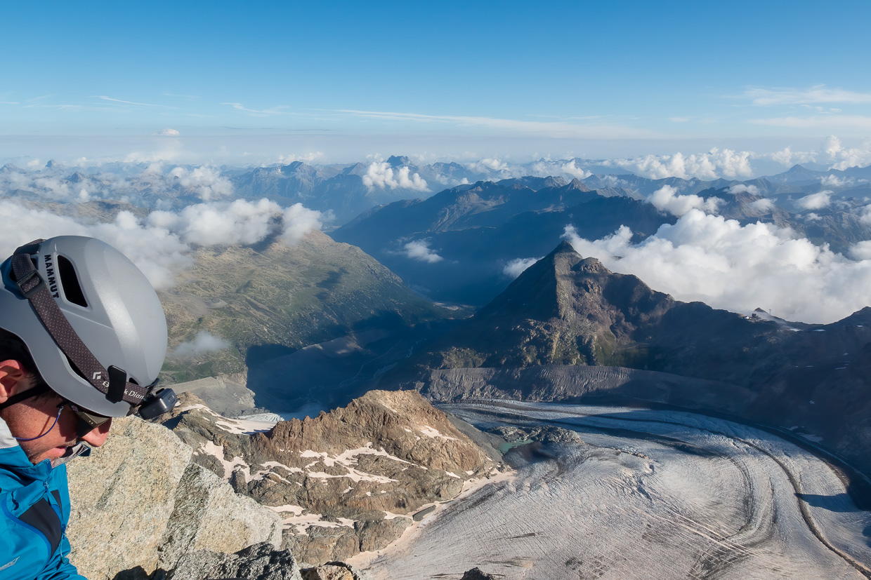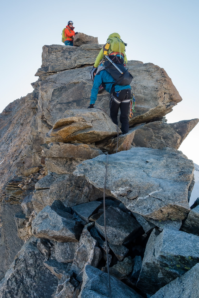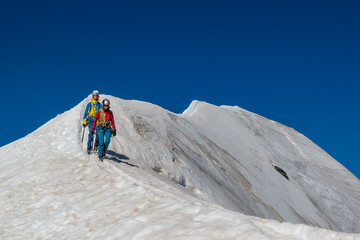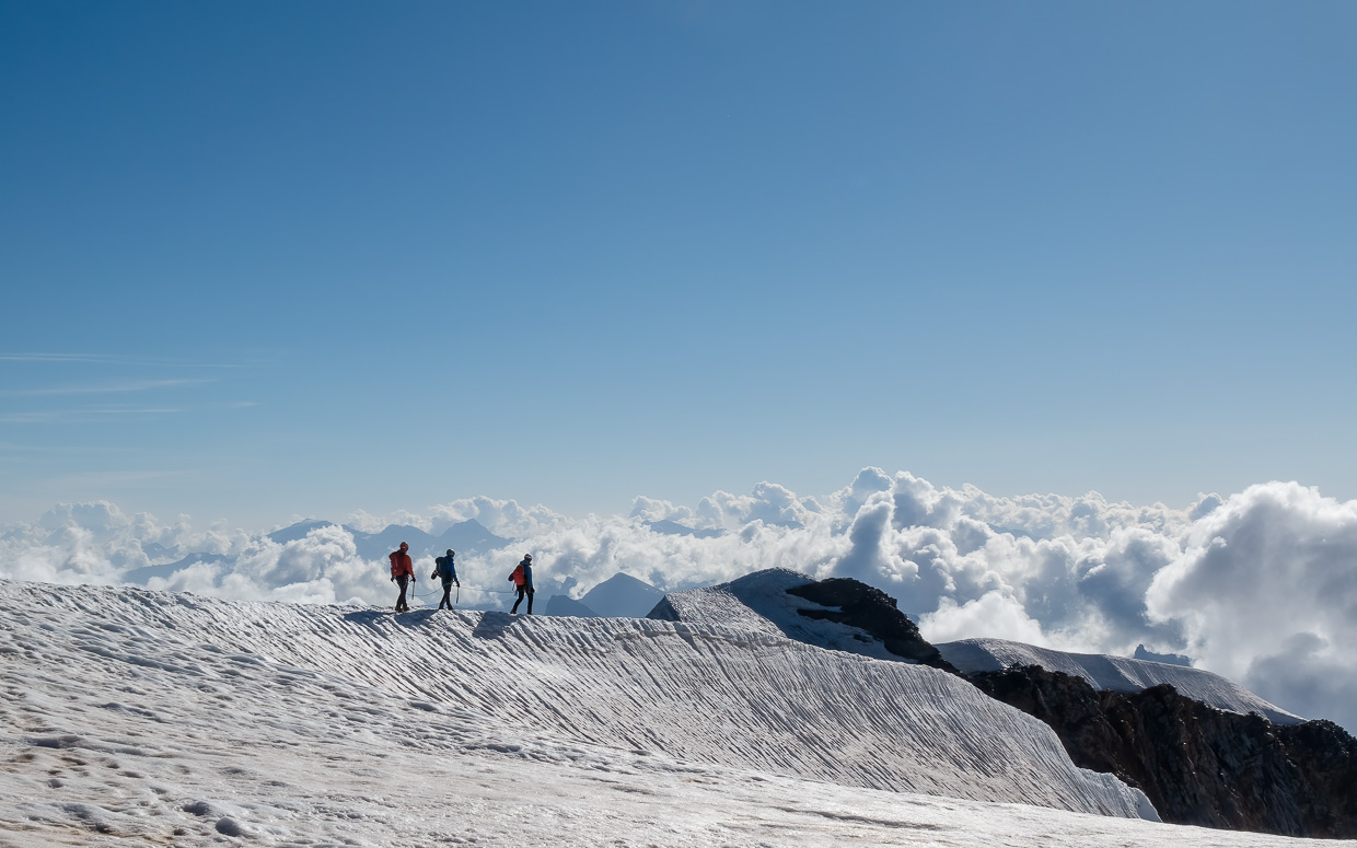 Auf dem Ostgipfel warten bereits drei Seilschaften, wir nutzen die Zeit, um uns nochmals zu stärken. Da man auf dem schmalen Grat nicht kreuzen kann, muss man Gegenverkehr abwarten, was hier der Fall ist. Als die aufsteigende Seilschaft den Gipfel erreicht, starten die anderen, am Schluss auch wir. Wieder ist es so ein schmaler Grat, der aber immer breiter, dafür auch immer steiler wird. Noch ein Schrund, dann sind wir wieder im „sicheren“ Gelände. Absturzgefahr gibt es nun keine mehr, dafür wieder Spaltengefahr. Wir knüpfen uns wieder zu einer Fünferseilschaft zusammen, Fabian, der Jüngste, geht voraus, ich zuhinterst. Souverän findet er den Weg, angeleitet durch Role.
