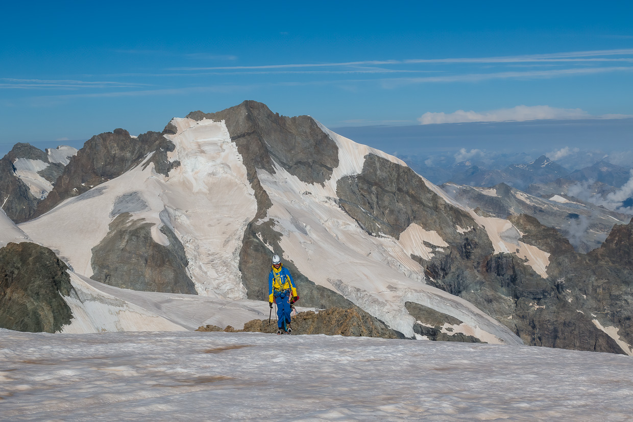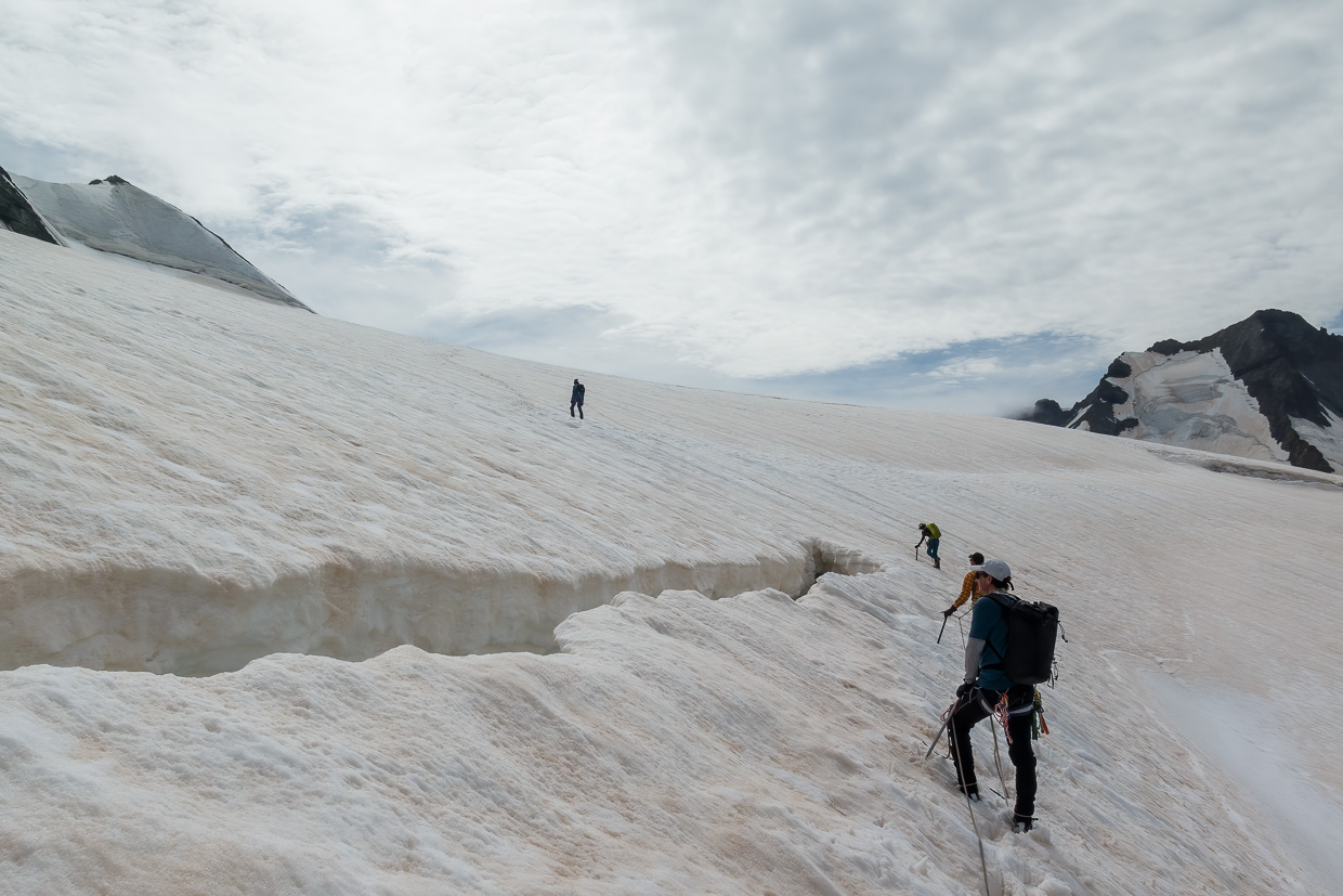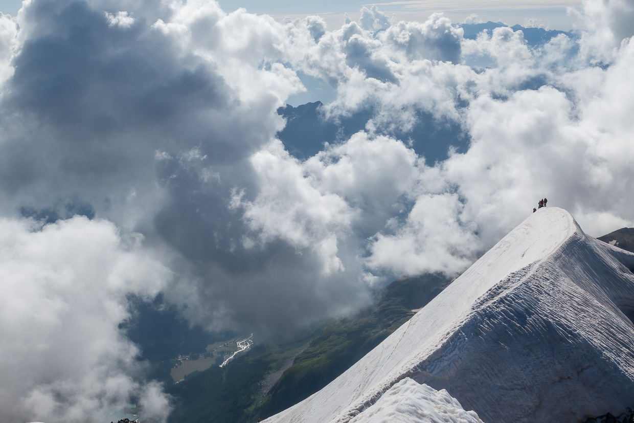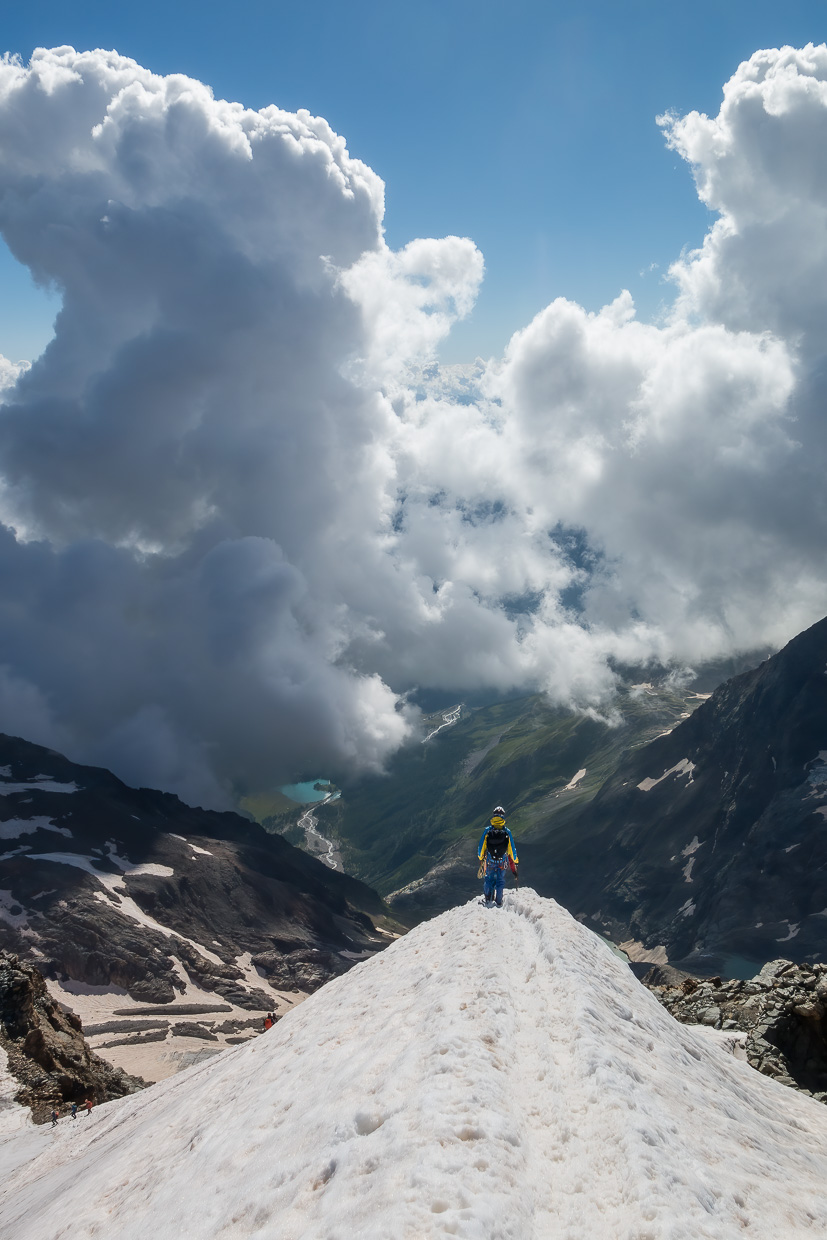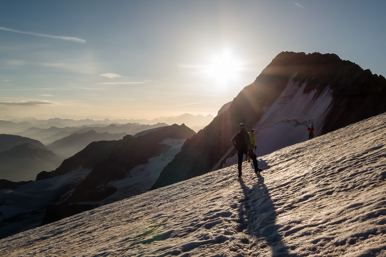 Auf dem Ostgipfel warten bereits drei Seilschaften, wir nutzen die Zeit, um uns nochmals zu stärken. Da man auf dem schmalen Grat nicht kreuzen kann, muss man Gegenverkehr abwarten, was hier der Fall ist. Als die aufsteigende Seilschaft den Gipfel erreicht, starten die anderen, am Schluss auch wir. Wieder ist es so ein schmaler Grat, der aber immer breiter, dafür auch immer steiler wird. Noch ein Schrund, dann sind wir wieder im „sicheren“ Gelände. Absturzgefahr gibt es nun keine mehr, dafür wieder Spaltengefahr. Wir knüpfen uns wieder zu einer Fünferseilschaft zusammen, Fabian, der Jüngste, geht voraus, ich zuhinterst. Souverän findet er den Weg, angeleitet durch Role.