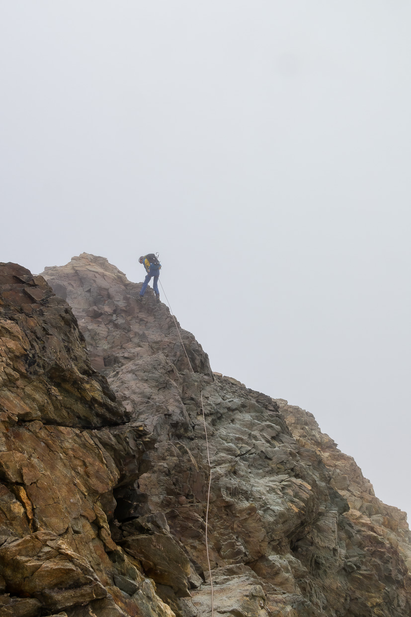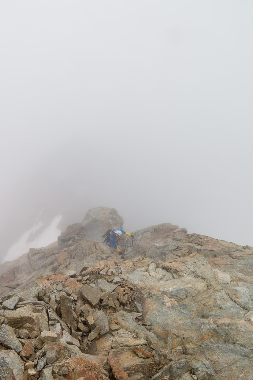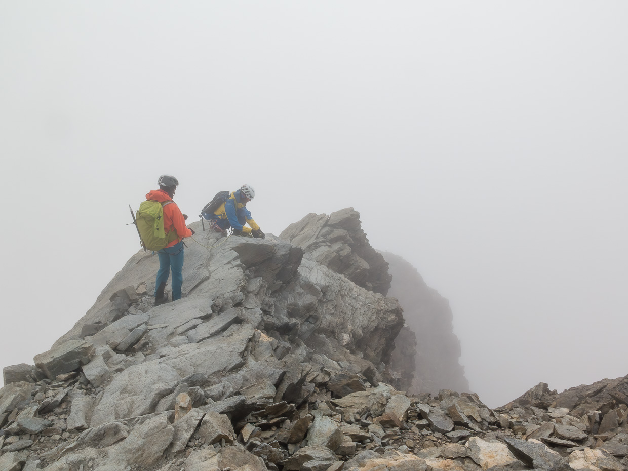Wir klettern weiter, queren einen kurzen Schneegrat, bevor es im Fels weitergeht. Der Gipfel kommt in Reichweite, aber wir sind immer noch von Nebel umhüllt. Nun gut Petrus, du hast noch ein wenig Zeit. Wir klettern weiter, sehen oben zwei Personen. Der Gipfel! Aber leider immer noch keine Sicht. So sind wir also auf dem höchsten Bündner und sehen nichts. Schade, aber kein Schaden. Da es doch recht kühl und windig ist, verweilen wir nicht lange und machen uns wieder an den Abstieg. Da öffnet sich doch tatsächlich kurz der Nebel und wir erblicken tausend Berge und das Rosegtal. Die Lücke schliesst sich bald wieder, wir klettern weiter, kommen an die Abseilstelle. Da wir ein eingespieltes Team sind, sind wir recht schnell mit abseilen. Die Seilschaften hinter uns müssen jedenfalls nicht lange warten wegen uns.