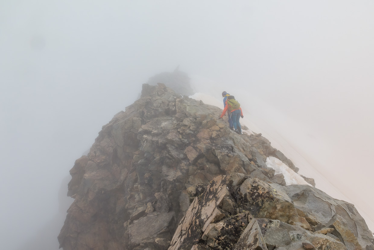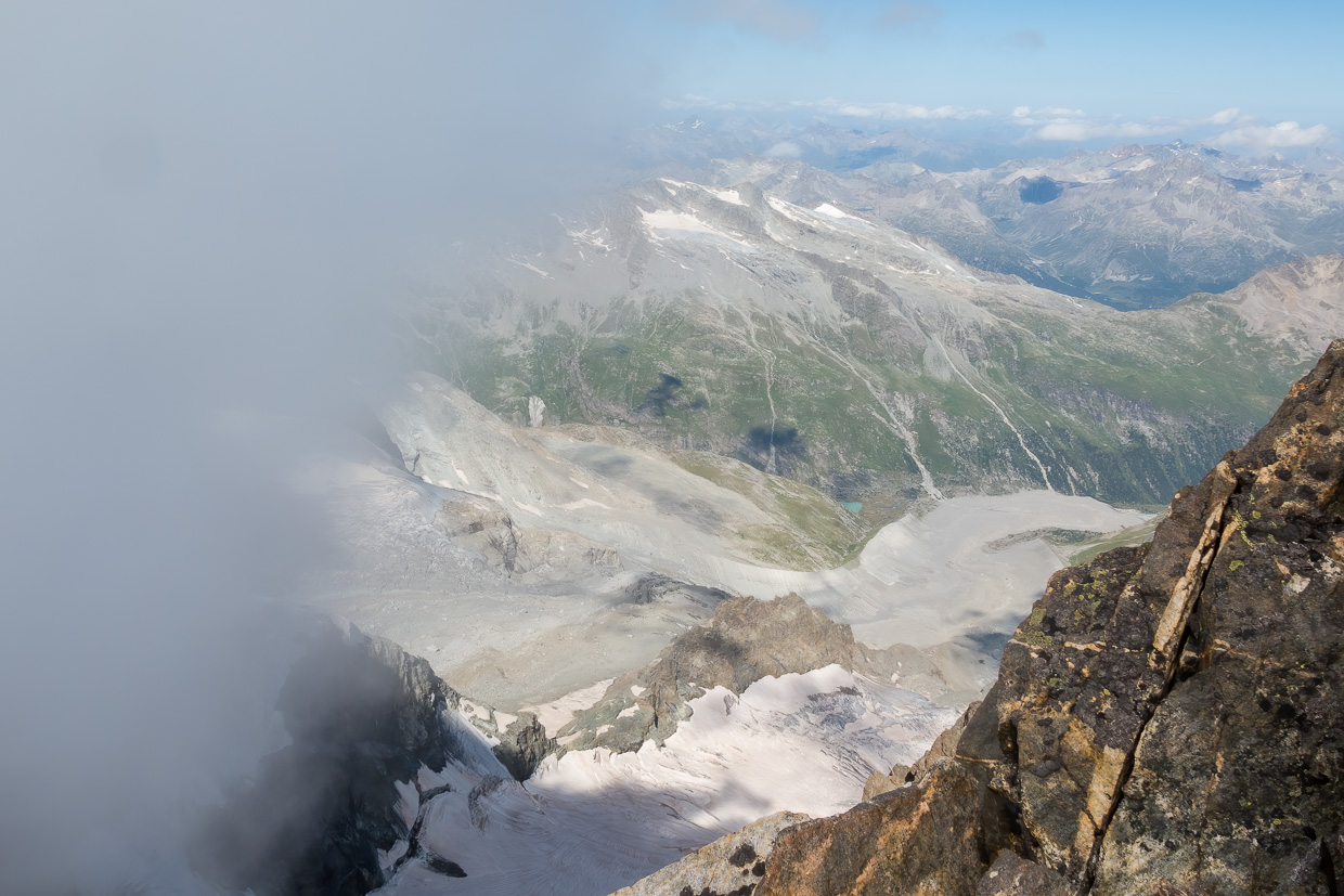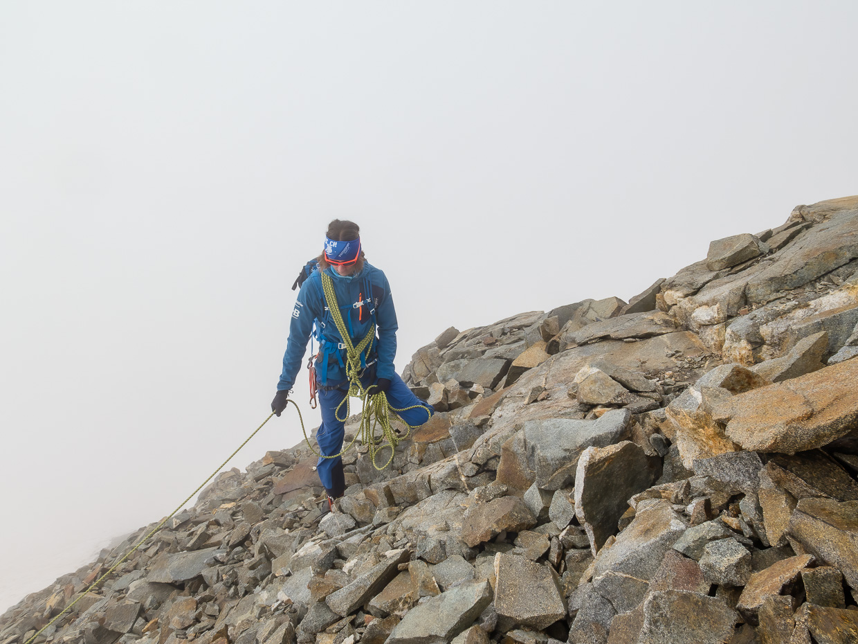 Wir klettern weiter, queren einen kurzen Schneegrat, bevor es im Fels weitergeht. Der Gipfel kommt in Reichweite, aber wir sind immer noch von Nebel umhüllt. Nun gut Petrus, du hast noch ein wenig Zeit. Wir klettern weiter, sehen oben zwei Personen. Der Gipfel! Aber leider immer noch keine Sicht. So sind wir also auf dem höchsten Bündner und sehen nichts. Schade, aber kein Schaden. Da es doch recht kühl und windig ist, verweilen wir nicht lange und machen uns wieder an den Abstieg. Da öffnet sich doch tatsächlich kurz der Nebel und wir erblicken tausend Berge und das Rosegtal. Die Lücke schliesst sich bald wieder, wir klettern weiter, kommen an die Abseilstelle. Da wir ein eingespieltes Team sind, sind wir recht schnell mit abseilen. Die Seilschaften hinter uns müssen jedenfalls nicht lange warten wegen uns.