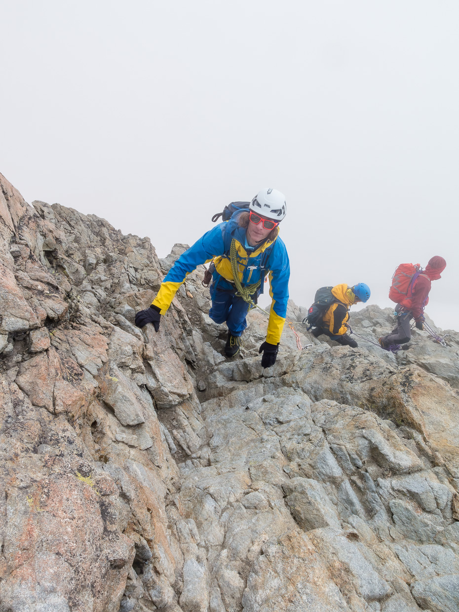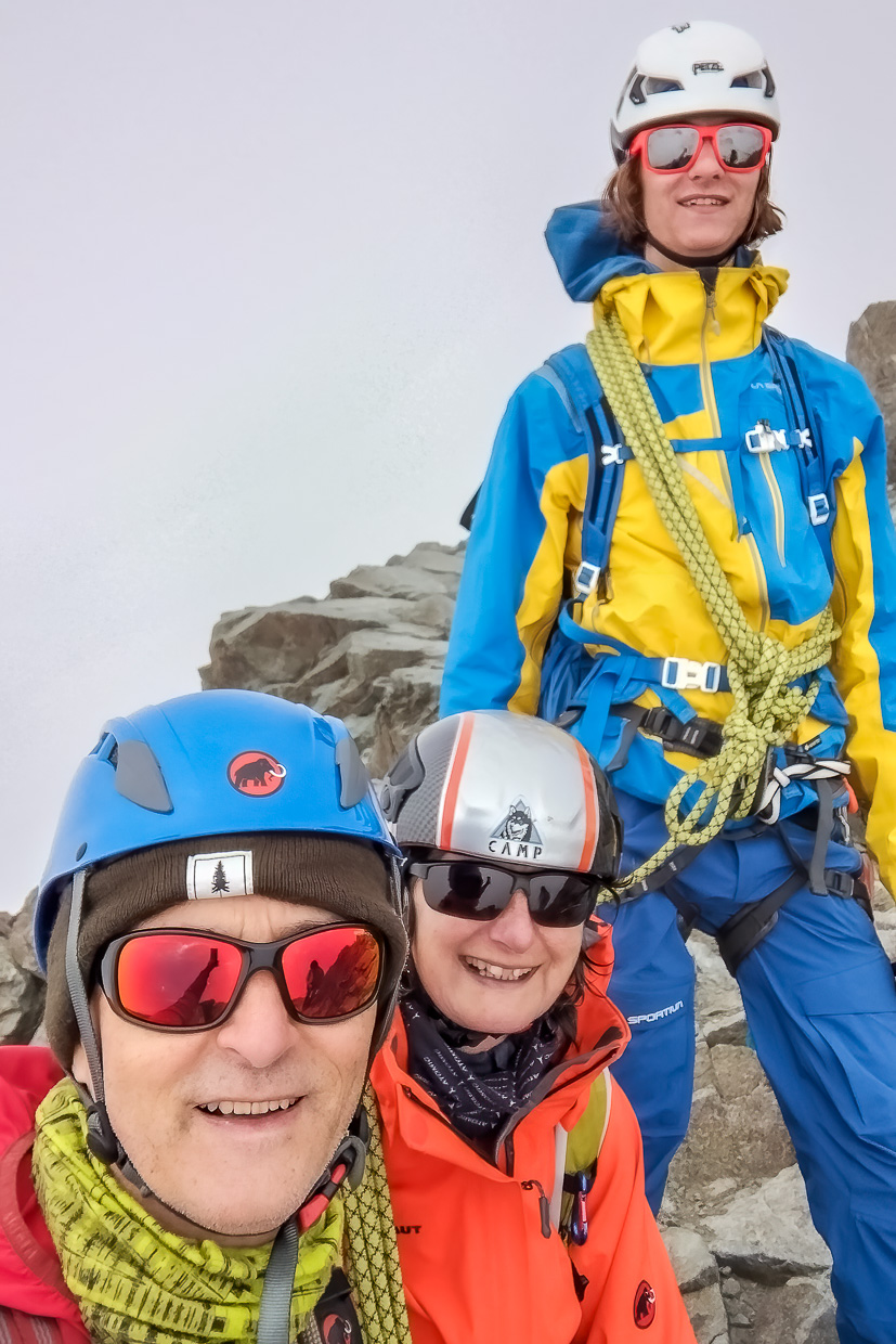 Es lässt vermuten, dass dies nun die schwerste und anstrengendste Tour ist. Das Gegenteil ist aber der Fall, es ist die kürzeste der drei Tage. Von der Hütte auf den Gipfel sind es nur gut 400 Höhenmeter. Wir stehen also nicht allzu früh auf und starten nach sieben Uhr. Ist es anfänglich noch relativ schön, zieht schon bald Nebel auf. Wir steigen auf dem Gletscher hoch zum Einstieg des Grates. In den bewährten Seilschaften beginnen wir die Kletterei. Wir kommen gut voran, gehen am kurzen Seil, manchmal auch am gestreckten mit Sicherung. Das Nadelöhr ist die Abseilstelle, wo uns nun verschiedene Seilschaften entgegenkommen. Aber wir sprechen uns ab und kommen problemlos aneinander vorbei. Oben begegnen wir den Leuten wieder, die wir tags zuvor am Fortezzagrat schon angetroffen haben. Es stellt sich heraus, dass sie Tschechen sind und für vier(!) Tage in die Schweiz gereist sind, um den Piz Bernina zu besteigen.