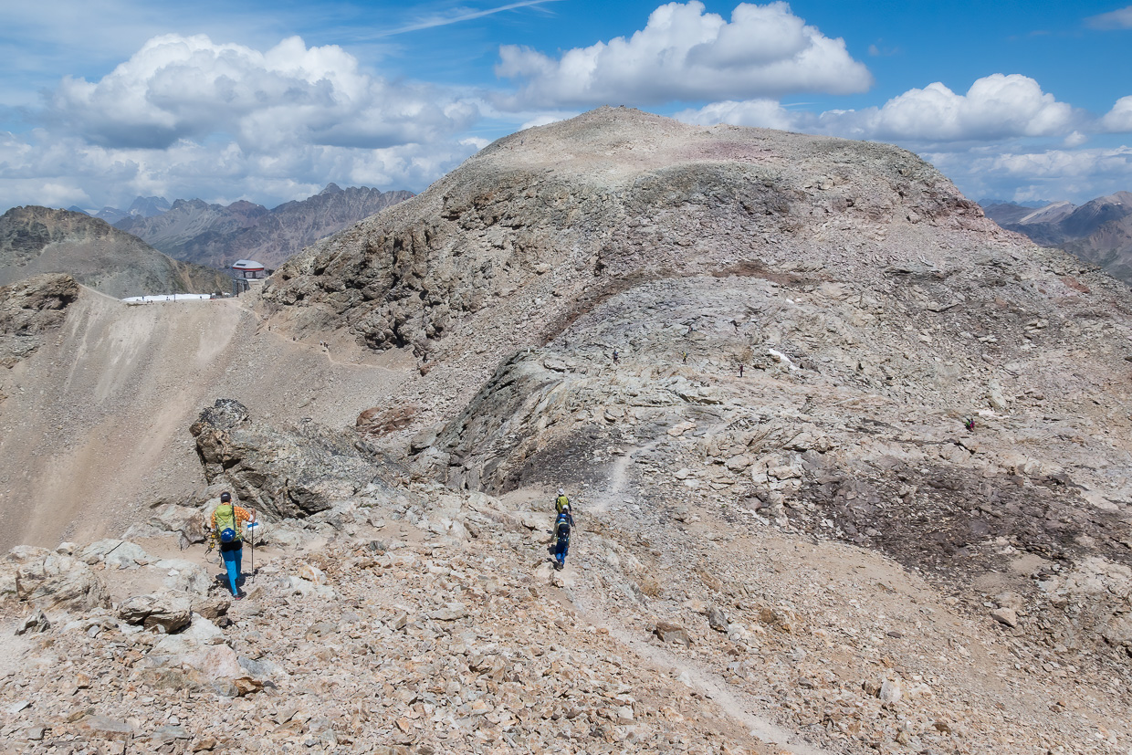 Genau jener Bergführer hat Role am Vorabend in der Hütte empfohlen, den Wandfuss des Piz Cambrena und damit den kürzesten Weg zu meiden wegen akuter Steinschlaggefahr. Offensichtlich wissen das die anderen Seilschaften nicht, sie queren unbekümmert die Gefahrenzone, einer legt gar eine Pinkelpause ein dort. Nun, wir sind weit weg davon und daher sicher. Nun ist der Gletscher wieder blank, wir steigen hoch zur Fuorcla Trovat. Dort entledigen wir uns sämtlicher Bergsteigerutensilien und verstauen sie im Rucksack. Wir wandern auf dem Bergweg am Piz Trovat vorbei zurück zur Bergstation der Diavolezza, wo die Tour endgültig endet. Drei Tage emotionaler Achterbahn liegen hinter uns, aber es war sensationell! Vielen Dank, Role, für die drei wunderbaren Tage!