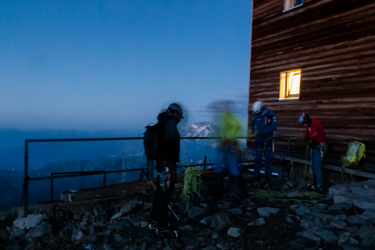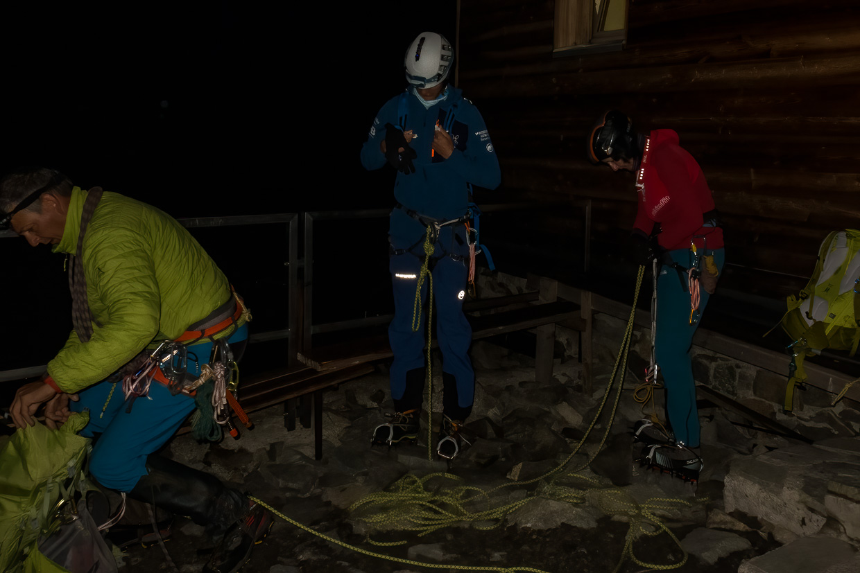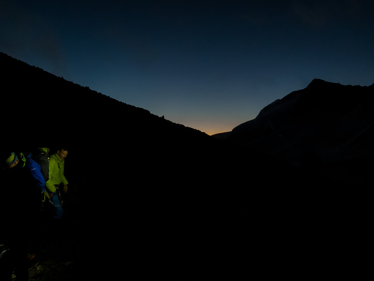Der dritte Tag ist Heimreisetag. Aber zuerst müssen wir wieder zum Fahrzeug gelangen. Dies geht entweder wie auf dem Hinweg über den Fortezzagrat. Oder dann oben drüber über den Piz Palü. Wir entscheiden am Morgen, je nach Wetter. Um Mitternacht ist es sternenklar, beste Voraussetzungen für den Palü! Drei Stunden später (ich bin fast die ganze Nach wach) herrscht stockdicker Nebel. Oh nein! Aber beim Frühstück um fünf Uhr sieht man die Sterne wieder, wir starten um sechs beim ersten Morgenlicht. Die Stirnlampen brauchen wir nur kurz, bald können wir sie ausschalten. Es geht nun den gleichen Weg zurück wie auf dem Hinweg.
