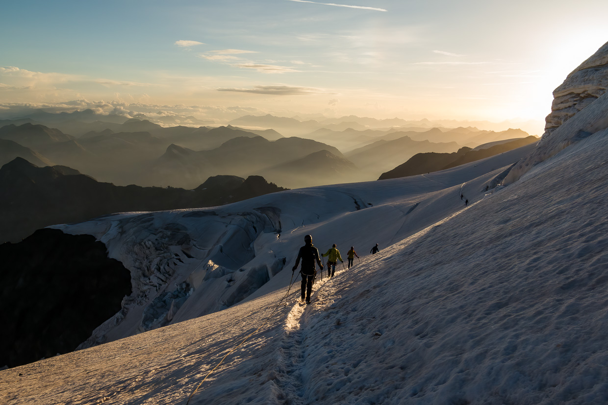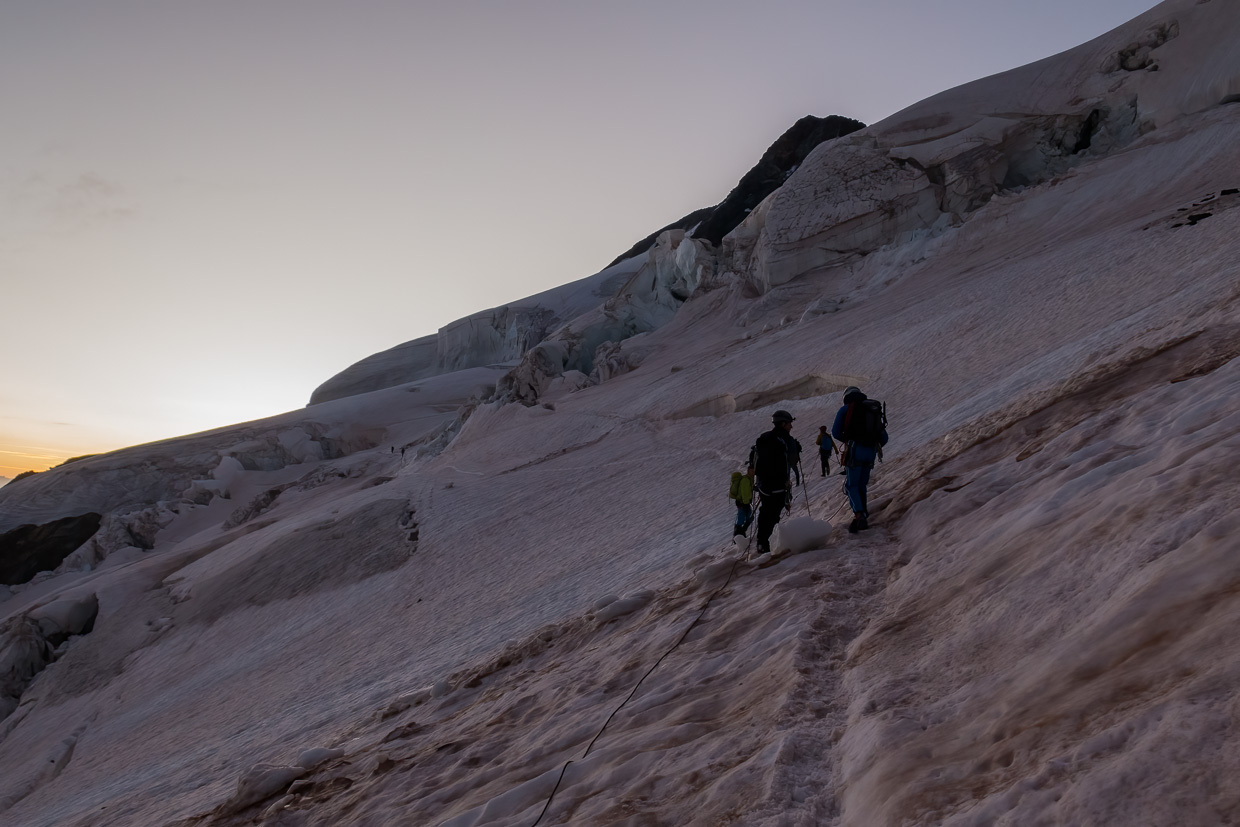 Man sieht nun die anderen Seilschaften, sie gehen in einer fast senkrechten Eiswand! Und durch diese müssen wir auch! Als wir aber dort sind, sieht die Sache völlig anders und viel entspannter aus. Wir müssen uns sicher konzentrieren und uns keinen Fehltritt erlauben, aber es ist nicht halb so wild. Nach dieser Steilstufe wird es flacher, so dass ich wieder hochschauen kann. Was sich mir da bietet, ist unglaublich: Goldig scheint der Morgenhimmel, die Berge sind in goldenes Licht getaucht. Wahnsinn! Fantastisch! Mich überkommen Emotionen. Schade, habe ich keine Zeit, in Ruhe zu fotografieren, es gäbe unglaubliche Bilder.
