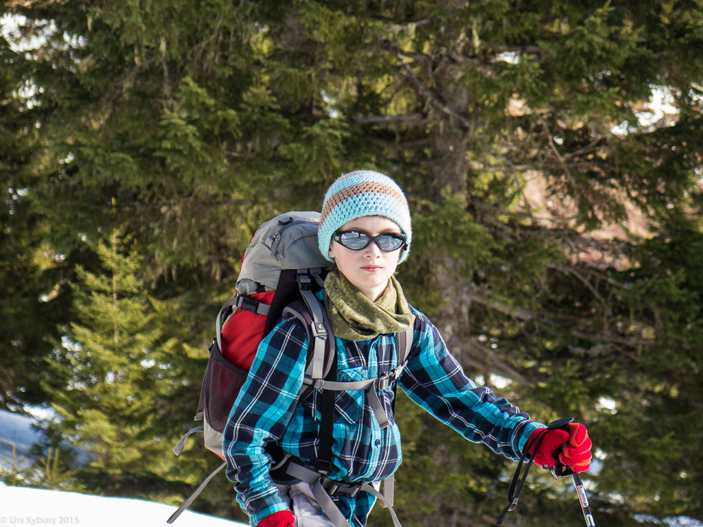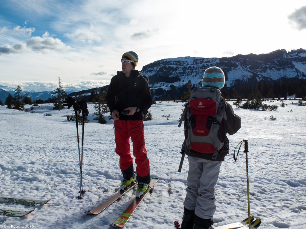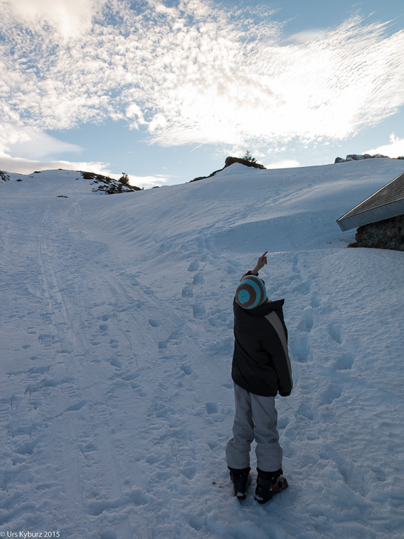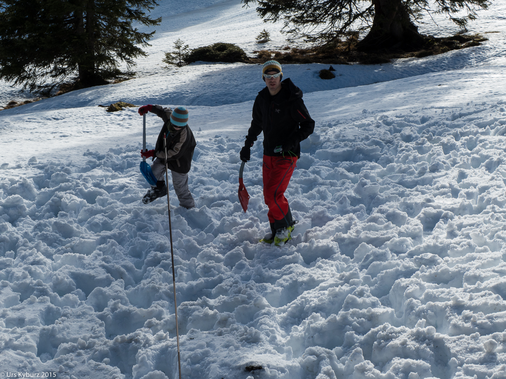Wir folgten dem Winterwanderweg. Es war warm, Wasser floss über den Weg, wir mussten Pfützen durchqueren. Auf dem gemütlichen Weg konnten wir ausgiebig plaudern. Darob vergassen wir beinahe die Pause, unsere Kinder erinnerten uns aber daran. Nach der Stärkung war nun eine Lektion LVS-Suchen angesagt. Jeder suchte mindestens einmal ein Gerät, einige versuchten es mit zwei vergrabenen Geräten.