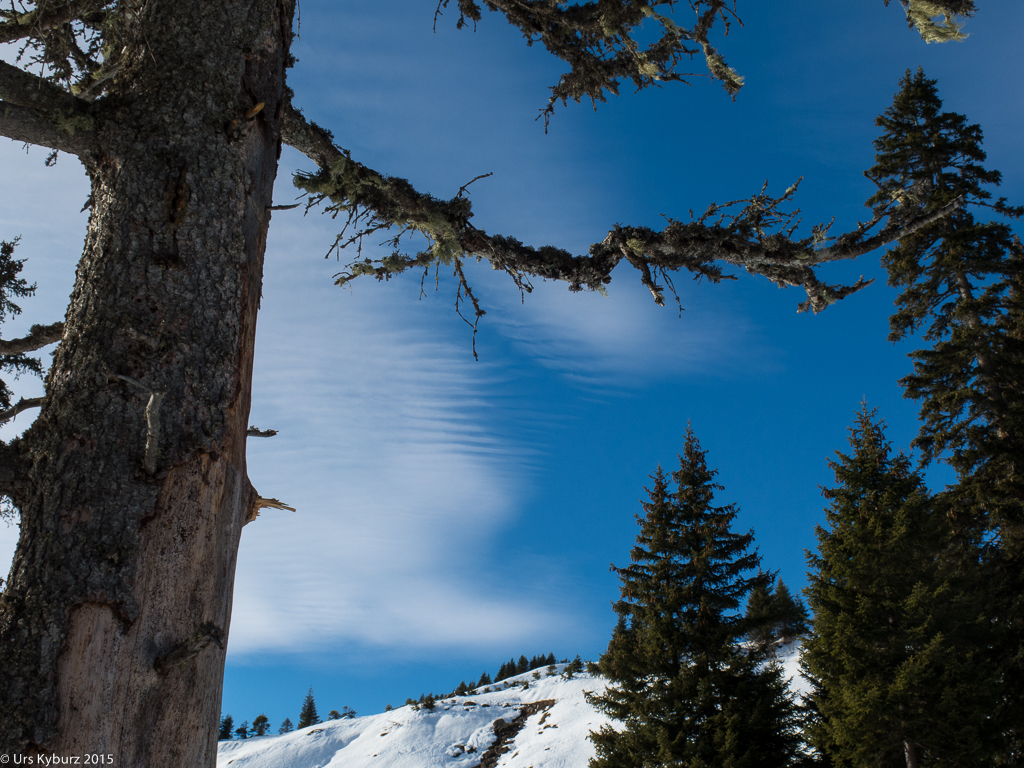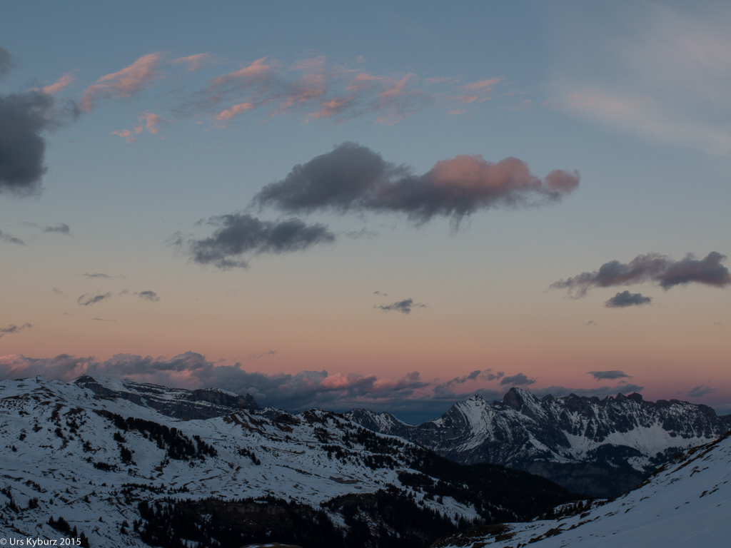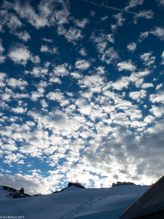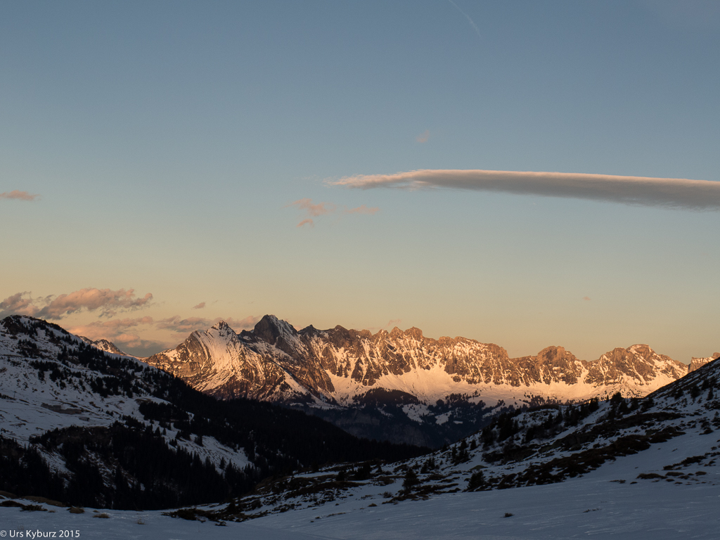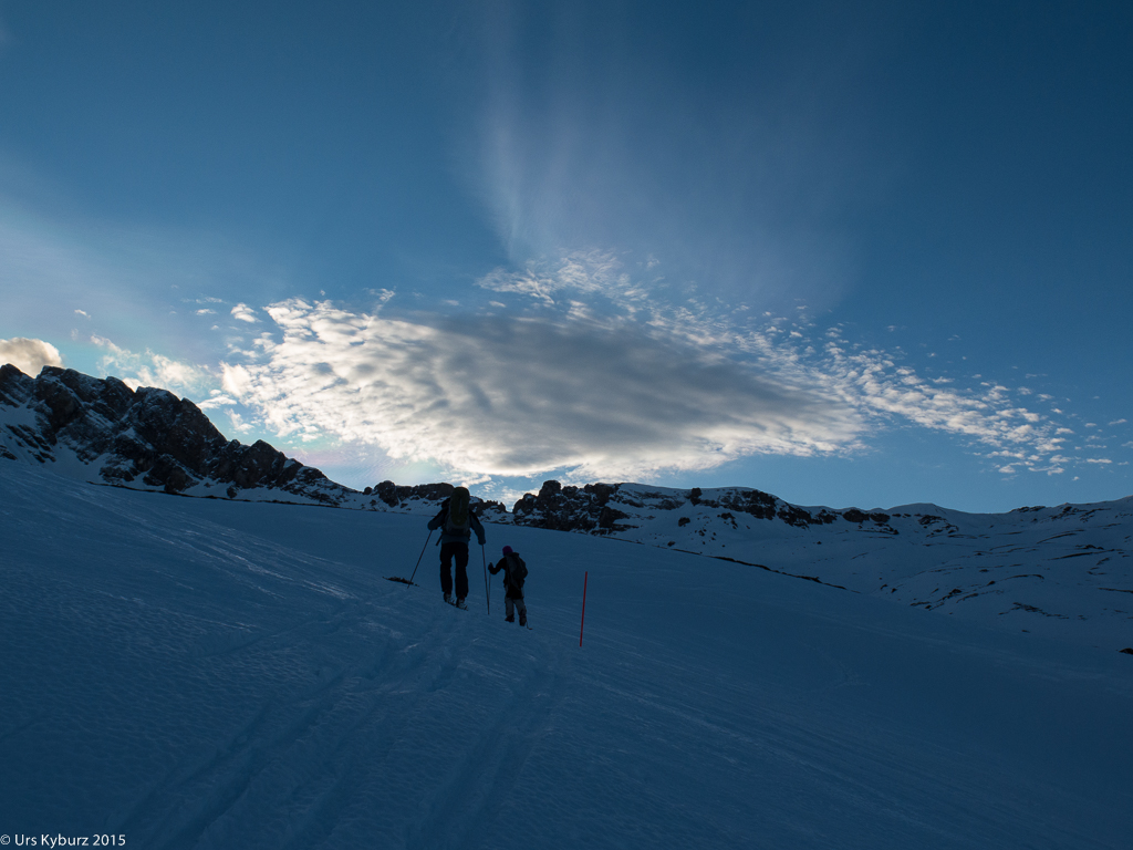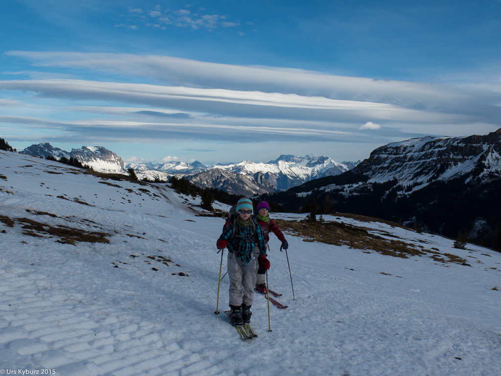 Weiter ging es nach Fursch, wo wir nochmals rasteten, bevor der Weg anstieg. Die Sonne war inzwischen verschwunden und beleuchtete nur noch die Berge der Alvierkette auf der anderen Talseite. Am Himmel bildeten sich immer neue Wolkenbilder, auch die irisierenden Wolken sahen wir, von denen es jede Menge Bilder auf dem Zwischennetz gab. Je höher wir stiegen, desto heftiger wurde Wind, bis er oben zum Sturm ausartete. Wir mussten immer wieder anhalten, um nicht umgeblasen zu werden. Trotzdem warfen Böen von über 100 km/h die Kinder ab und zu um. Ein Grund zum Jammern und Quengeln? Nein, nichts dergleichen. Stoisch ertrugen sie diese Naturgewalt.