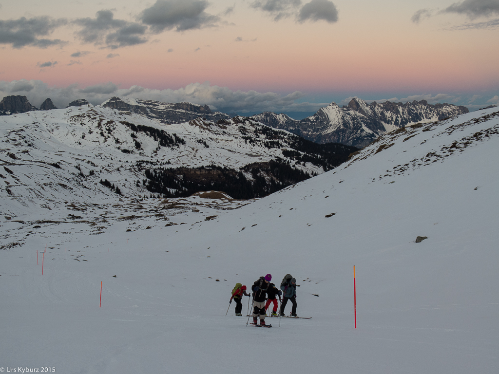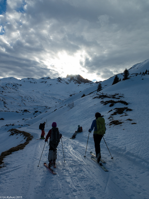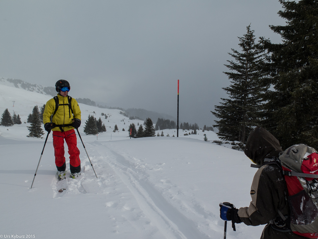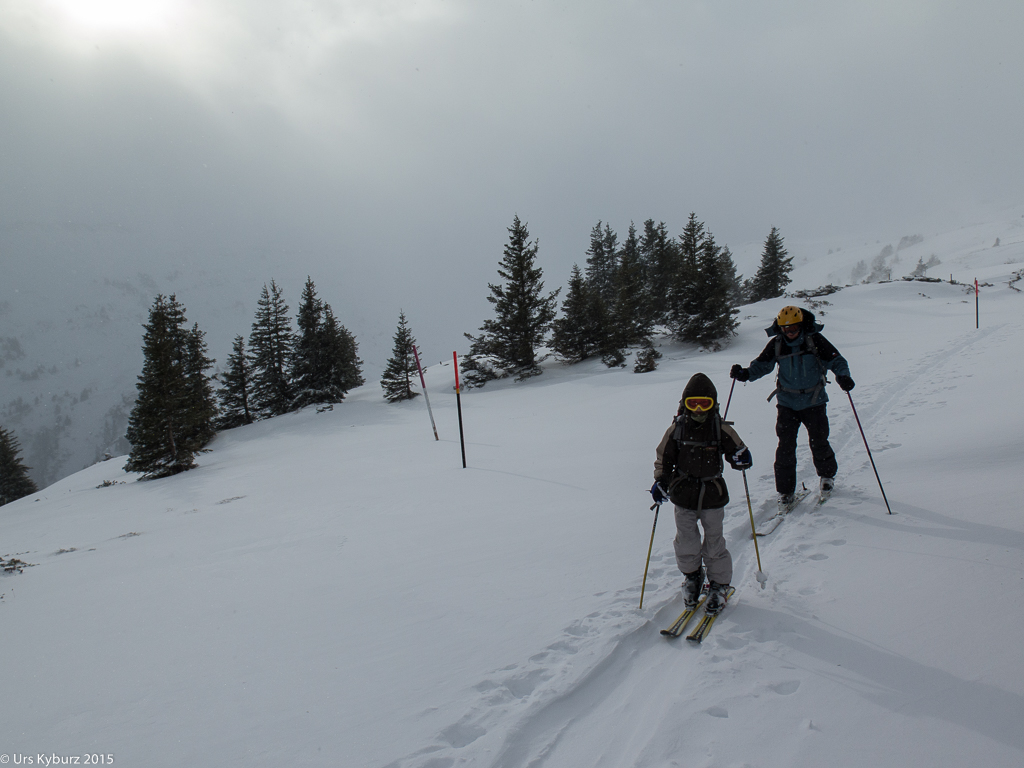 Trotz dem Wetter mussten wir mal wieder raus, dem am nächsten Tag sollten ja wieder die meisten zur Arbeit oder zur Schule. Gut eingepackt stellten wir uns dem Sturm entgegen. Es schneite waagrecht, die Skibrillen (jedenfalls meine) füllten sich allmählich mit Schnee. Aber noch selten war ich so froh um das Ding. Wir folgten wieder den Pfosten, auch um diese waren wir extrem froh, sonst hätten wir nach Kompass marschieren müssen (oder nach meinem GPS, was die Sache wieder etwas einfacher gemacht hätte). Endlich hatten wir das Auf und Ab hinter uns, wir konnten die Felle in einem windstillen Moment abziehen und im Rucksack verstauen. Die Abfahrt war besser als gedacht, Pulverschnee statt Bruchharst. In Fursch kehrten wir in einem Beizli ein und genehmigten uns etwas Warmes. Nach dieser Stärkung lag noch der Gegenanstieg hoch zum Sessellift vor uns. Das ging nun aber einfacher, hier unten blies der Wind nicht mehr so stark. Mit dem Lift erreichten wir doch noch den Maschgenkamm, wo wir gleich wieder das Restaurant ansteuerten. Die Schlussabfahrt zur Tannenbodenalp war gar nicht übel, hatte es doch jetzt ordentlich Pulverschnee auf den Eistafeln.