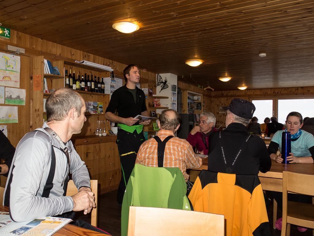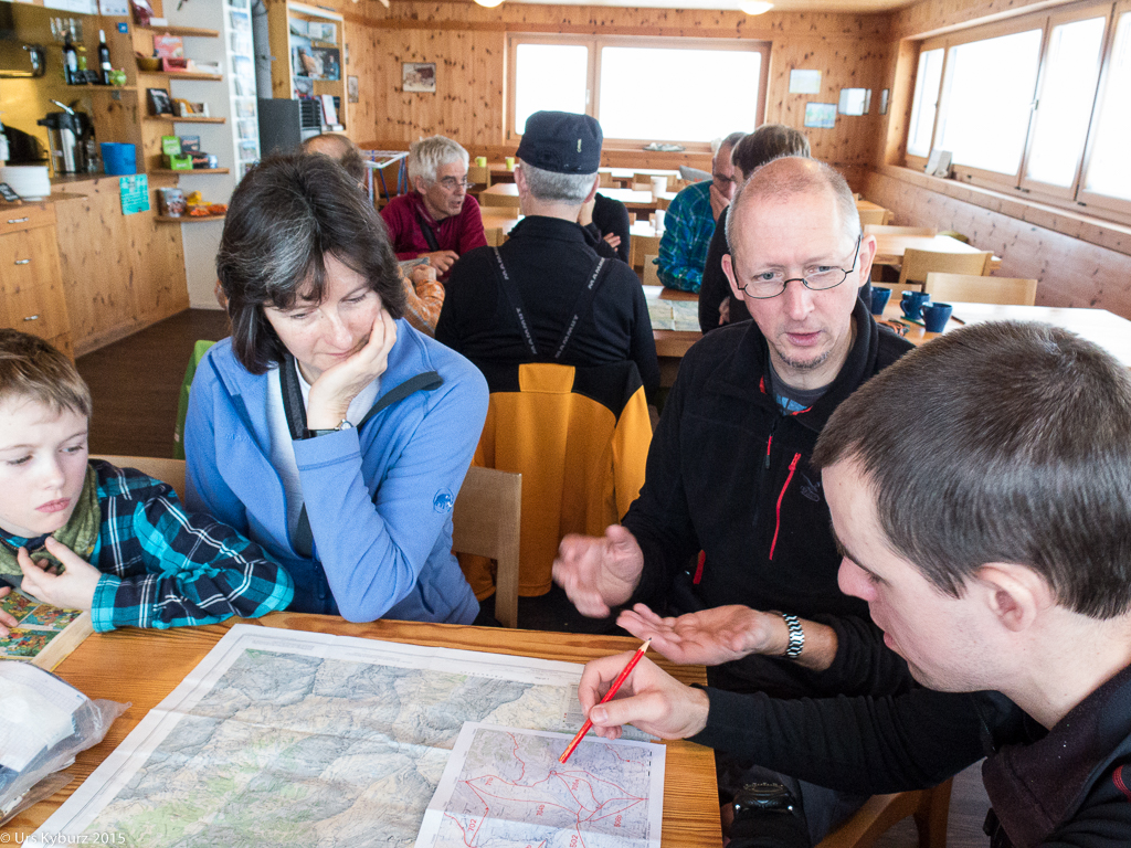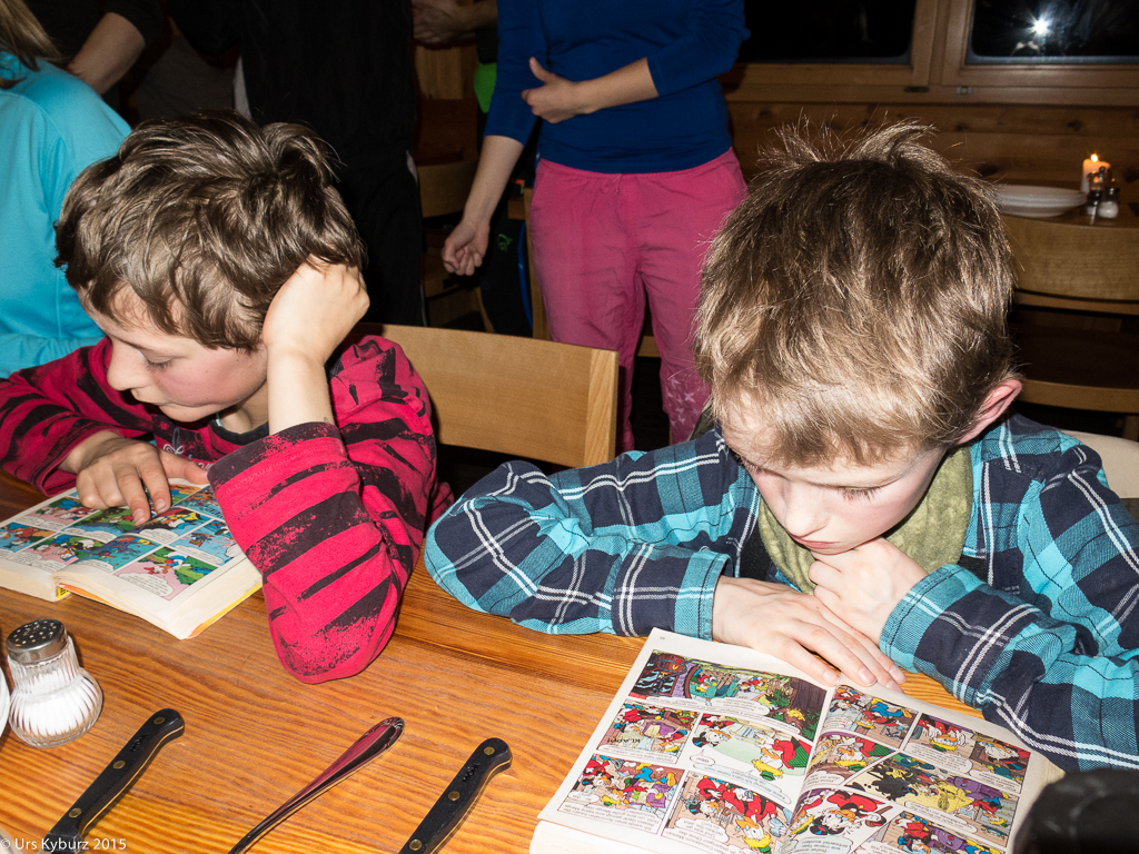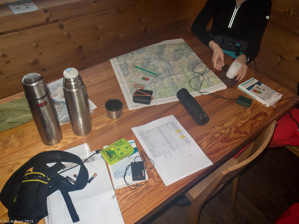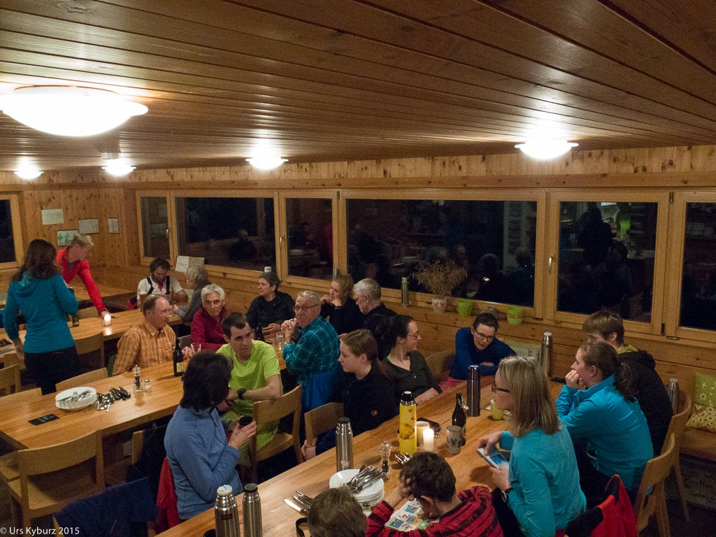 Es wurde immer dunkler, die Hütte war noch nicht in Sicht. Zum Glück markierten neonfarbene Pfosten den Weg. Immer, wenn wir dachten, nach der nächsten Kuppe kommt die Hütte, kam bloss die nächste Kuppe. Hier drängte sich eigentlich die berühmt-berüchtigte Kinderfrage „Ist es noch weit?“ auf, aber nein, einfach weitermarschieren. Endlich leuchteten die Fenster der Spitzmeilenhütte in die Dunkelheit. Gutgelaunt betraten wir die Hütte und freuten uns aufs Essen. Eigentlich wäre noch ein Theorieblock angesagt gewesen, aber eine Gruppe fehlte noch. Kurz vor dem Nachtessen traf sie ein.