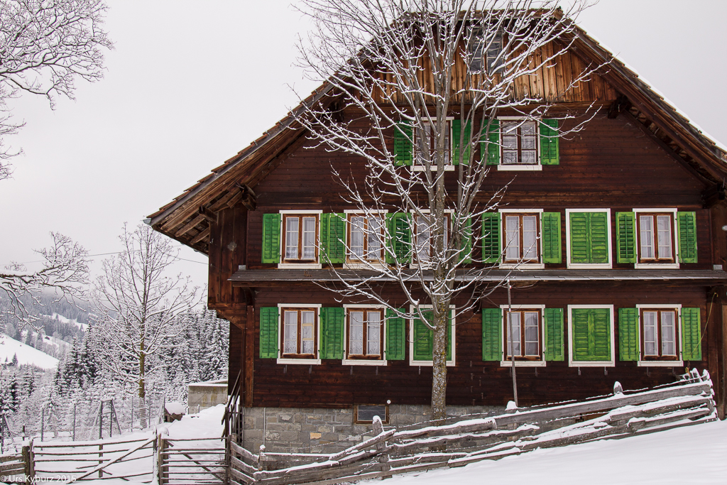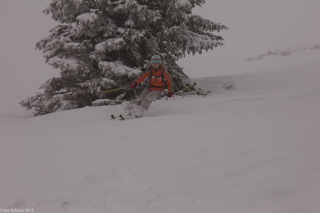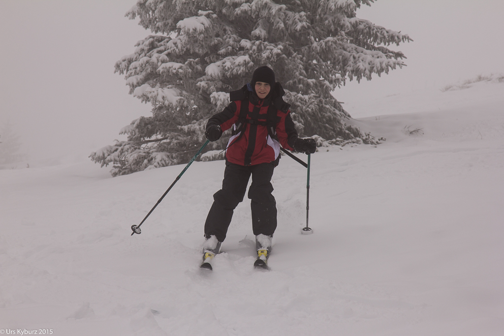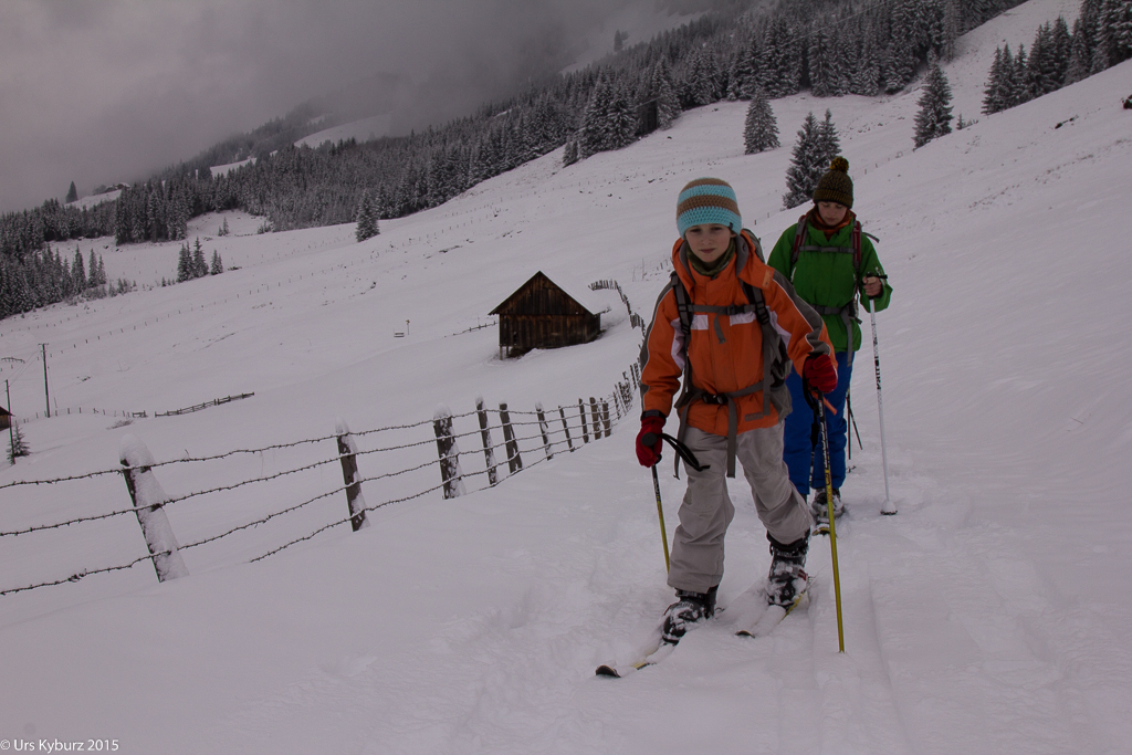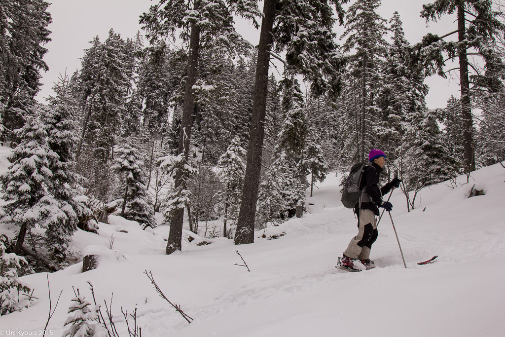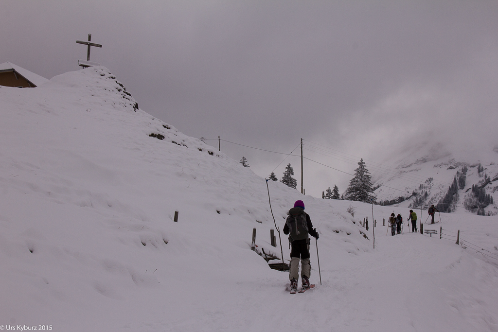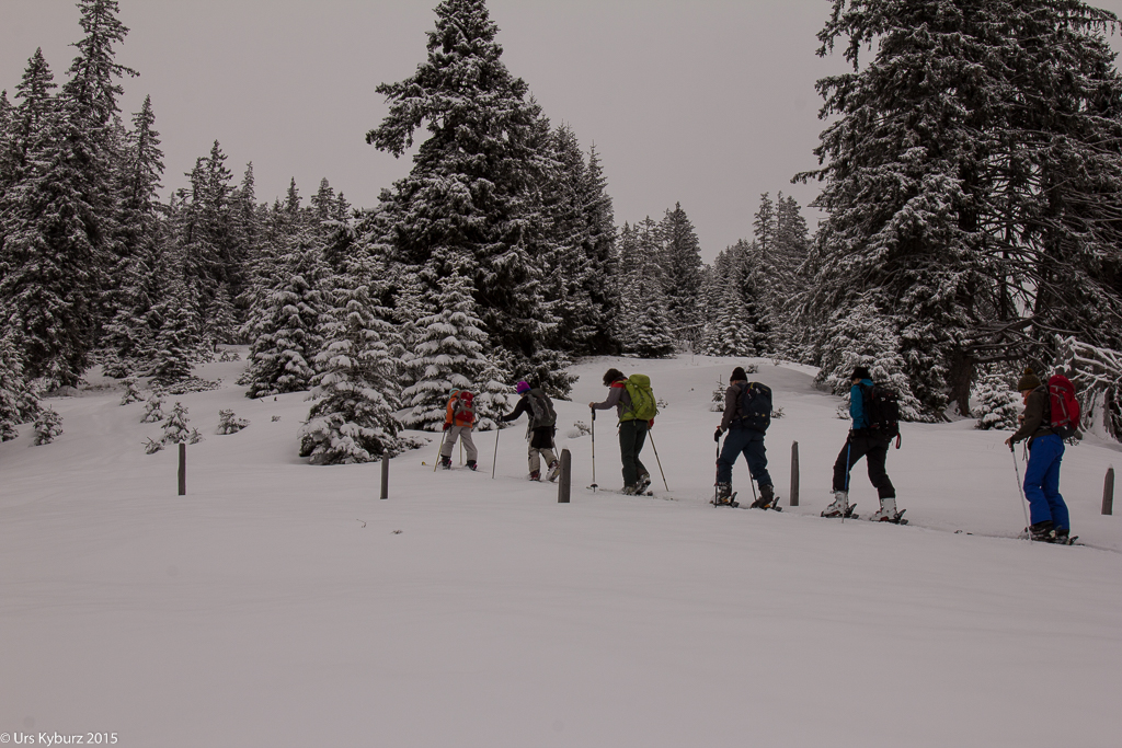 Elf Personen starteten in Sörenberg, zwei Familien, ein pensioniertes Ehepaar und zwei junge Damen. Für einmal waren die Frauen sogar in der Mehrzahl. Wir starteten am Dorfrand, stiegen hoch an einem Bauernhof vorbei und weiter auf einem Schneeschuhtrail. Das Wetter war, na ja, zumindest trocken. Hochnebel verdeckte die Sonne, was wiederum gut war für die 15 Zentimeter Pulverschnee, die in der vorangegangenen Nacht fielen, der Schnee blieb dadurch locker. Fabian litt an einer Erkältung und war entsprechend nicht fit. Er verlor schon bald den Anschluss. Meine Frau und ich gingen am Schluss, die Gruppe führte, ja wer? Unser Jüngster! In gleichmässigem Schritt spurte er durch den Neuschnee, als würde er das schon seit Jahren machen. Bei der ersten Pause holten wir wieder auf, verloren jedoch schon bald wieder den Kontakt.