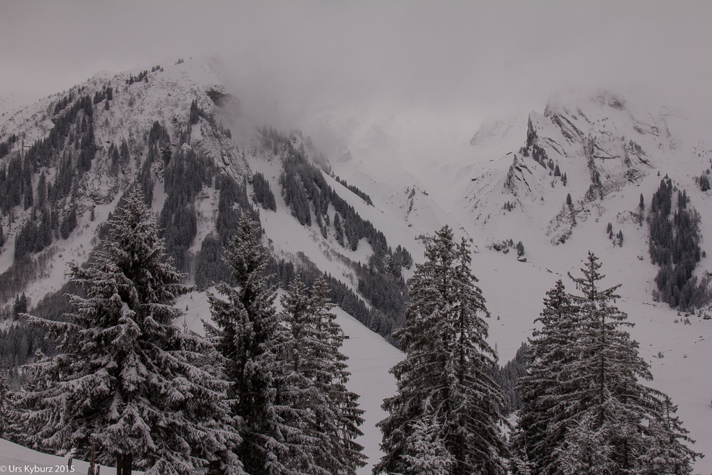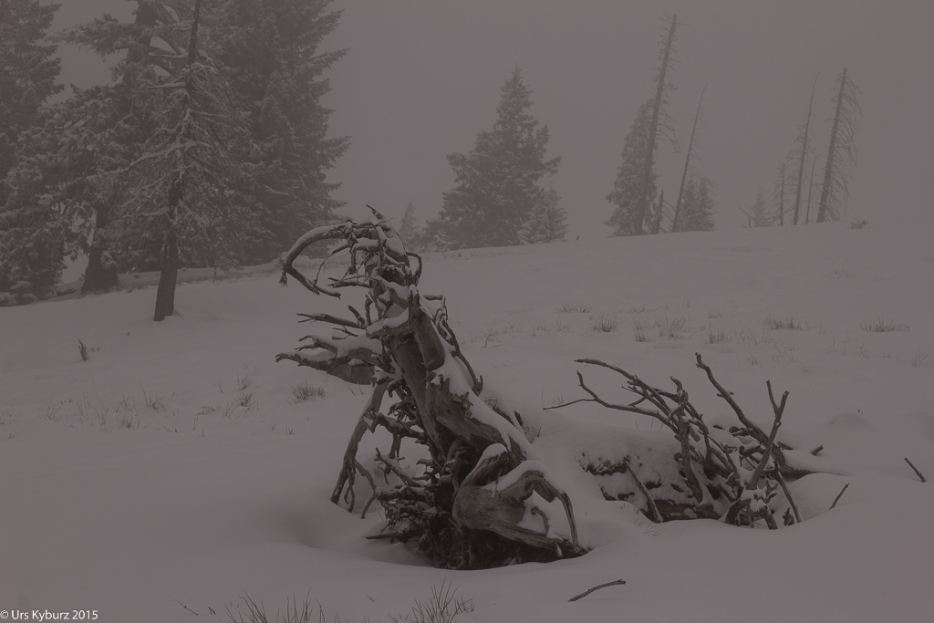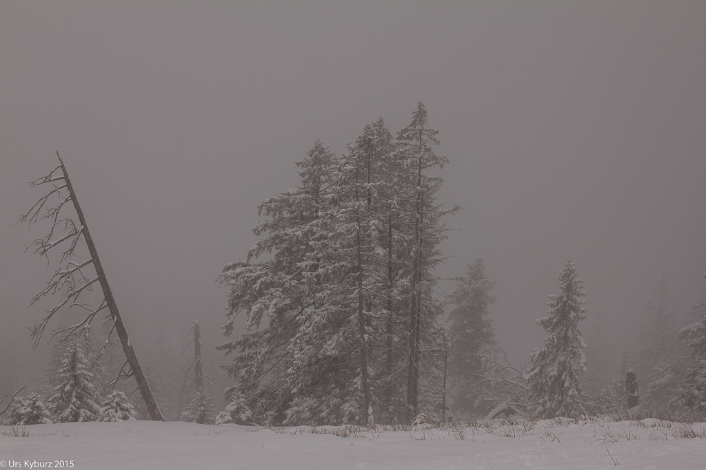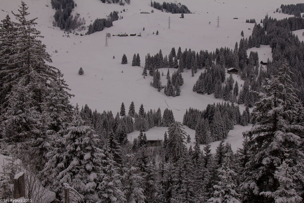 Bald verliessen wir die Strasse, gewannen über Weiden an Höhe. Lockerer Fichtenwald löste die Weiden ab. Fabian und ich waren hinten ab, aber die Landschaft war so bezaubernd schön, dass uns das egal war. Frisch verschneit waren die Tannen, es sah aus wie in einem Märchenwald. Wir hätten uns nicht gewundert, wenn plötzlich irgendwo ein Kobold oder eine Elfe aufgetaucht wäre.