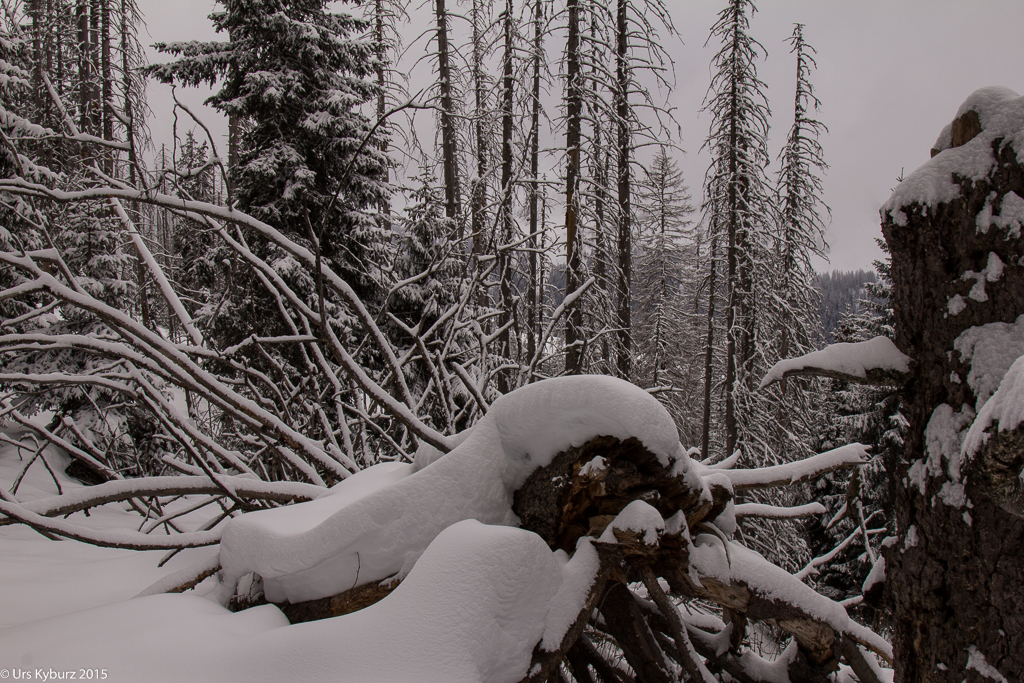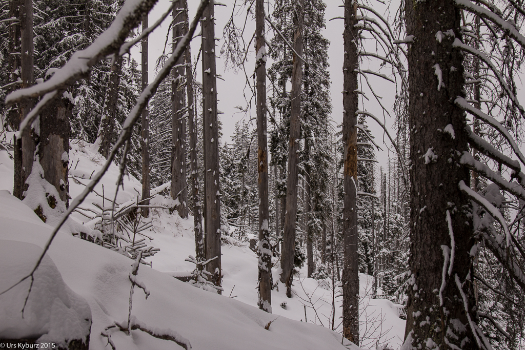 Der Wald wurde immer wundervoller. Tote Fichten ragten in den Himmel oder lagen am Boden, der Baumbestand war locker, so dass wir meist eine gute Route fanden. Schade, sahen wir keine Birkhühner, ich denke, das wäre ein Gebiet, wo man welche entdecken könnte.