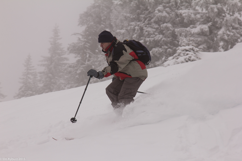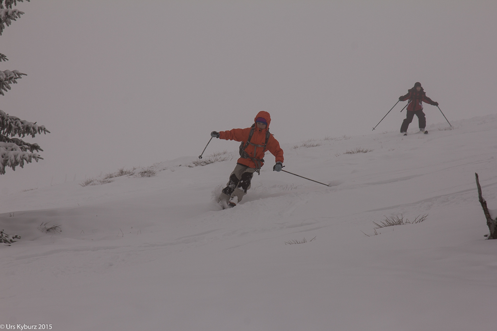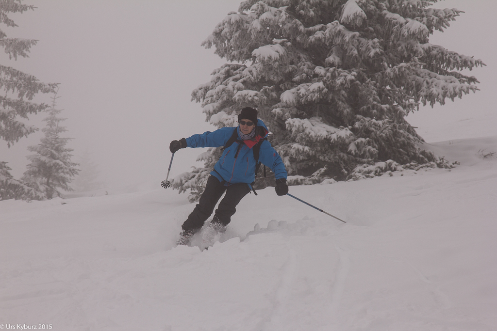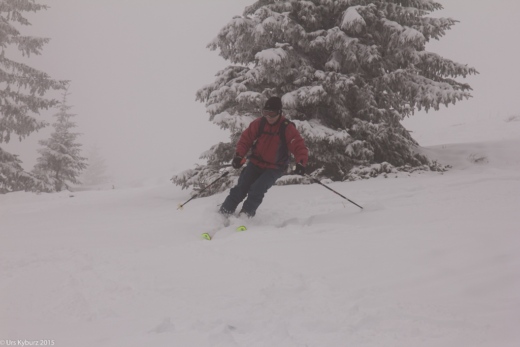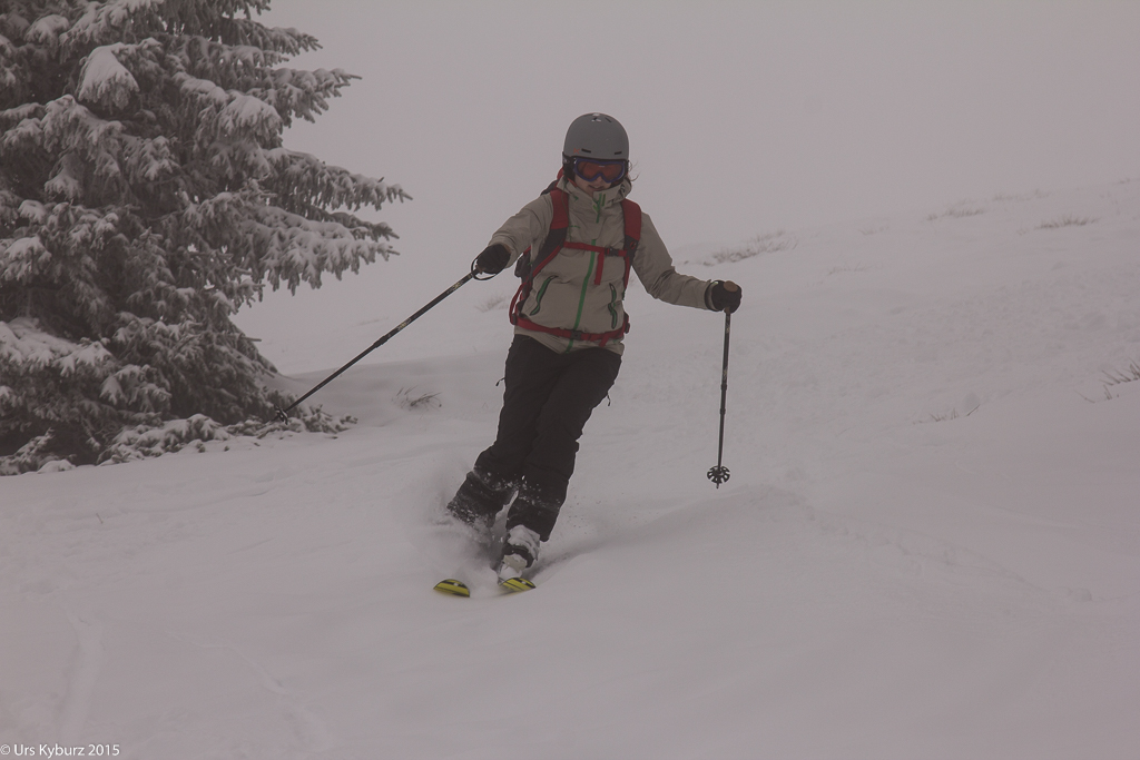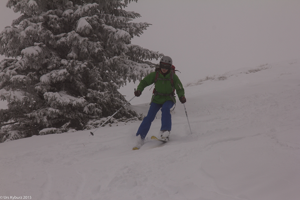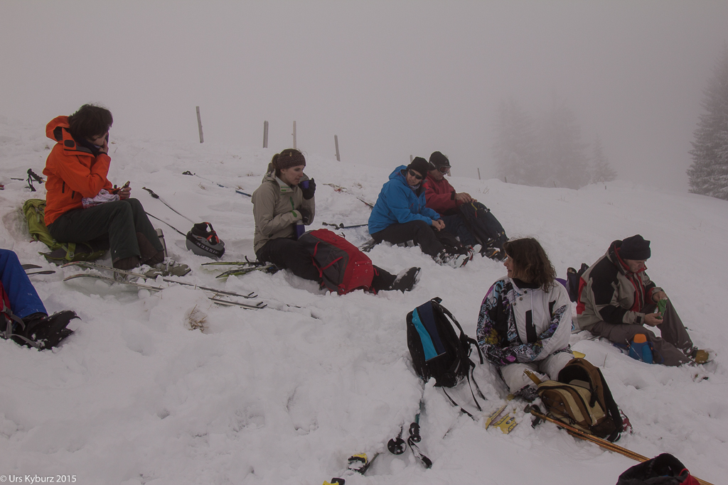 Der Nebel wurde immer dichter, aber nie so dicht, dass wir uns nicht mehr orientieren konnten. Der Grat war nun nicht mehr weit. Leider war uns die Sicht auf die andere Seite verwehrt. Im Sommer könnte man zur Nünalp wandern und weiter über die ganze Gratkette bis zum Glaubenbergpass. Wir verpflegten uns jedoch erst mal, bevor wir uns bereit machten zur Abfahrt. Es war immer noch neblig, aber ungefähr sichtig. Der Schnee war wohl in den vorangegangenen Wochen ziemlich verfahren worden, jedenfalls spürte man unter dem Neuschnee die Gleise der Vorgänger resp. -fahrer. Trotzdem, es war ideal, so dass alle ohne grössere Probleme fahren konnten.