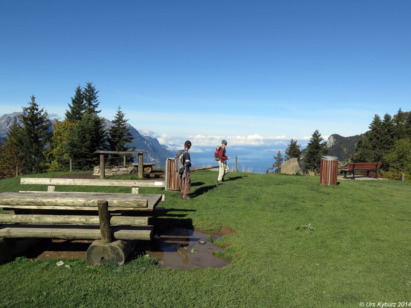 Nach dem Abstecher stiegen wir weiter von Tafel zu Tafel hoch bis zur elften und letzten. Der Pfad endete auf einem grossen Picknickplatz mit Tischen, Bänken und einer Brätelstelle. Und wir genossen eine grandiose Aussicht auf das Rhonetal und den Genfersee, der sich irgendwann im Dunst verlor. Wir waren mutterseelenalleine und genossen die Ruhe, an Wochenenden ist dieser Platz sicher jeweils überfüllt und lärmig.