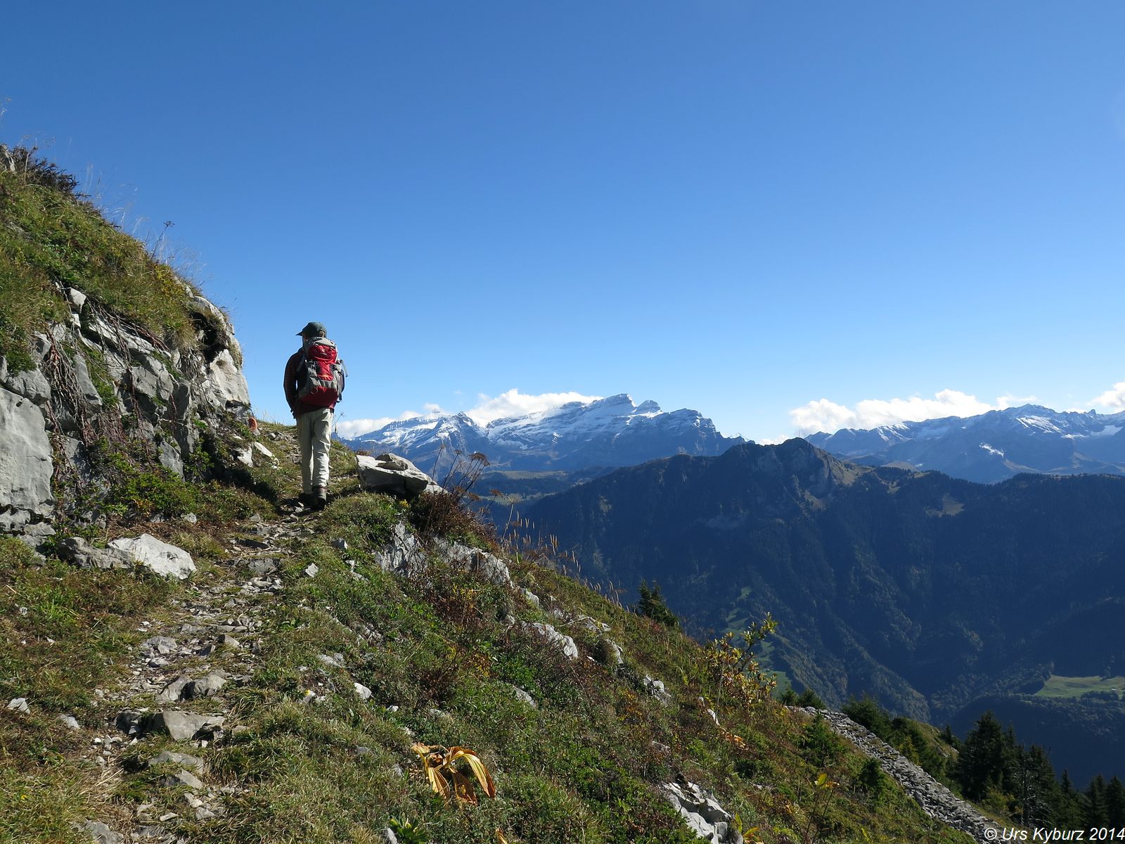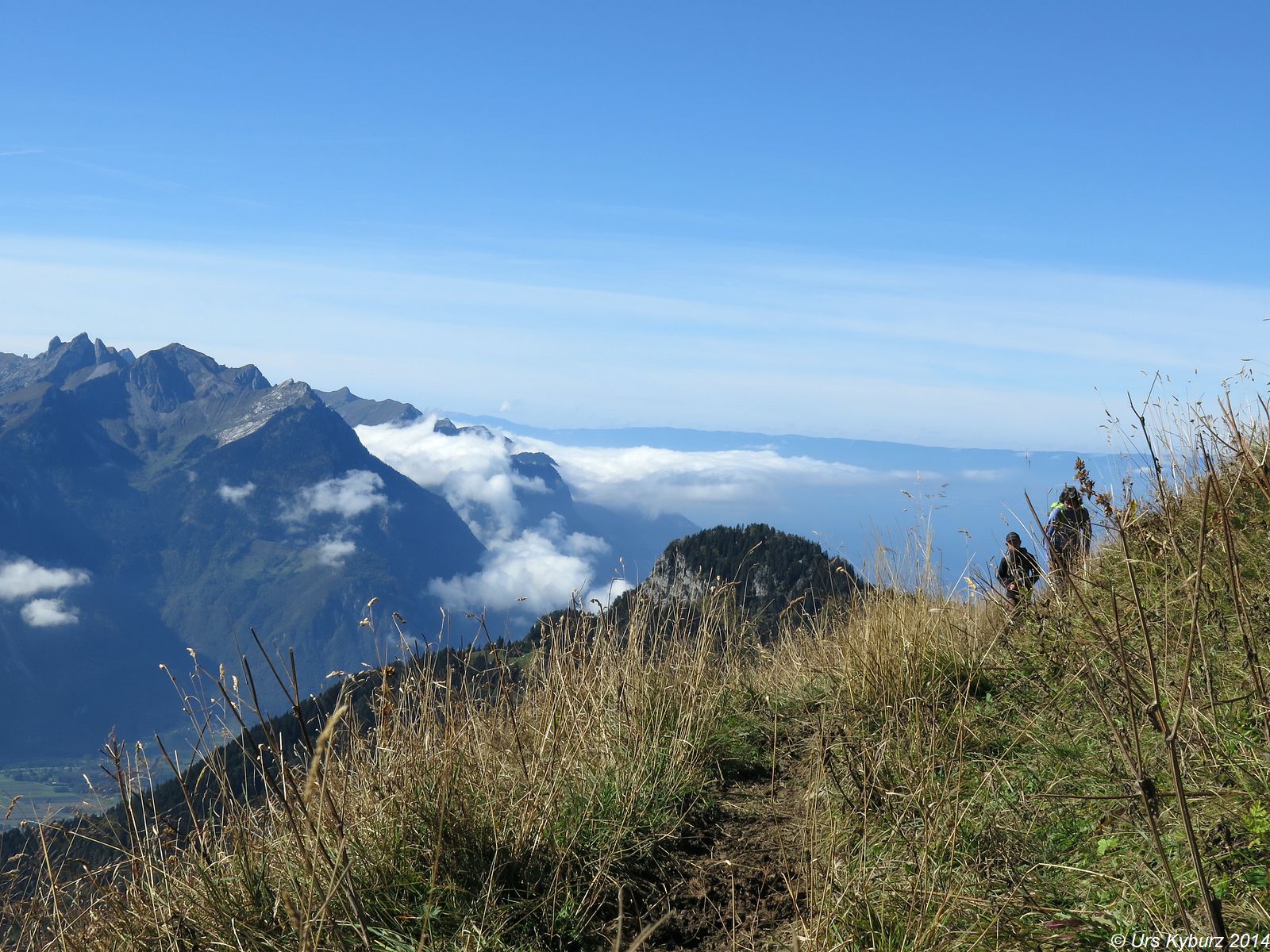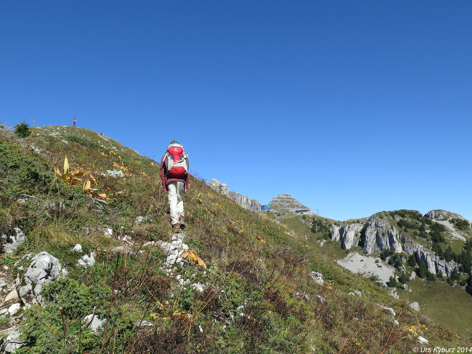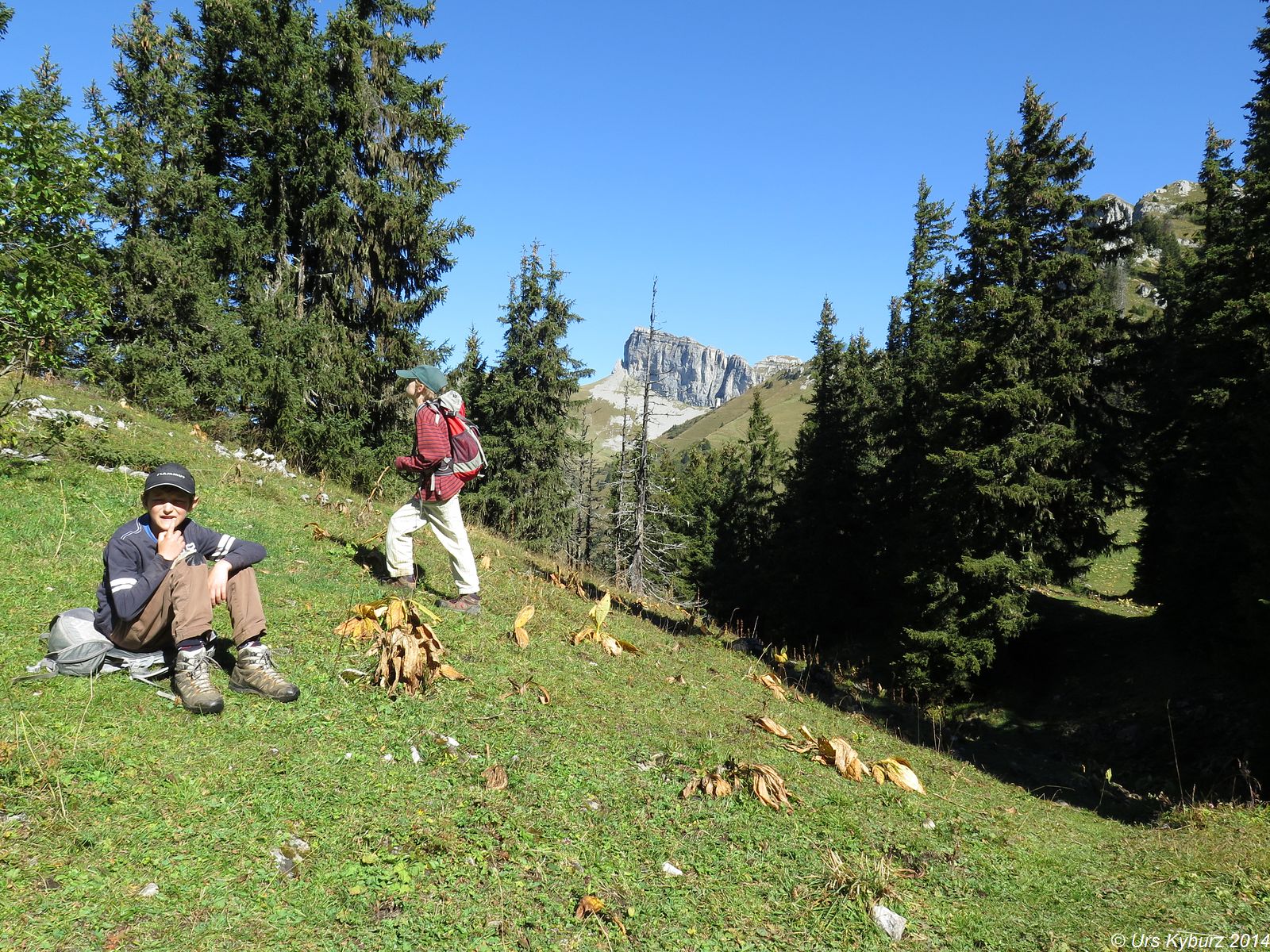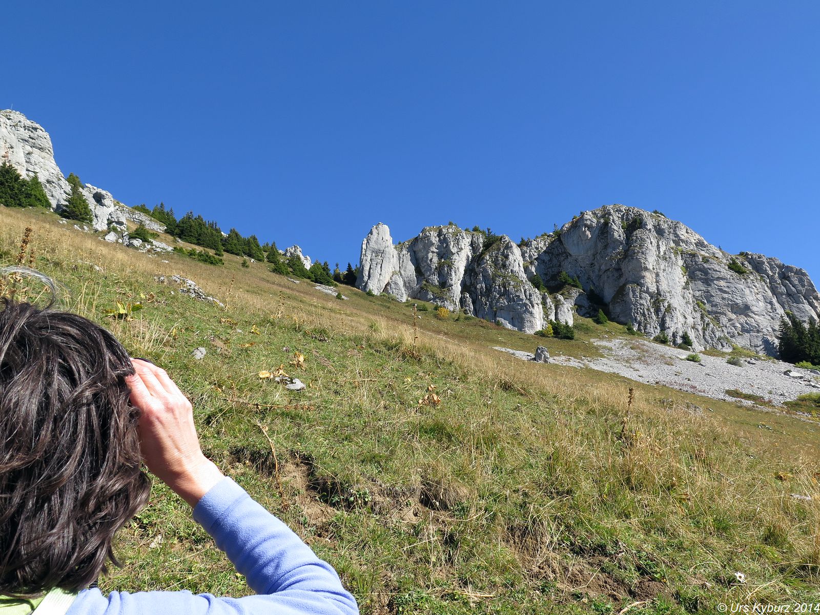 Junior 2 und ich kamen bald hinten ab, denn er wollte so viel wissen: Was dies für eine Pflanze ist. Und jene. Leider fanden wir in unserem Pflanzenbuch keine Antwort, dazu müsste man wohl die „Flora Helvetica“ mitschleppen, ein Monsterwälzer (ich weiss, es gibt ihn auch als App). Trotzdem erreichten auch wir zwei den Gipfel. Es windete, für einen gemütlichen Gipfelaufenthalt war es zu ungemütlich. Wir stiegen also bald wieder ab und suchten uns ein geschützteres Plätzchen zum Rasten. Hernach stiegen wir zum Col du Luissel ab, um sogleich die letzten 200 Höhenmeter in Angriff zu nehmen. Felswände in Sichtweite schienen zum Klettern einzuladen, und tatsächlich entdeckten wir mit dem Feldstecher ein paar nagelneue Bohrhaken. Auf der Berneuse endete dann unsere Tour, denn runter fuhren wir mit der Gondelbahn. Wie so Touristen.