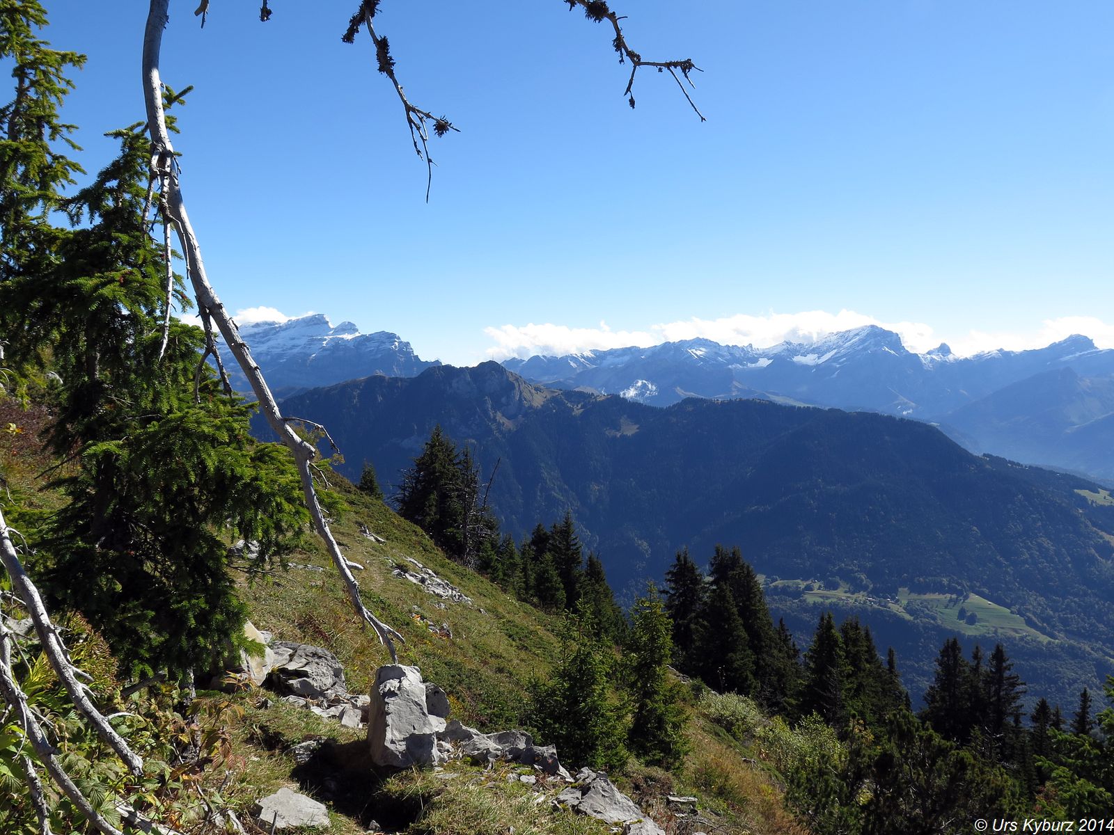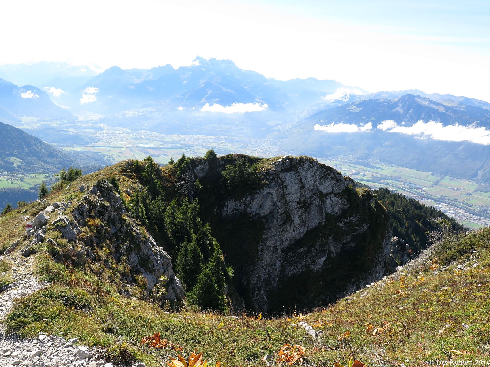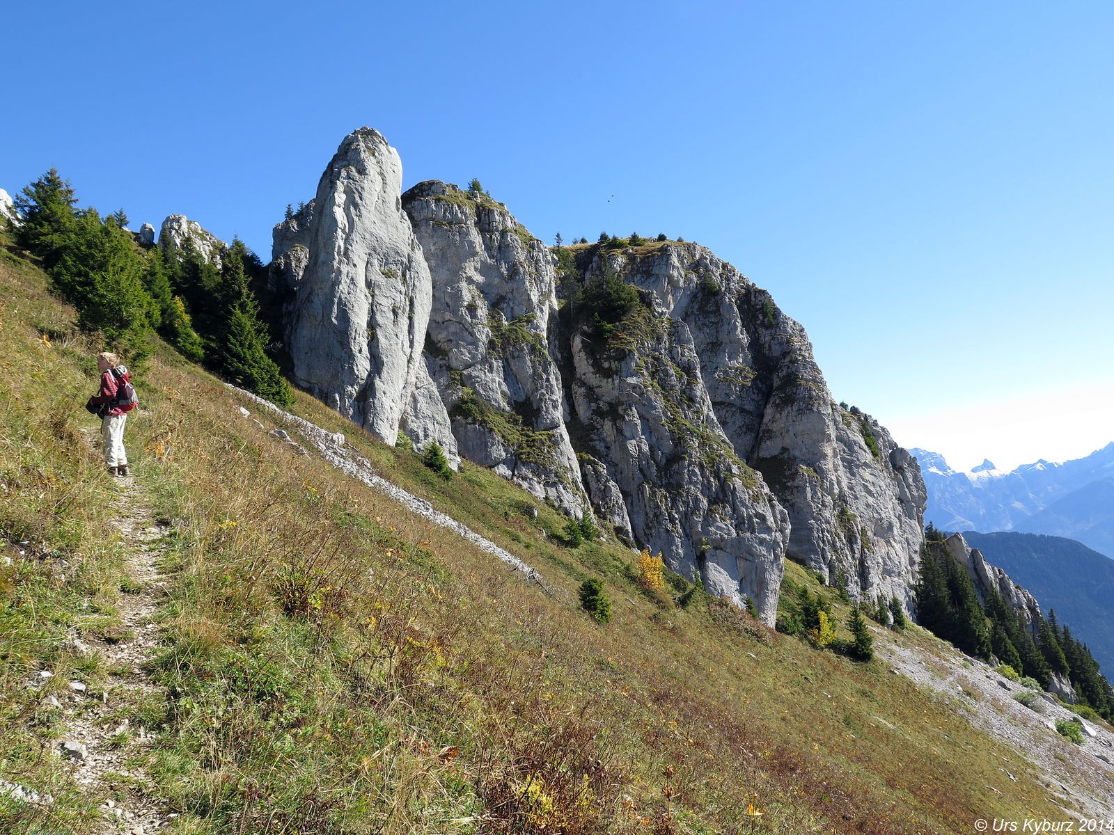 Wer hier genug hat, kann im Restaurant Prafandaz einkehren und nach Leysin zurückkehren. Wir wollten jedoch einen Gipfel besteigen, La Riondaz. Über eine Wiese stiegen wir hoch zur Strasse, die wir bereits einige Tage zuvor mit dem Bike befuhren, bogen jedoch dann links statt rechts ab. Auf dem steilen Pfad über die Crête du Cherix gewannen wir rasch an Höhe. Die Temperatur war angenehm zum Wandern, man geriet in der kühlen Morgenluft nicht gleich ins Schwitzen. Bei Solacyre änderte sich die Szenerie wiederum, der Wald wurde lichter, das Ambiente mediterraner, obwohl wir immer höher stiegen. Grund dafür waren die Natursteinmauern, die viel Wärme speichern und so für ein mildes Klima sorgen.