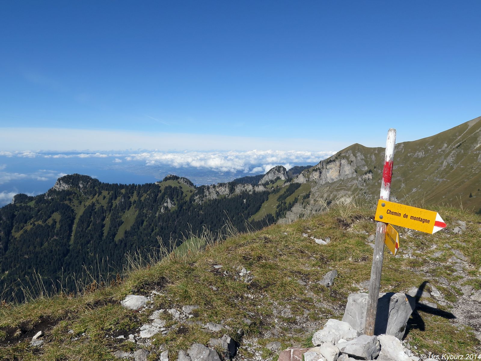Wir starteten die Tour gleich von der Haustüre aus. Nach einer Regennacht präsentierte sich der Himmel frisch gewaschen, die Sonne lachte von dem selbigen. Durch den Wald stiegen wir hoch nach Prélan, Vögel zwitscherten überall, liessen sich aber nur selten blicken. Bei Prélan startete auch besagter Trapperpfad, aber entweder wurden die Tafeln entfernt, oder wir übersahen vor lauter Aussicht in die Berge die Tafeln. Jedenfalls starteten wir mit der fünften. Die Schwierigkeit bestand nicht unbedingt in den Fragen, sondern diese zu verstehen. Ein Französischdictionaire im Rucksack ist sicher nicht falsch. Ein Wegweiser leitete uns zum ersten Aussichtspunkt: Die „Crevasse“, eine riesige Felsspalte. Von dort blickt man schön auf den Genfersee.