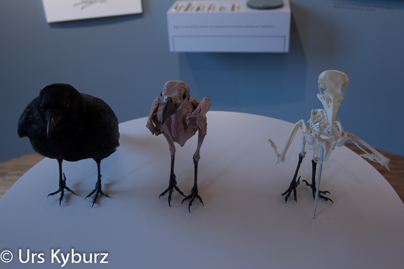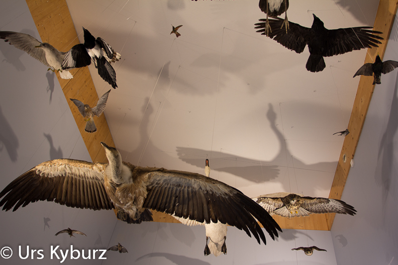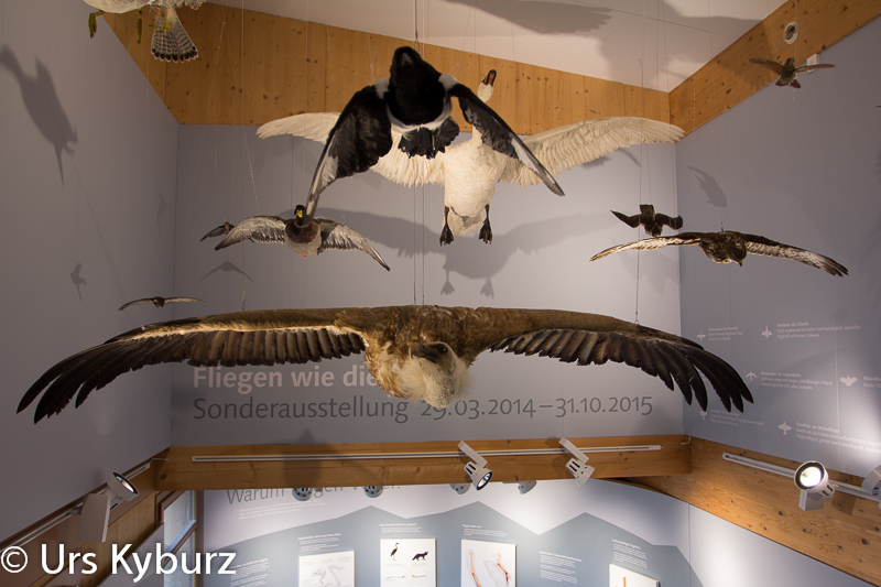 Weitere Posten in der Ausstellung liefern Infos zur Physik und Biologie des Vogelfluges. An der Decke hängen verschiedene Präparate, vom winzigen Kolibri bis zum riesigen Mönchsgeier, die zeigen, wie sich die Vögel an die verschiedenen Bedingungen angepasst haben.