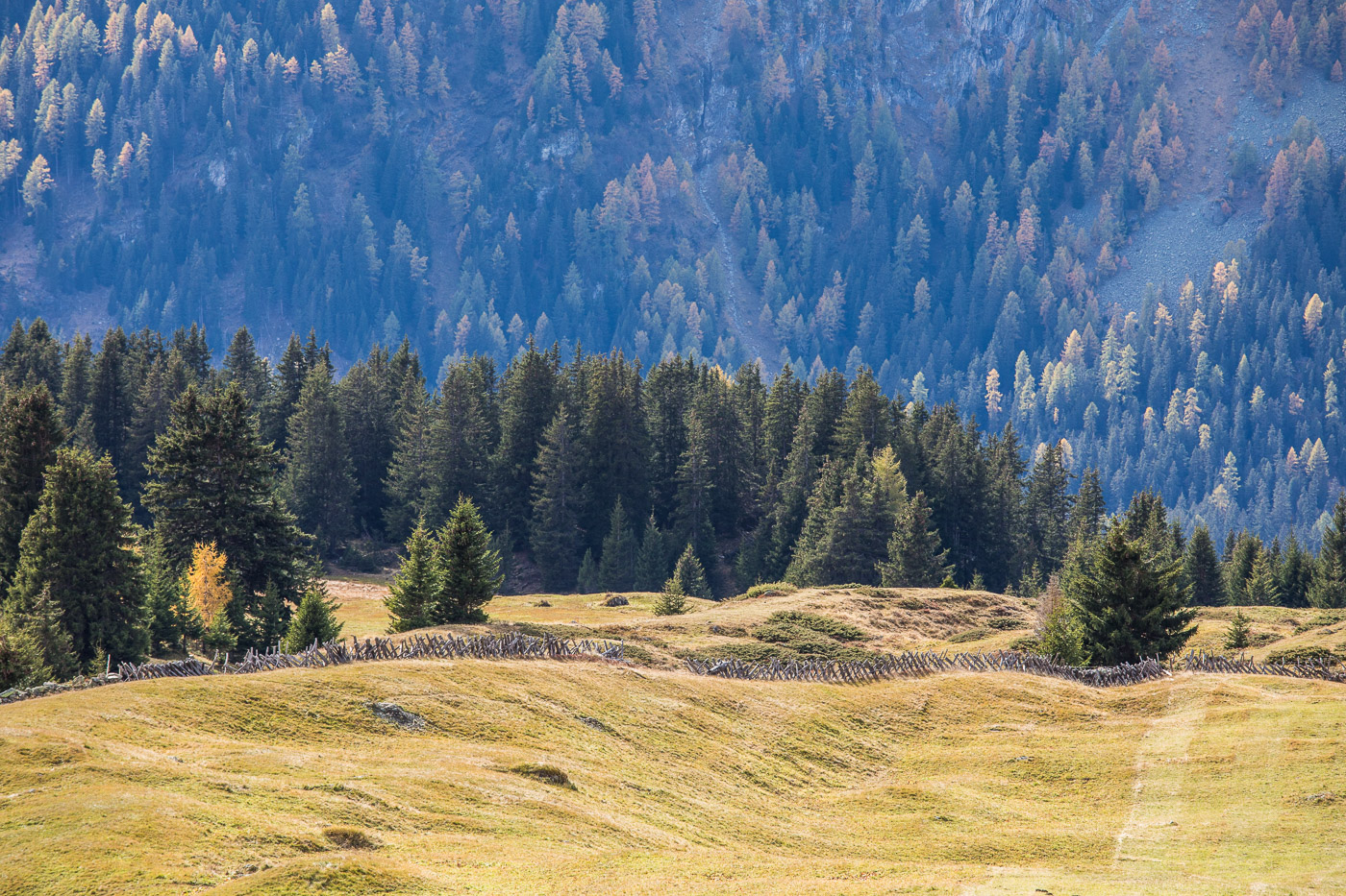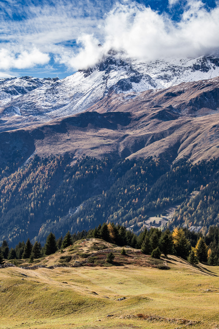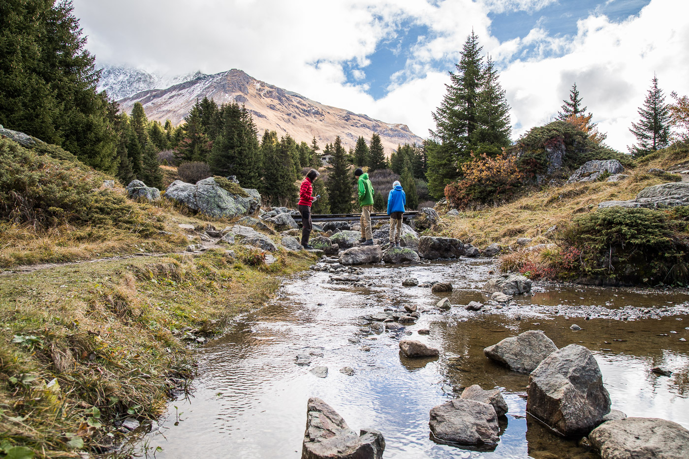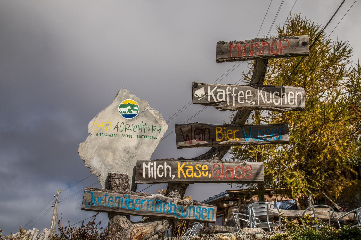 Wieder im Wald, geht der Weg aufwärts und wir gelangen auf eine Weide mit einer Natursteinmauer. Hier müsste man den Spinnenstaubsauger (deshalb die Gummischläuche) anwenden. Jetzt, im Oktober, hat es aber gar keine Spinnen mehr, oder wir hätten lange danach suchen müssen. All die Aufgaben sind ja eigentlich ortsunabhängig, wir können sie also auch noch zu Hause zur richtigen Jahreszeit lösen. Die Landschaft ist wunderschön, die Berggipfel von Wolken umhüllt, die Lärchen leuchten golden. Wir könnten uns noch lange umschauen, aber es ist nicht besonders warm. Zeit für einen Kaffee im Cotti Agricultura, einem rustikalen Beizli auf dem Rückweg.