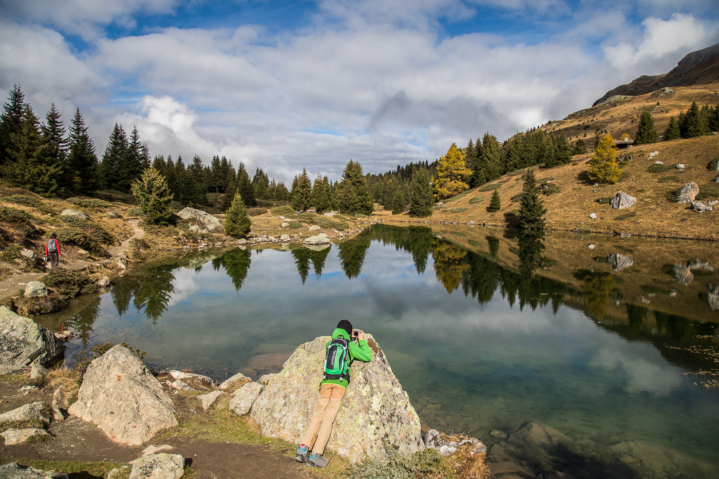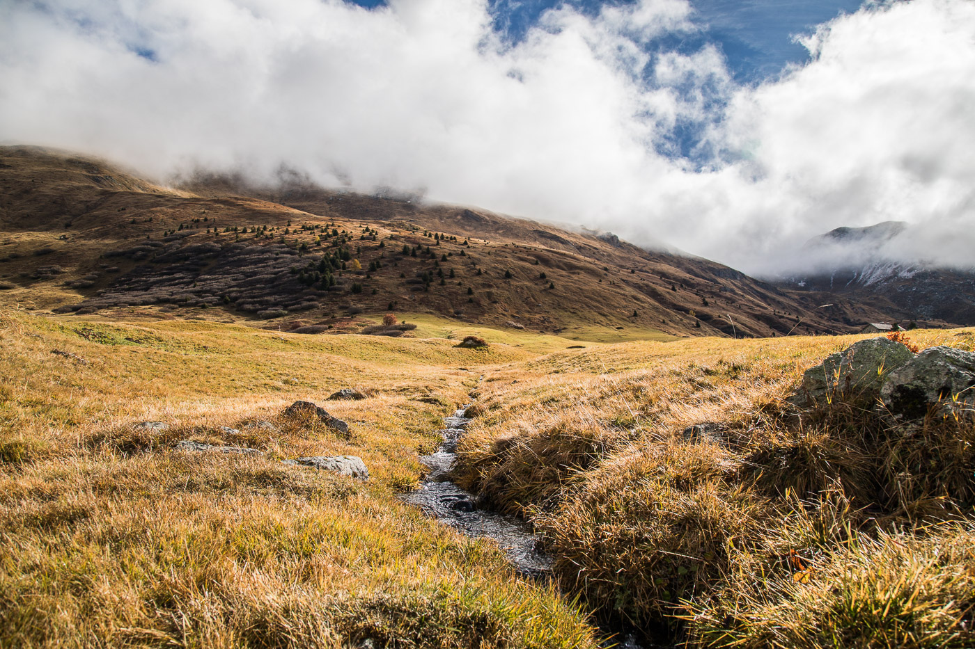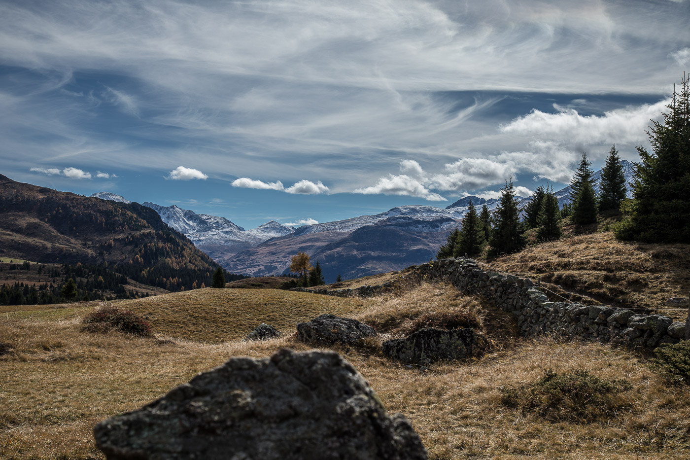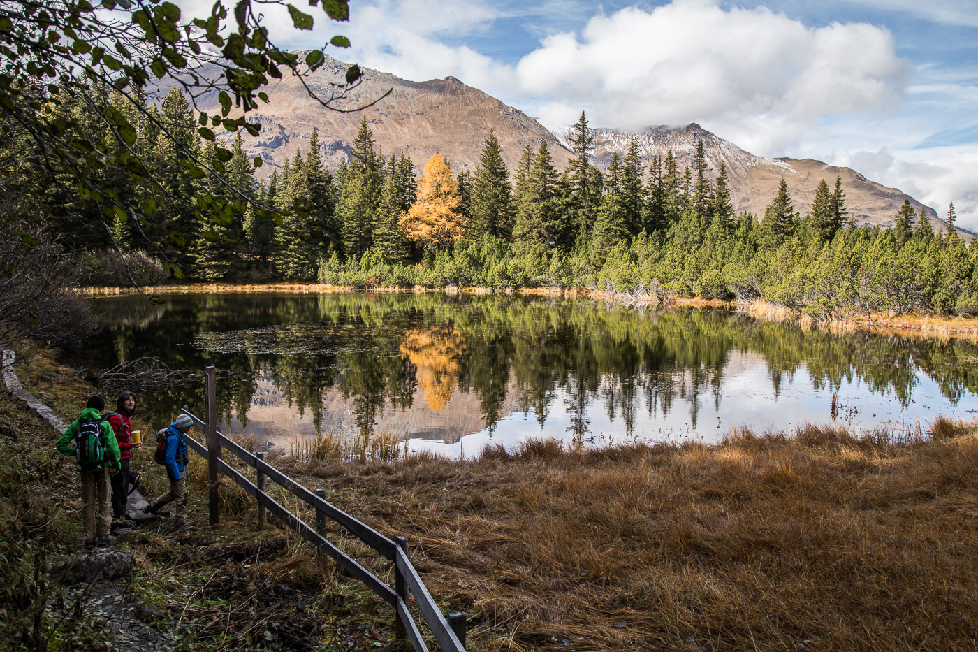 Wieder im Wald, geht der Weg aufwärts und wir gelangen auf eine Weide mit einer Natursteinmauer. Hier müsste man den Spinnenstaubsauger (deshalb die Gummischläuche) anwenden. Jetzt, im Oktober, hat es aber gar keine Spinnen mehr, oder wir hätten lange danach suchen müssen. All die Aufgaben sind ja eigentlich ortsunabhängig, wir können sie also auch noch zu Hause zur richtigen Jahreszeit lösen. Die Landschaft ist wunderschön, die Berggipfel von Wolken umhüllt, die Lärchen leuchten golden. Wir könnten uns noch lange umschauen, aber es ist nicht besonders warm. Zeit für einen Kaffee im Cotti Agricultura, einem rustikalen Beizli auf dem Rückweg.