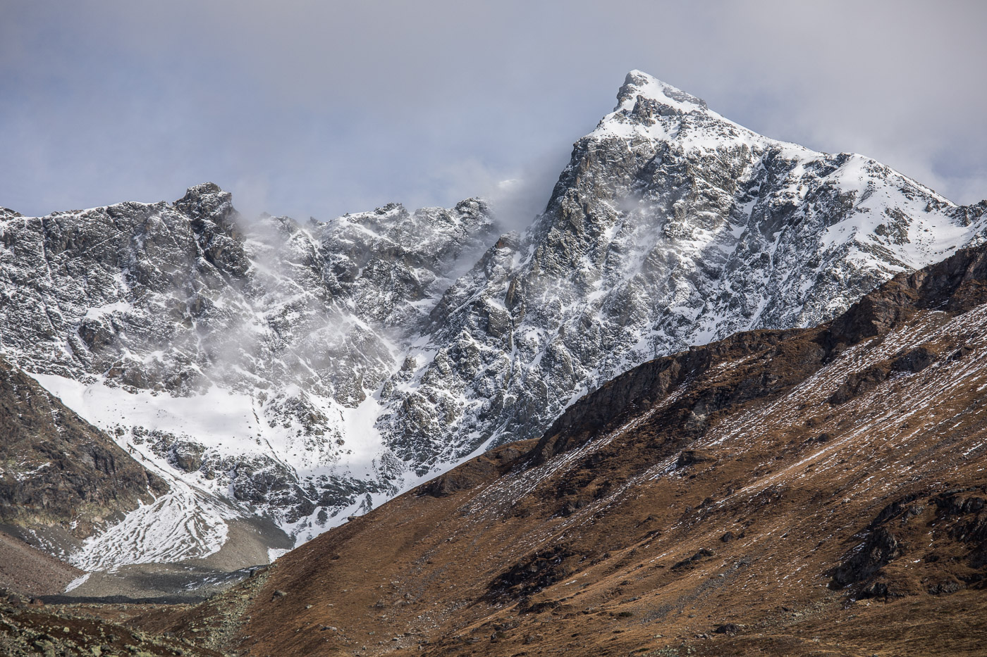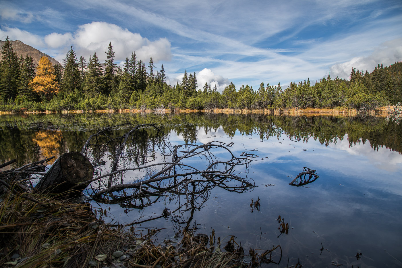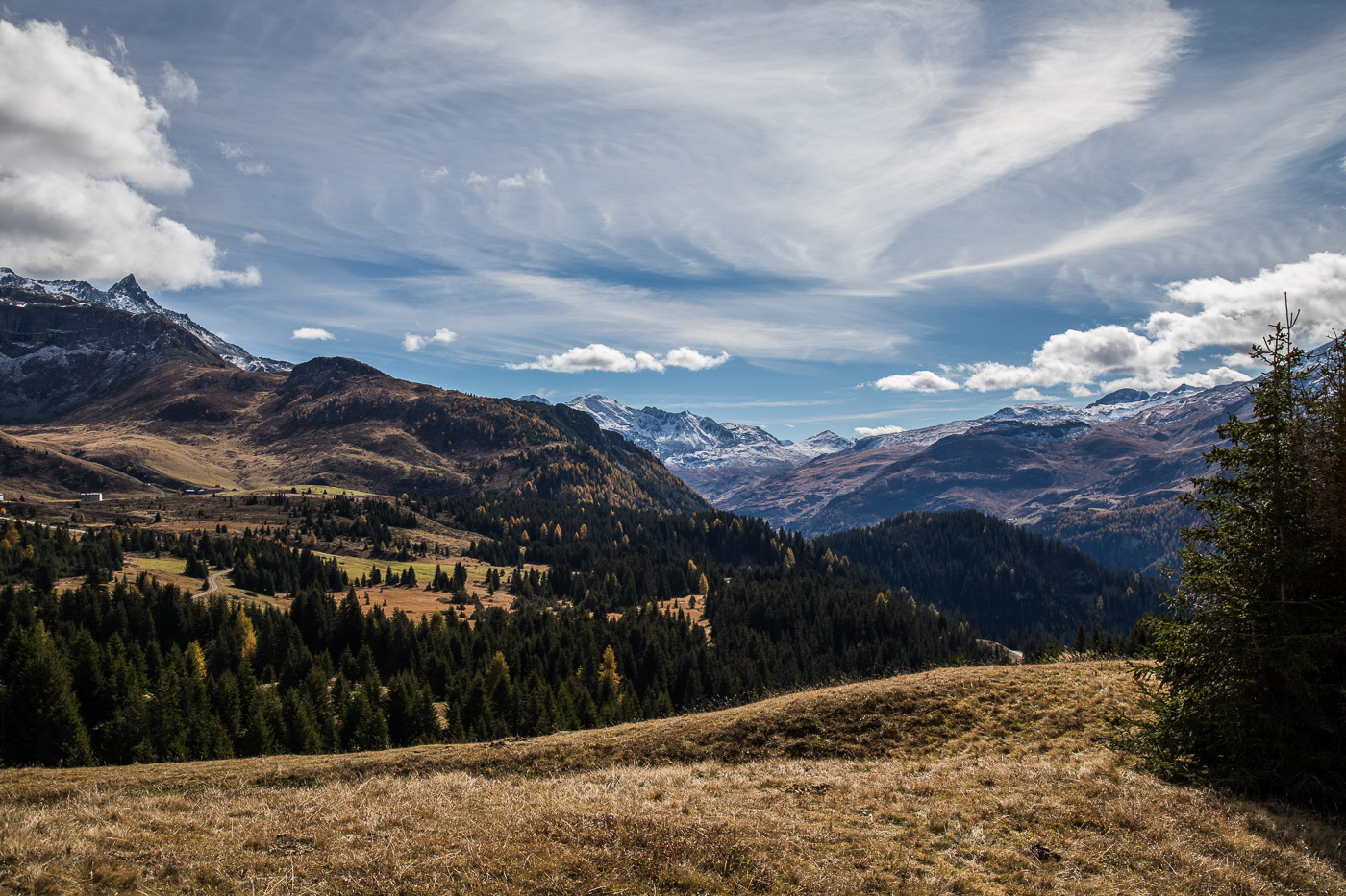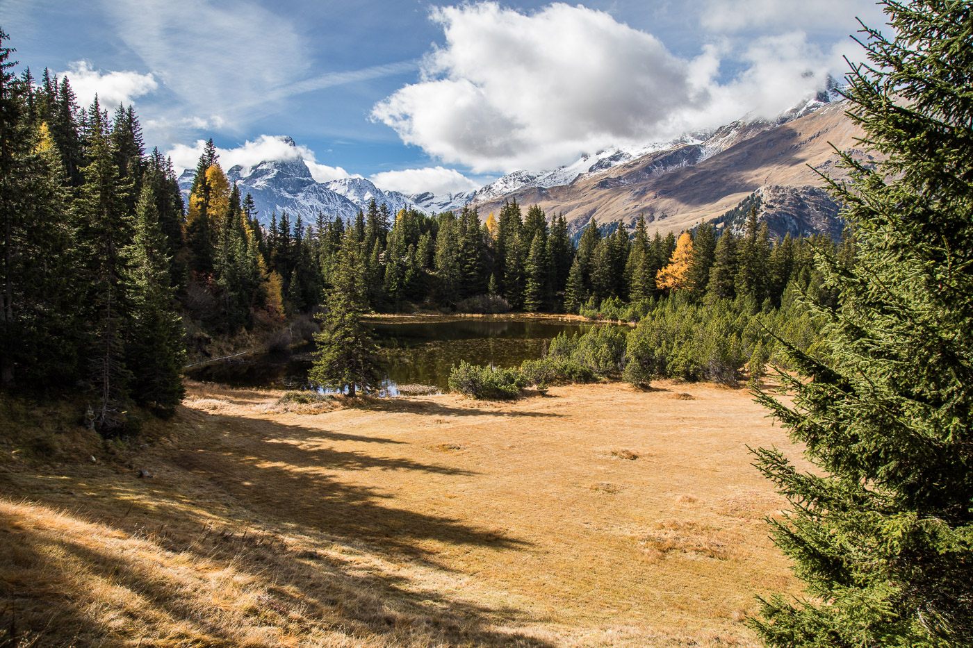 Wieder im Wald, geht der Weg aufwärts und wir gelangen auf eine Weide mit einer Natursteinmauer. Hier müsste man den Spinnenstaubsauger (deshalb die Gummischläuche) anwenden. Jetzt, im Oktober, hat es aber gar keine Spinnen mehr, oder wir hätten lange danach suchen müssen. All die Aufgaben sind ja eigentlich ortsunabhängig, wir können sie also auch noch zu Hause zur richtigen Jahreszeit lösen. Die Landschaft ist wunderschön, die Berggipfel von Wolken umhüllt, die Lärchen leuchten golden. Wir könnten uns noch lange umschauen, aber es ist nicht besonders warm. Zeit für einen Kaffee im Cotti Agricultura, einem rustikalen Beizli auf dem Rückweg.