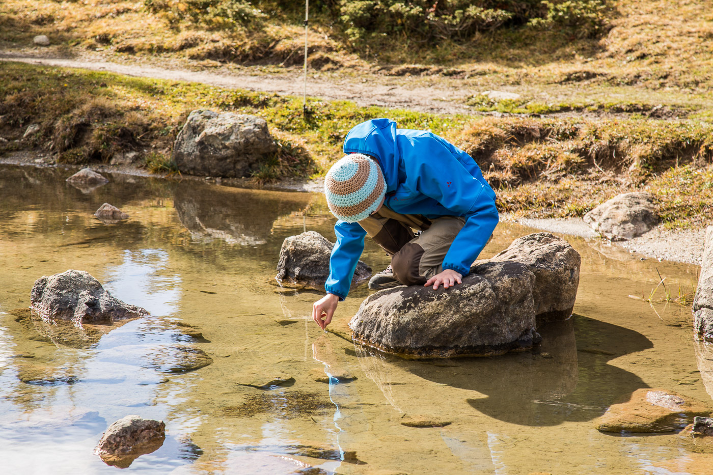 Bei der nächstbesten Sitzgelegenheit kann die Frau ihren Gwunder nicht mehr zügeln und öffnet die Röhre. Da kommt allerhand zum Vorschein: Ein Büchlein, eine Becherlupe, Schläuche, ein Säckchen mit weissem Pulver, Holz, ein Becher und mehr. Das sieht ja spannend aus. Wozu das wohl ist? Der Forscherparcour startet an den Lais Blos, begleitet von Professor Fix. Als erstes will er wissen, wie der pH-Wert des Sees ist. Ist er sauer oder basisch? Ein Streifen Lackmuspapier dient zur Bestimmung, Silvan taucht ihn ins Wasser. Der Streifen verfärbt sich und… Probiert es selber!