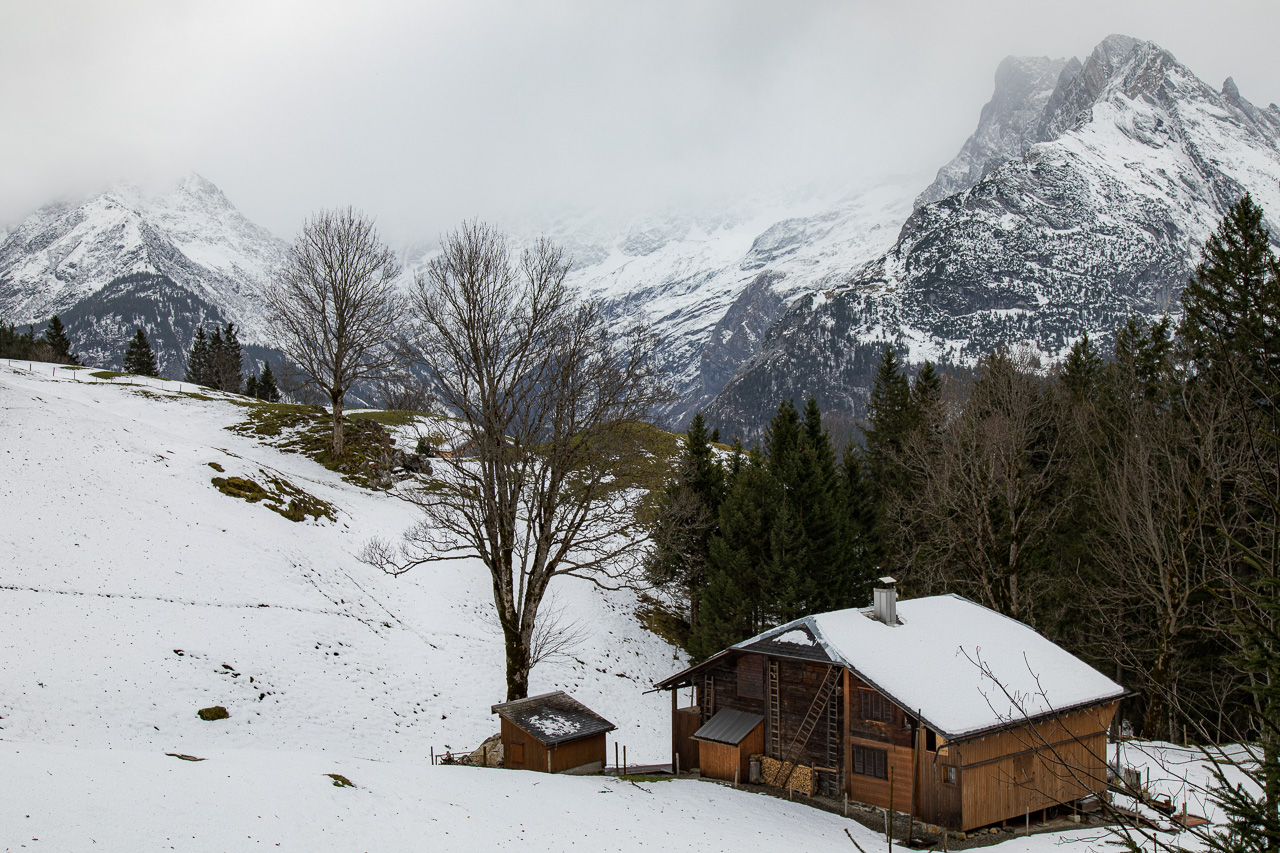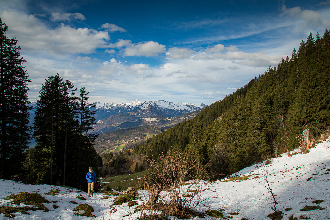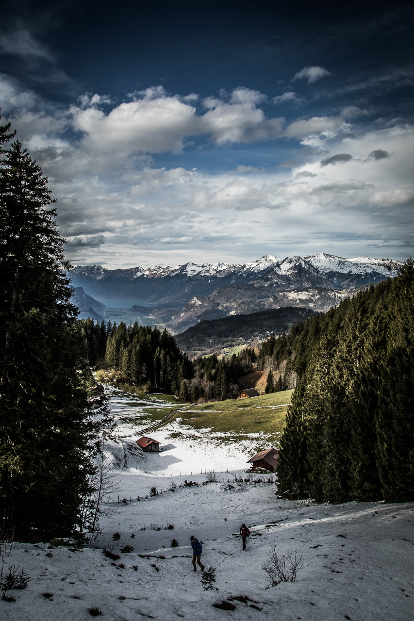 Die anschliessende Wanderung führte uns diesmal etwas weiter. Der Schnee, der tags zuvor noch fast die ganze Weide neben der Hütte bedeckte, war fast vollständig geschmolzen. Bei der oberen Alp stapften wir dann doch noch durch den Schnee, die Sonne schien, ideal für Bilder.