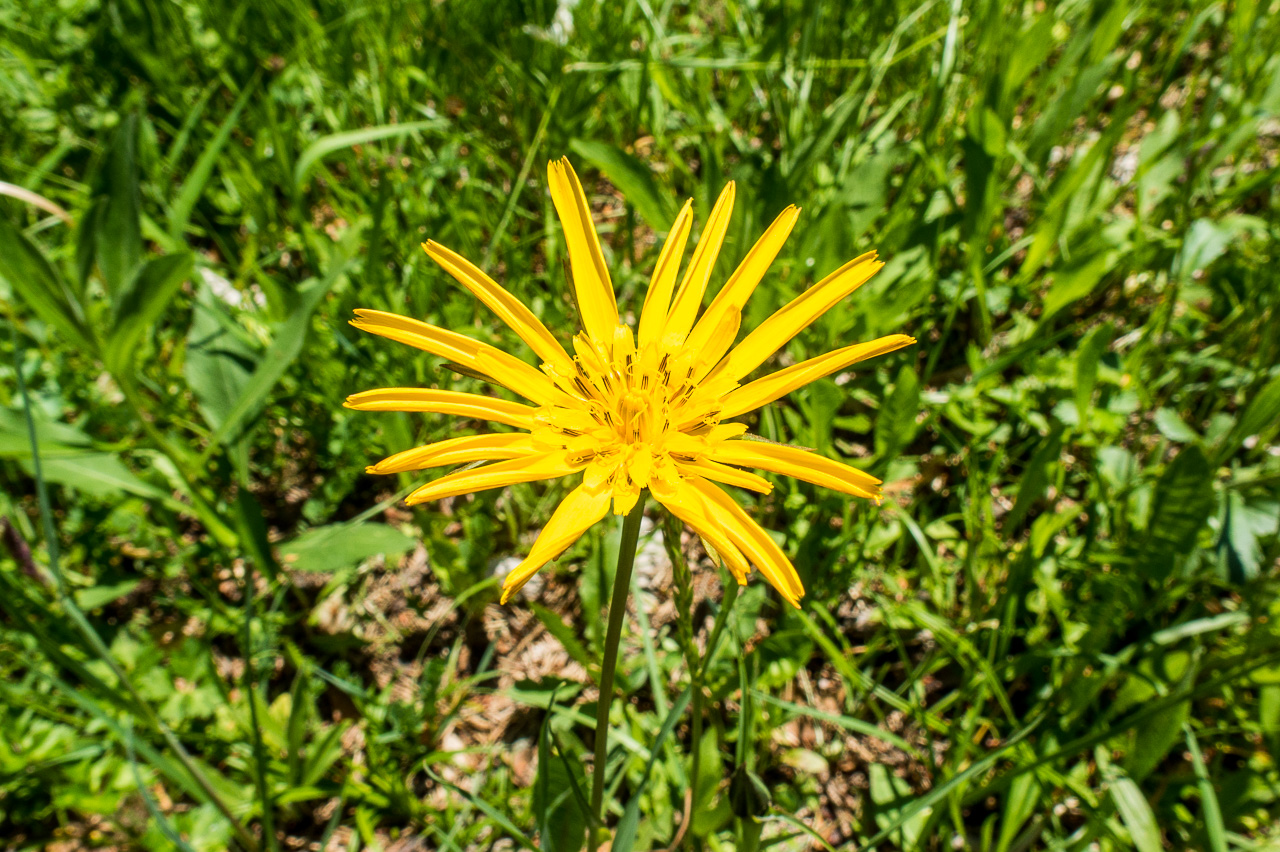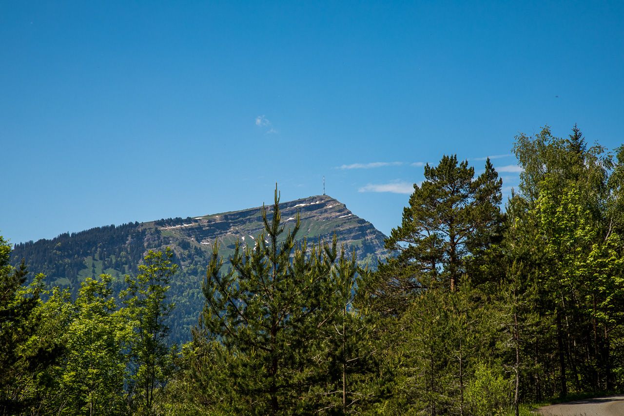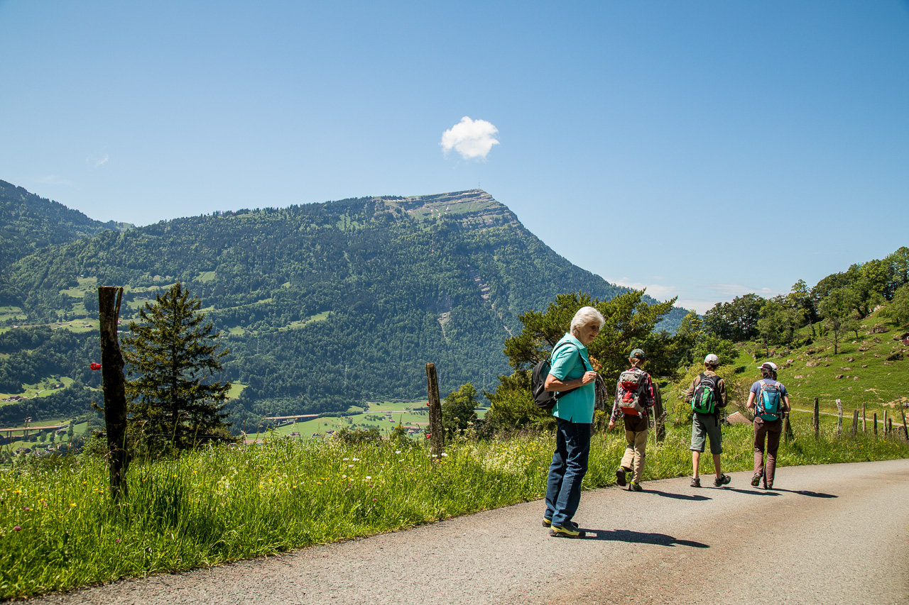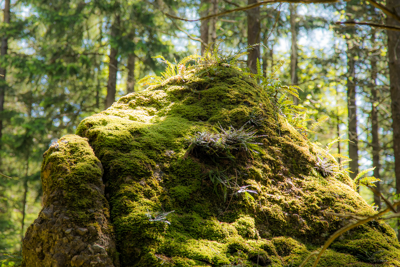 Ausgangs Goldau, bei der Schneeschleuder (ja, tatsächlich), zweigt der Weg links ab und steigt in den Wald hoch. Der Weg geht ziemlich gerade hoch und ist eigentlich in Drittel unterteilt, nach jedem Drittel quert man wieder eine Asphaltstrasse. Das erste Drittel ist relativ ereignisarm, trotzdem kann Silvan einige Blumen bestimmen, seine Mutter fungiert als Trägerin seiner Blumenbibel, der „Flora Helvetica“. Schön die Felsblöcke, die über und über mit Moos und anderen Pflanzen bewachsen sind. Wir sind nämlich mitten im Goldauer Felssturzgebiet, wo 1806 ein gigantischer Bergsturz stattfand, der 457 Menschen das Leben kostete.