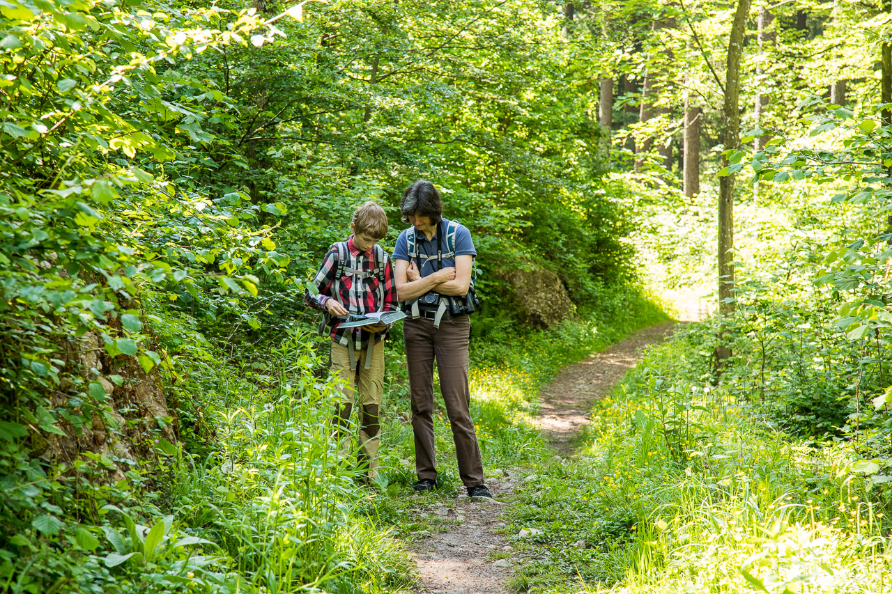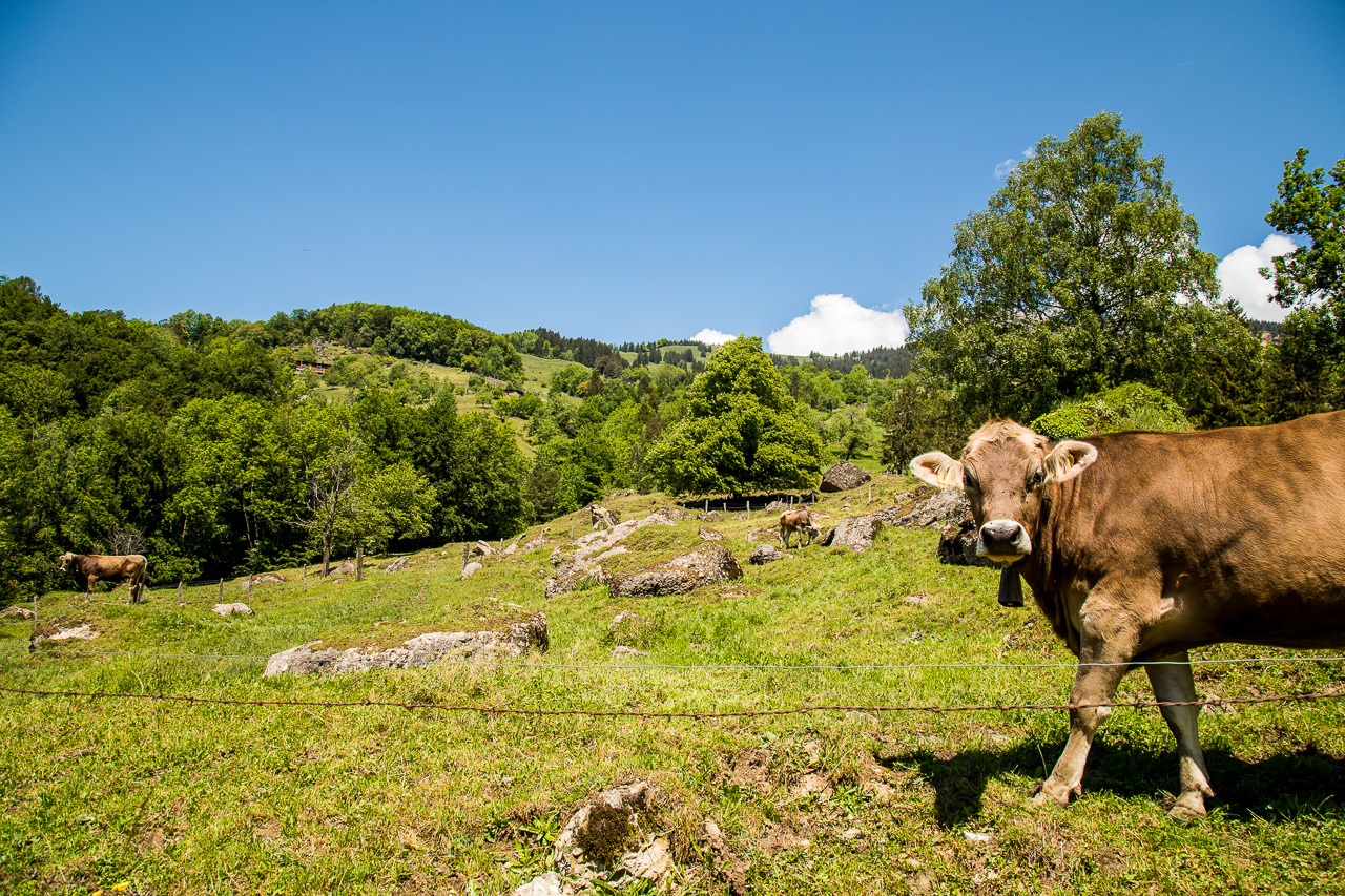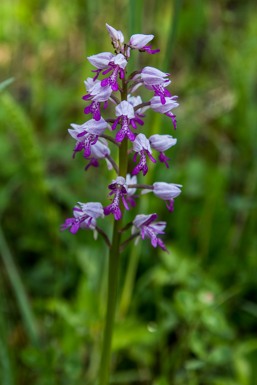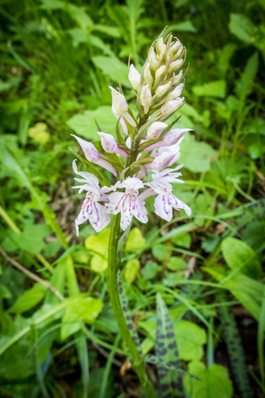 An der Strasse nach dem ersten Drittel treffen wir nebst vielen Akelei auch auf das Weisse Waldvöglein, eine weitere Orchideeart. Nur von den Frauenschuhen haben wir noch nichts gesehen. Wir steigen weiter hoch, treffen verschiedene Orchideen an, aber immer noch nicht die gesuchten. Ein älteres Paar macht Rast am Wegrand, wir halten auch kurz. Ob wir die Frauenschuhe gesehen hätten dort, fragen sie. Oh, tatsächlich, das ist ein ganzes Büschel! Silvan und ich gehen sofort hin zum Fotografieren. Von nun an treffen wir überall auf die gelben Orchideen. links und rechts des Weges führen Trampelpfade weg und enden immer bei einem Frauenschuh. Es sind tatsächlich beeindruckende und faszinierende Blumen.