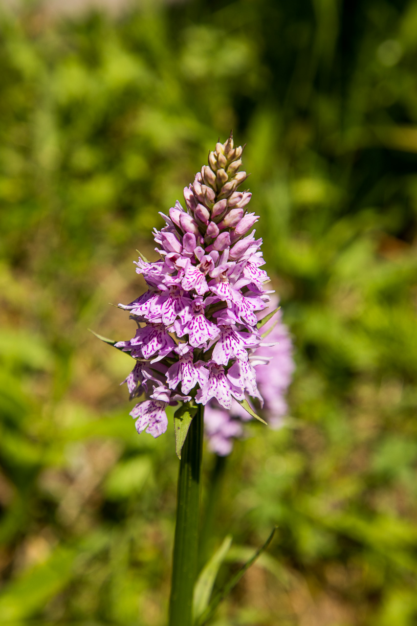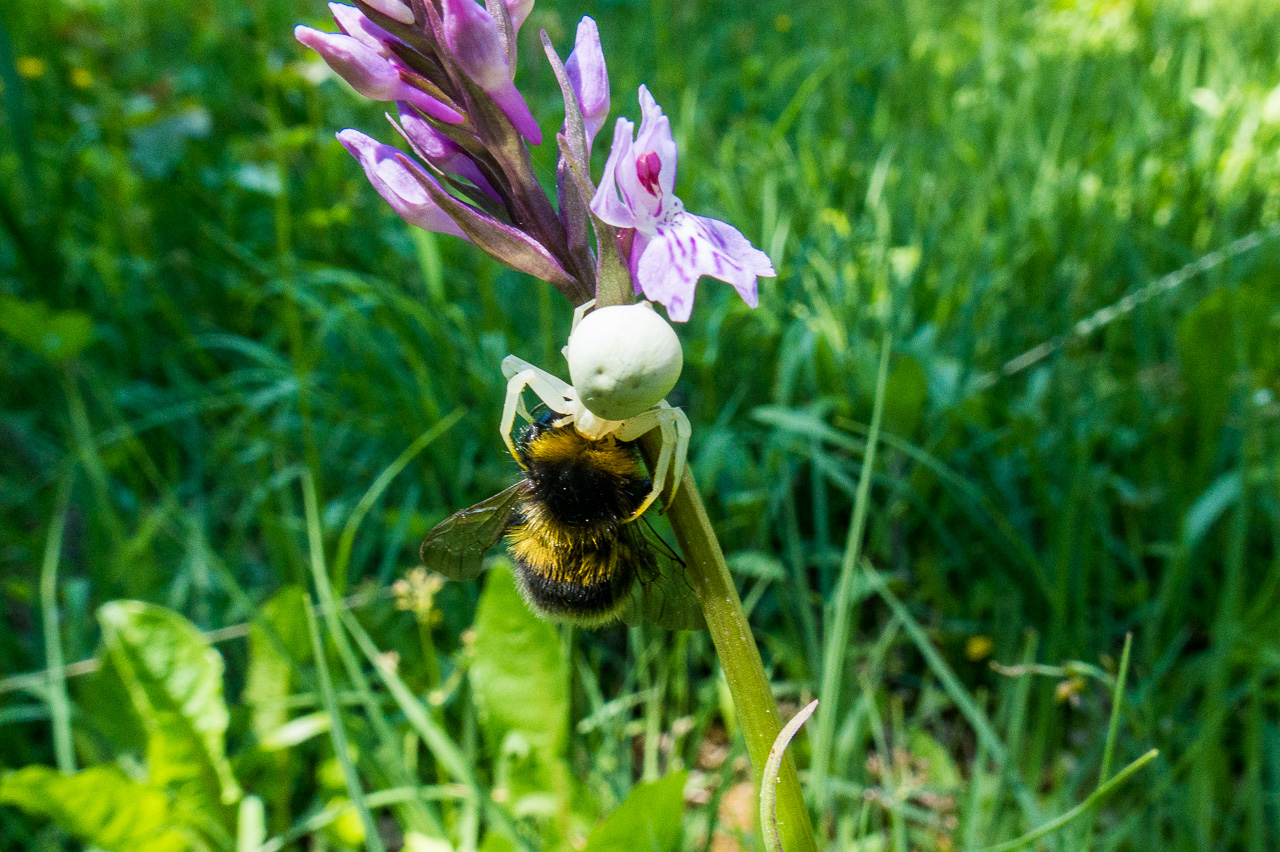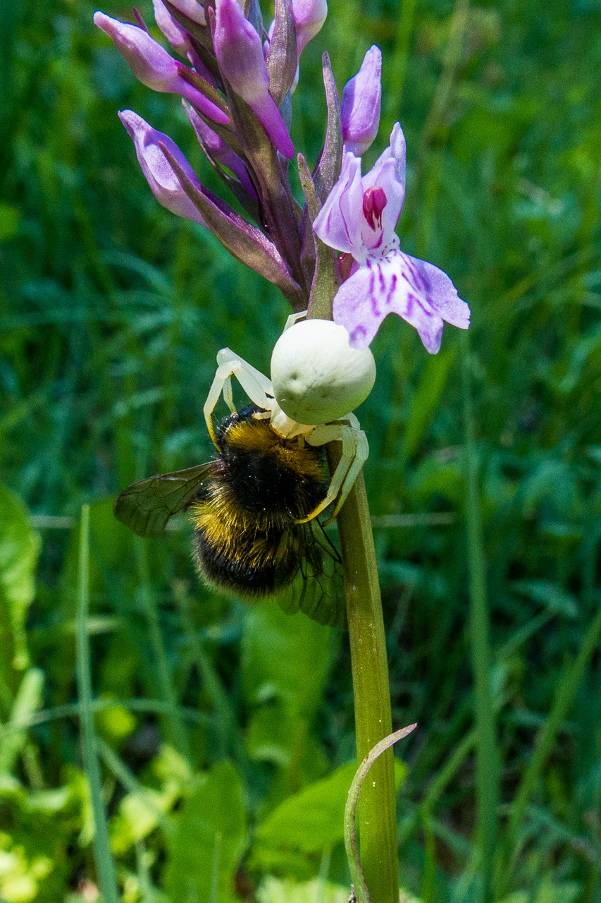 Nach zwei Dritteln brechen wir ab, wandern der Strasse entlang wieder abwärts. Aber es ist noch nicht fertig mit Blumen, auch hier entdecken wir noch viele Orchideen. Und schon fast zuunterst, gleich hinter dem Tierpark, findet Silvan noch weitere Orchideen sowie Wollgras. Und wird Zeuge eines Dramas: Eine Veränderliche Krabbenspinne hat auf einem Knabenkraut einer Hummel aufgelauert und diese erbeutet.