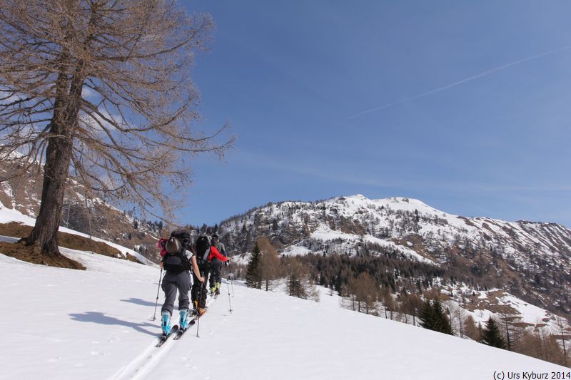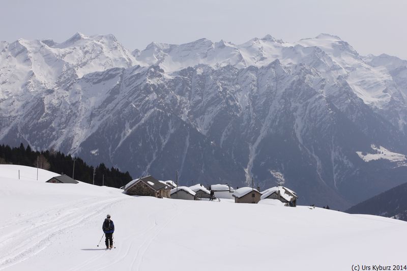Gleissendes Sonnenlicht empfängt uns beim Verlassen der Gotthardröhre. Der Unterschied zur Nordseite ist frappant: Enorme Schneemassen liegen noch da. Daran sollte also das Wochenende nicht scheitern. Bei Biasca biegen wir in das Bleniotal ab. Die Wälder sind noch kahl, blühende Kirschbäume setzen weisse Farbtupfer. Wir starten oberhalb Olivone von der Lukmanierpassstrasse aus. Auf Waldstrassen und über Weiden steigen wir auf zum Weiler Anvéuda.
