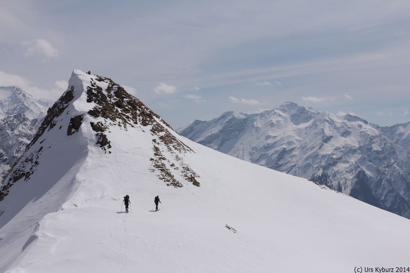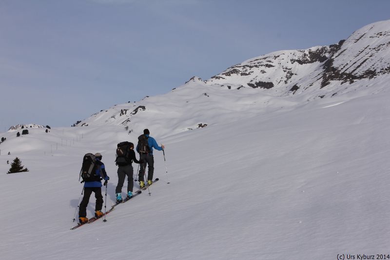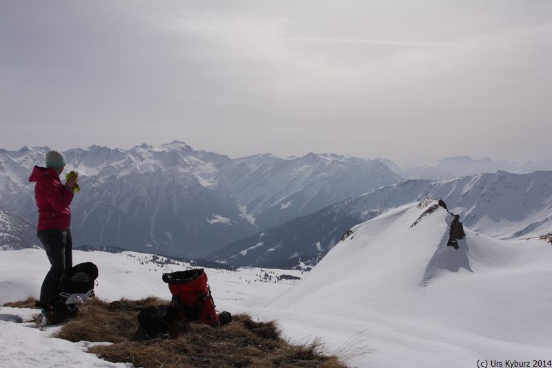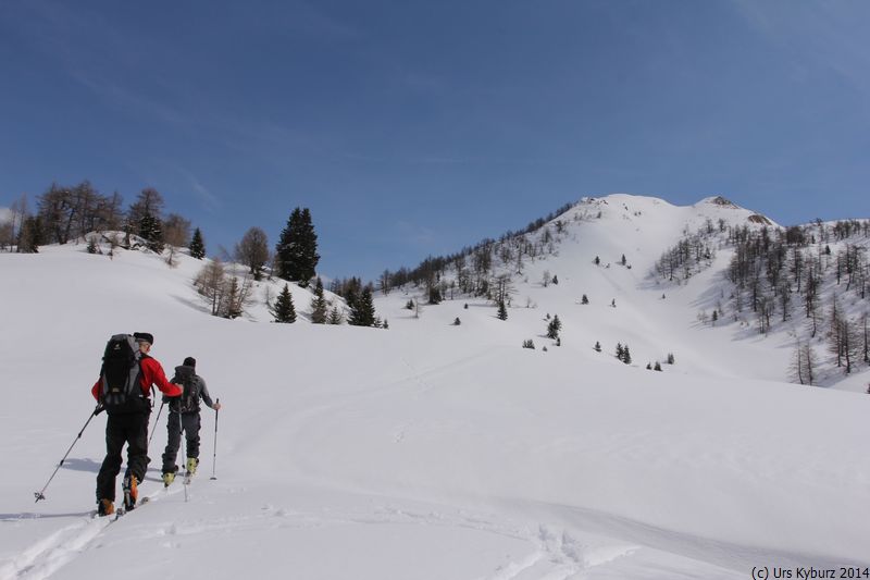 Vor uns liegt das Ziel: Der Pizzo Rossetto, 2099 Meter hoch. Es ist warm, sehr warm. Der Weg wird wieder steiler, wir steigen zwischen lichtem Lärchenwald hoch. Auf dem Grat links von uns entdecken wir ein Gämsrudel, neun Tiere. Sie folgen den aperen Hängen, wo sie viel einfacher an ihre Nahrung kommen. Nach einer kurzen Pause nehmen wir den letzten Aufschwung in Angriff. Versanken wir vorhin noch fast im Schnee, so müssen wir jetzt auf dem gefrorenen und windgepressten Weiss aufpassen, dass wir nicht ausrutschen. Auf dem Gipfel bot sich uns eine grossartige Rundsicht.