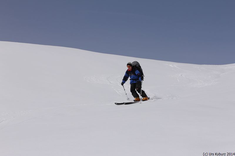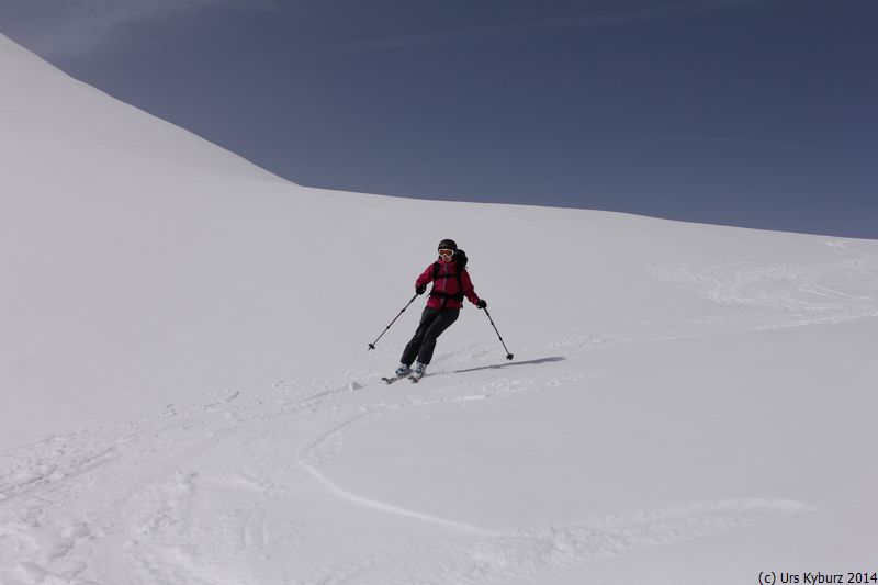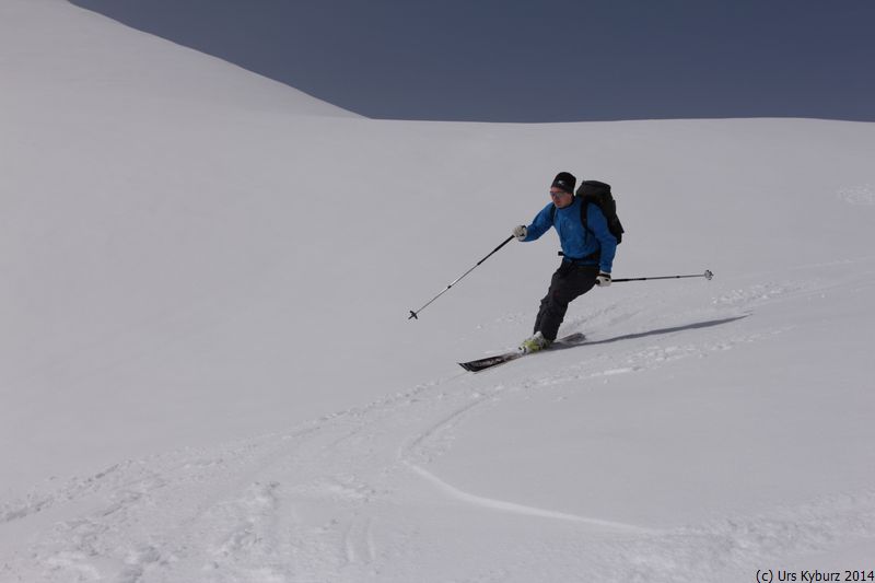 Die Sonne scheint milchig-trüb durch die Schleierwolken. Wir geniessen die kühle Morgenluft, auch dies erleichtert unseren Aufstieg. Vor dem letzten Aufschwung zum Gipfel entscheidet sich die Hälfte der Gruppe, den Hügel davor zum Gipfel zu ernennen und rastet da. Die andere Hälfte setzt den Weg fort und erreicht den 2516 Meter hohen Pizzo di Cadreigh. Nach einer etwas ruppigen Gipfelabfahrt vereinigt sich die Gruppe wieder. Gemeinsam fahren wir nun weiter. Die Verhältnisse sind nun perfekt: Die obersten zwei, drei Zentimeter sind angeschmolzen, darunter ist die Schneeschicht noch hart und tragfähig. Wir fahren, nein, wir schweben hinunter. Ein Traum! Fliegen kann kaum schöner sein.