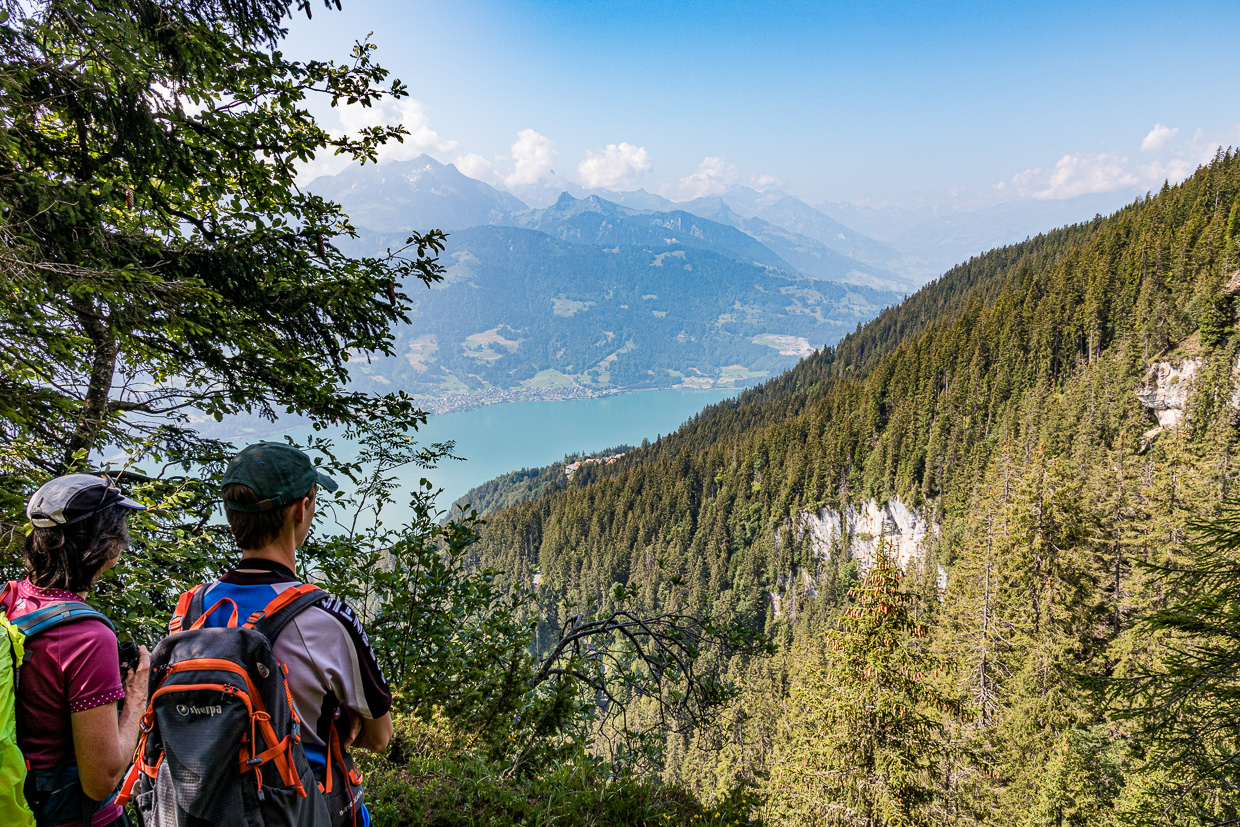 Der Wald wird lockerer, wir wandern zunehmend an der Sonne. Ein alter Mann mit Bart, der am Holz sägen ist, freut sich, dass er mal jemanden sieht, und winkt uns zu. Vor der Alp Oberburgfeld wird es Zeit für die Mittagspause. Fabian, der lieber wieder aufs Bike gestiegen ist als mit uns zu wandern, meldet sich aus dem Hotelzimmer, er ist bereits wieder zurück. Nun erreichen wir den Wanderweg, den die Abwärtswanderer nehmen, ab jetzt kommen uns viele Leute entgegen. Wir geniessen die Aussicht auf Eiger, Mönch und Jungfrau und die anderen Berge des Berner Oberlandes, den Thunersee und die Brienzerhornkette.