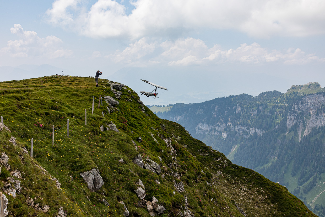 Die Alpenrosen stehen in voller Blüte, auch zahlreiche andere Blumen zeigen ihre Pracht. Der Wanderweg ist ein Auf und Ab, schön zu gehen. Vor der Gemmenalp zweigen wir ab, hoch zum Grat zwischen dem Gemmenalphorn und dem Burgfeldstand, dem Güggisgrat. Da wartet auch schon die erste Steingeiss, sie hält Distanz, zeigt aber keine Scheu. Der Blick fällt auf die andere Seite, ins Justistal. Die Zahl der Leute nimmt nicht ab, ständig kreuzen wir andere Wanderer. Von weitem sieht der Burgfeldstand unmöglich aus, eine abweisende Felswand. Aber es muss ja einen einfachen Weg geben auf diesen Totz, so ist es denn auch. Der Weg wird etwas steiler, ist aber problemlos machbar. Auf dem Burgfeldstand hebt gerade ein Deltasegler ab.
