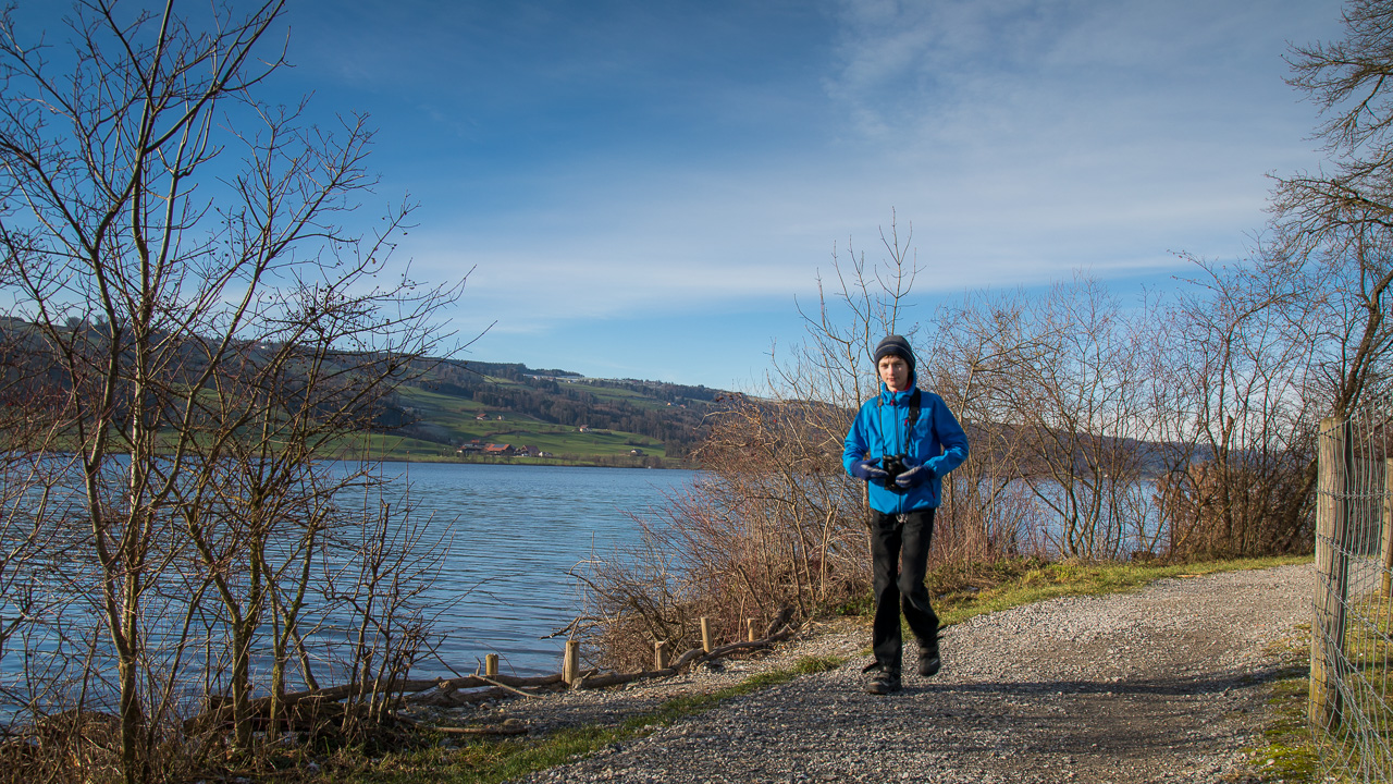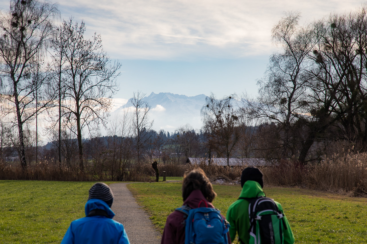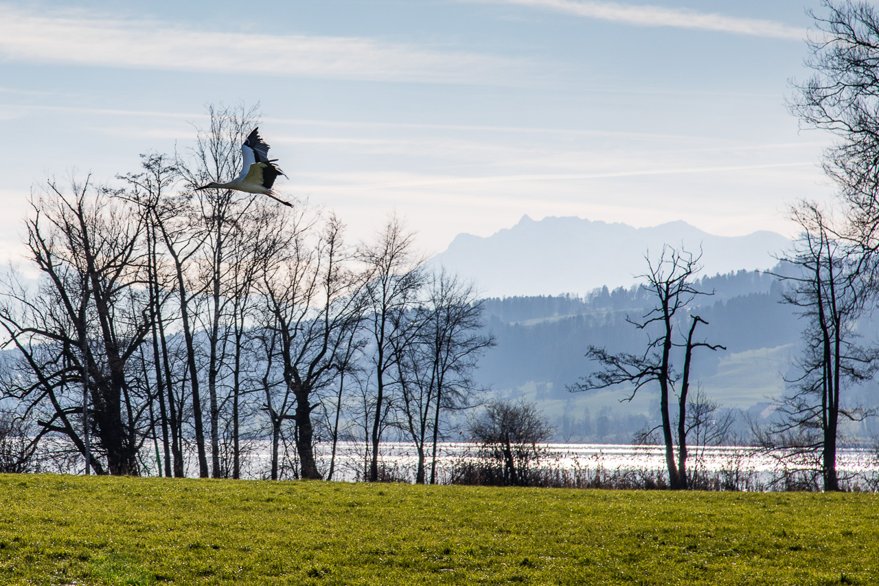 Wir wandern über die Felder, immer die verschneiten Berge im Blickfeld. Auf den Wiesen staksen vier Störche herum. Sollten die jetzt nicht im Süden sein? Einen Tag später wird es schneien, vielleicht haben sie es bereits bereut, hiergeblieben zu sein. Wir erreichen den See, allerdings nur kurz, der Weg biegt ab und führt nach Gelfingen hinein.