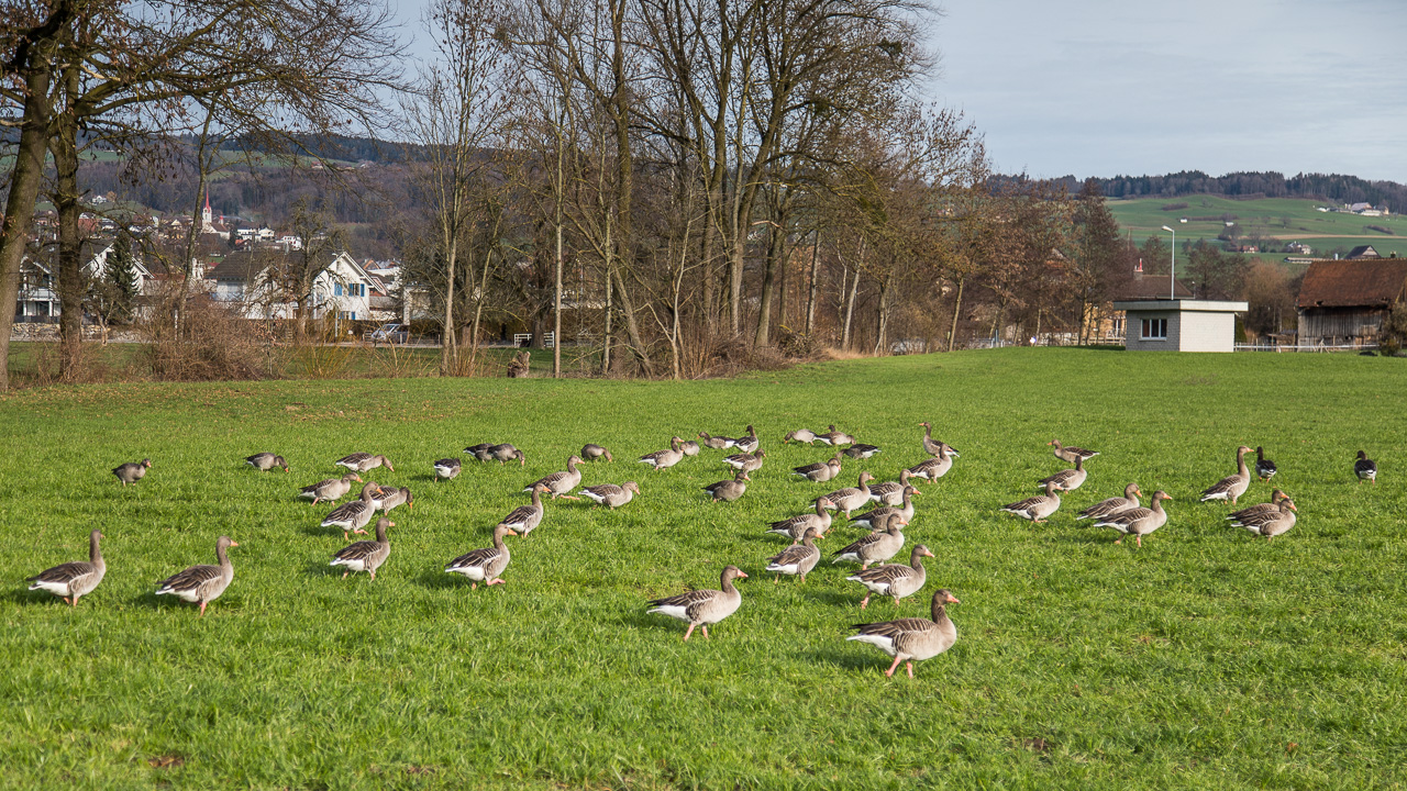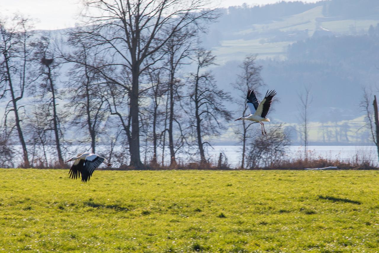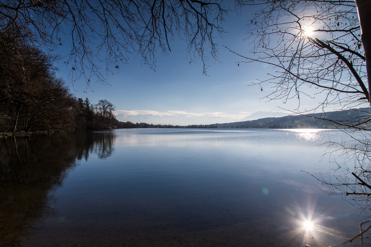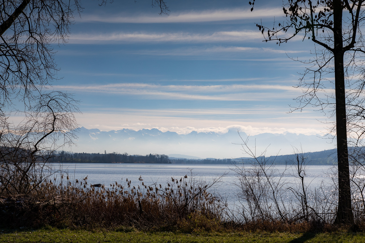 Wir wandern über die Felder, immer die verschneiten Berge im Blickfeld. Auf den Wiesen staksen vier Störche herum. Sollten die jetzt nicht im Süden sein? Einen Tag später wird es schneien, vielleicht haben sie es bereits bereut, hiergeblieben zu sein. Wir erreichen den See, allerdings nur kurz, der Weg biegt ab und führt nach Gelfingen hinein.