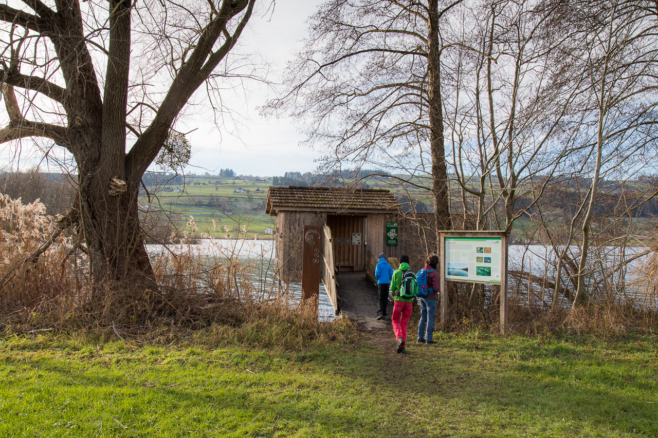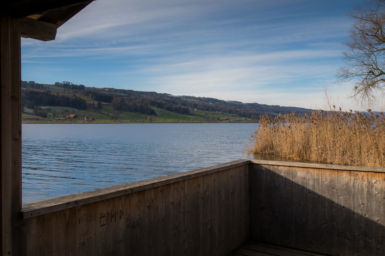 An der Badi vorbei erreichen wir den Hide am See. Er gehört, wie der ganze See, Pro Natura. Der See war in den Achtziger Jahren biologisch fast tot, mit der Seebelüftung, die seither ständig läuft, wird ein Kippen zur kompletten Todeszone verhindert. Felchen können trotzdem nicht laichen, es gibt immer noch zuwenig Sauerstoff, weshalb der Berufsfischer die Fische in Becken züchtet und sie dann aussetzt. Schuld an der ganzen Misere ist der viel zu hohe Phosphoreintrag in den See durch die zahlreichen Tiermästereien in der Umgebung. Die politisch Verantwortlichen scheinen aber nicht gewillt, das Problem zu lösen, da einmal mehr viel Geld im Spiel ist. Mehr dazu gibt es auf der Seite von Pro Natura Luzern. Wir könnten nun weiter ins Ronfeld, einem weiteren Feuchtgebiet bei Hochdorf, doch wir freuen uns nun auf ein warmes Getränk im Klosterkafi.
