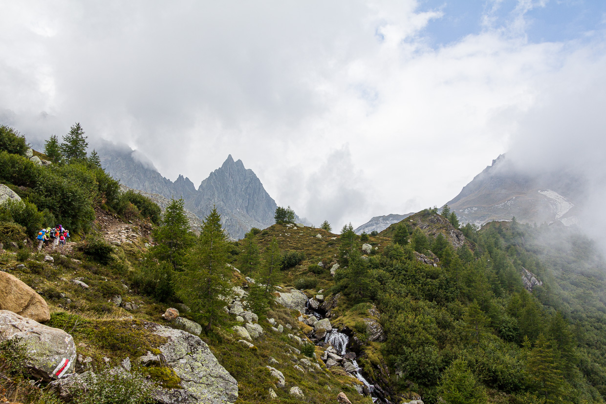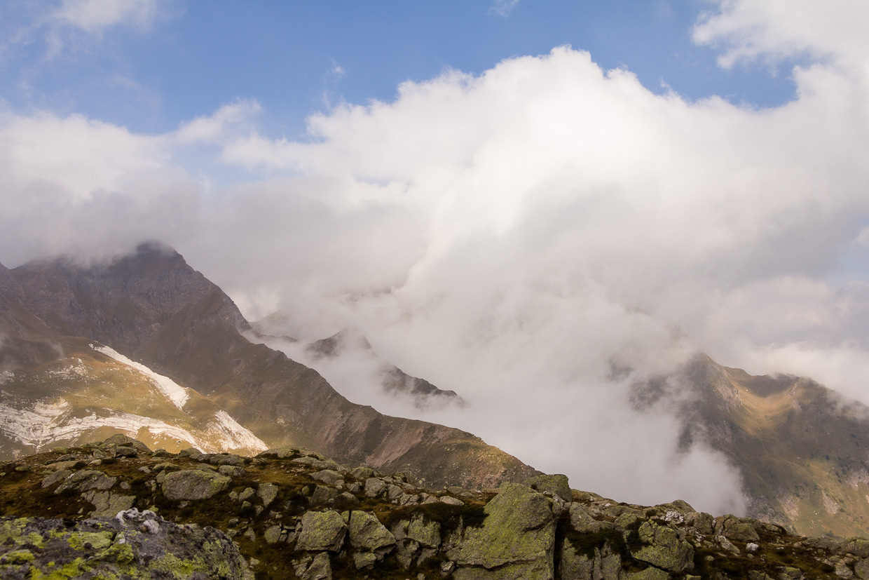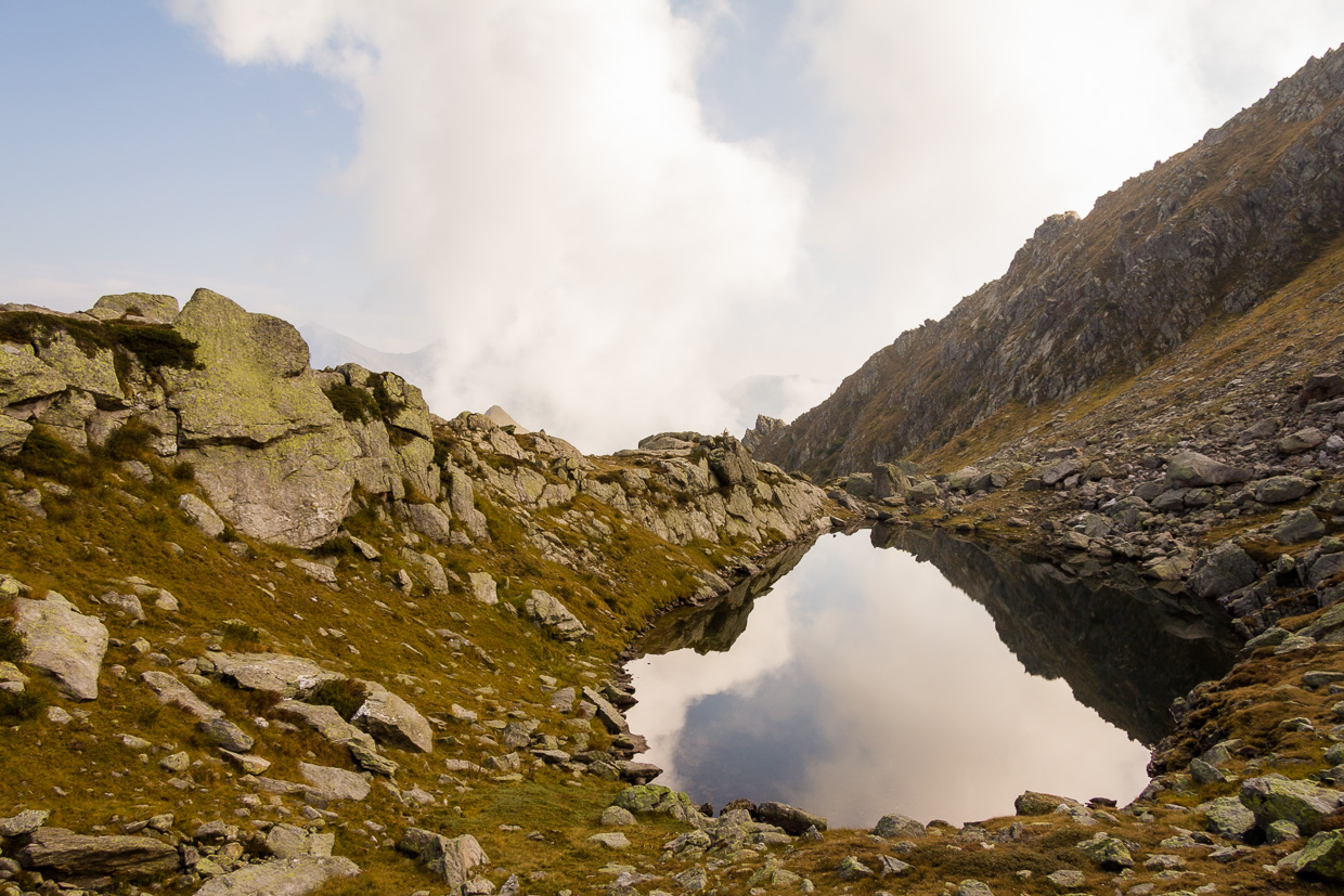 Mit dem kleinen Seilbähnchen fahren wir hoch nach Tremorgio, was uns satte 900 Höhenmeter Aufstieg erspart. Da wir keine Eile haben, lassen wir uns erst mal in der Capanna Tremorgio nieder für einen Kaffee. Es ist ein nebliger Septembertag, die Gipfel sind noch verhüllt. Der kreisrunde See liegt still da. Seine Entstehung ist nicht ganz klar, die einen sind der Meinung, dass er durch einen Meteoriteneinschlag entstanden ist, andere denken eher an einen erloschenen Vulkan. Eine weitere Theorie besagt, dass eine rachsüchtige Hexe die Burg des Herzogs Tremor im Erdboden versinken liess. Der Herzog wurde in eine Alpenakelei verwandelt, deren fünfzackiger Blütenkelch an die Krone des Herzogs erinnert.