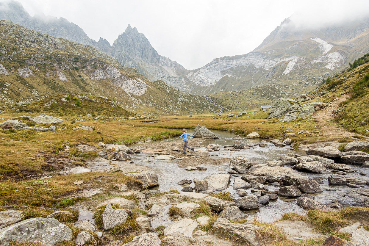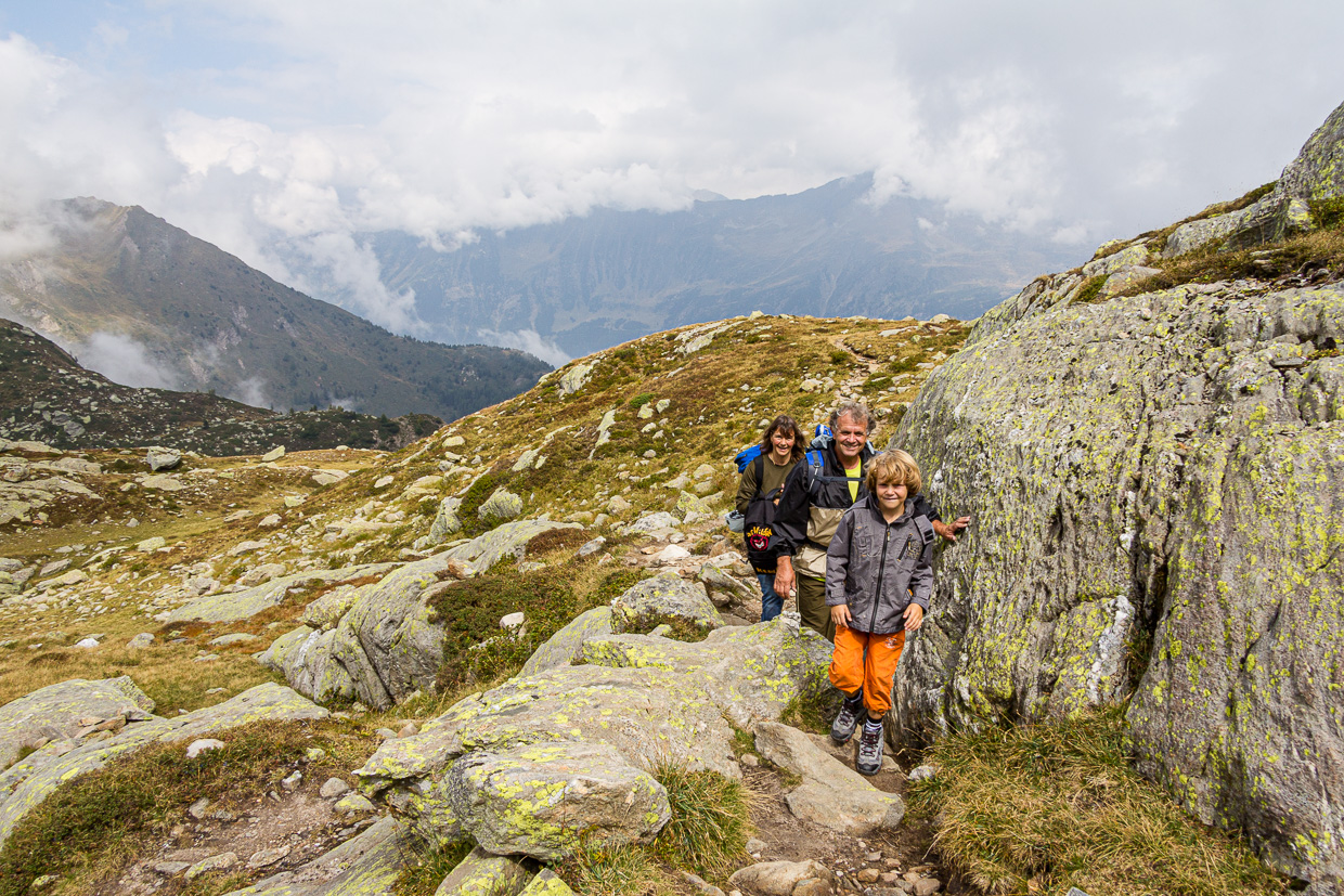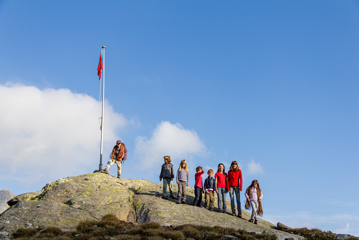 Wir setzen unseren Weg fort zum Passo Vanit. Auch hier ist der Fels schneeweiss. Doch schon ein paar Meter weiter ändert sich das Gestein wieder. Nach dem bröseligen Dolomit finden wir jetzt harten Granit vor. Unsere Gruppe hat sich in die Länge gezogen, vorab die Kinder, hinten die Erwachsenen. Schon bald haben wir alle die Hütte erreicht, die gut sichtbar auf einem Felsen thront.