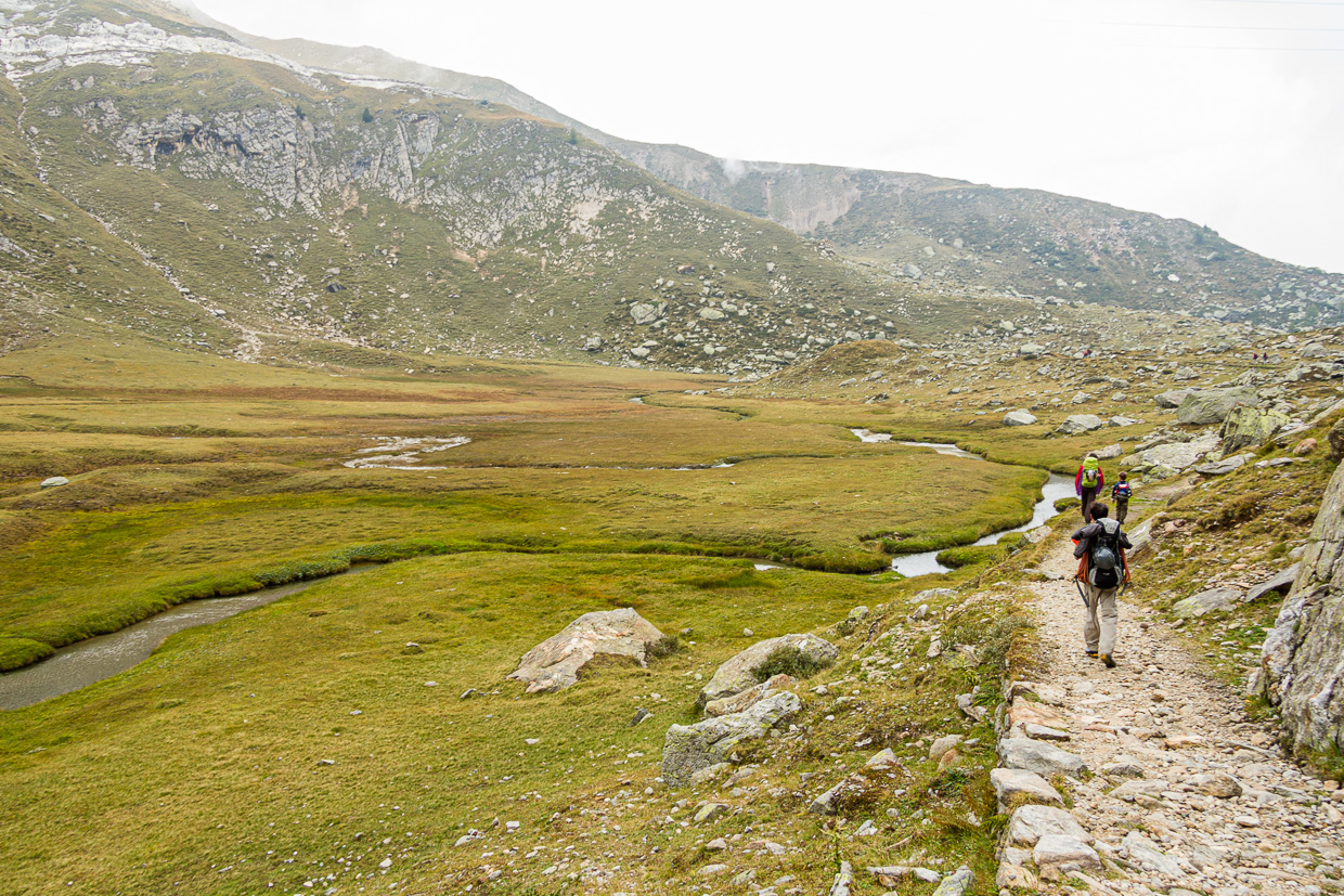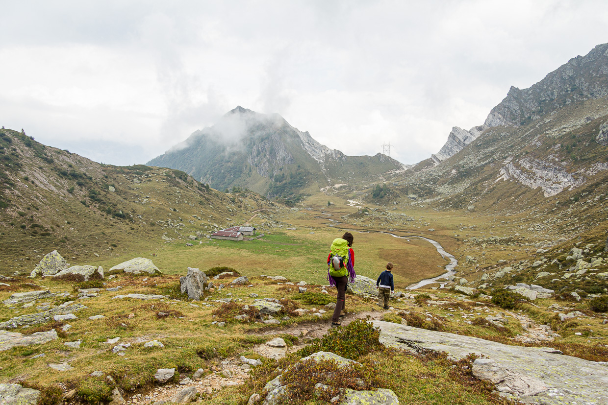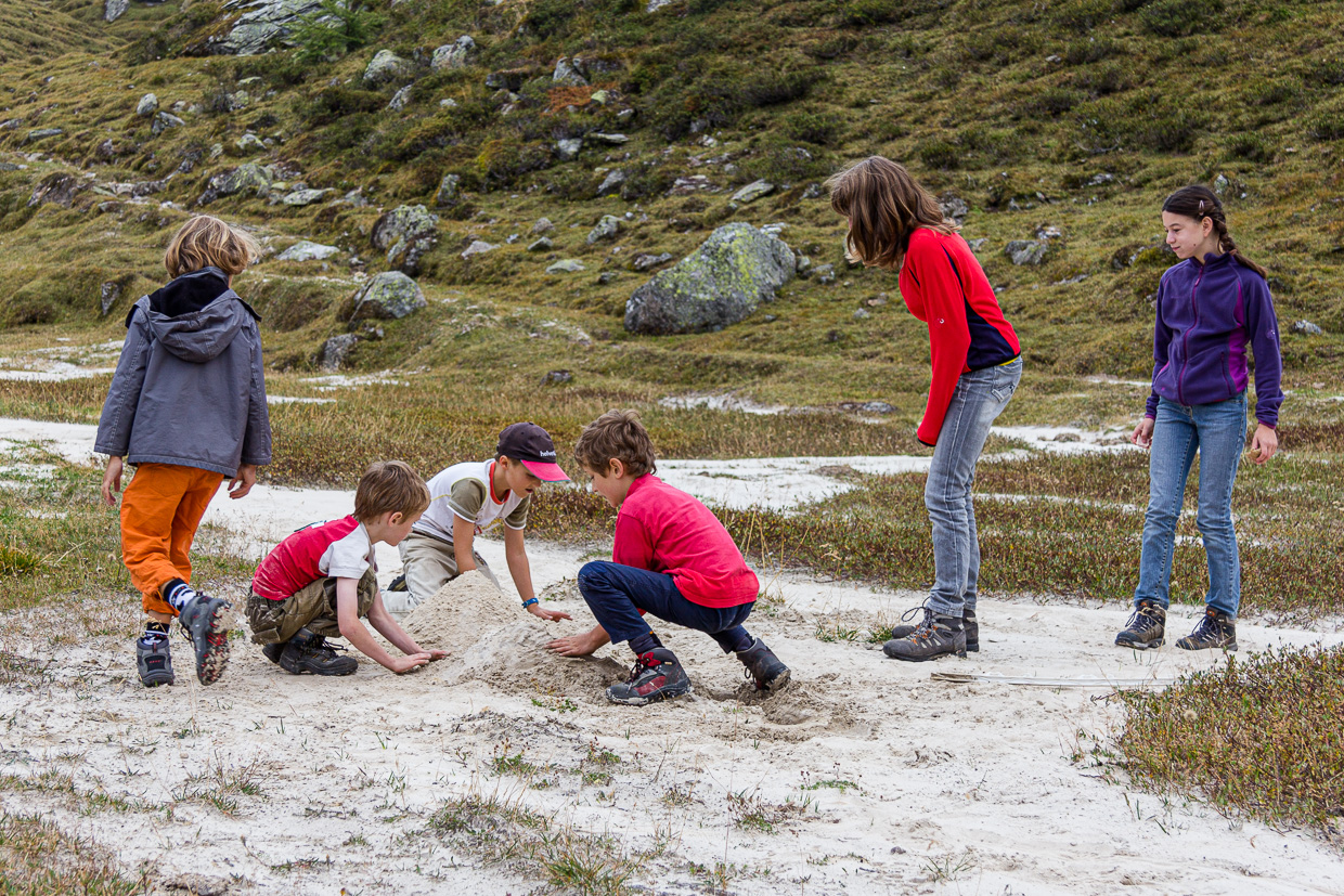 Wir steigen durch lichten Lärchenwald hoch. Bald erreichen wir die Waldgrenze, die Lärchen werden durch Erlengebüsch abgelöst. Nun haben wir den Blick frei auf den ganzen See. Nach einer Stunde erreichen wir eine Hochebene, die Alpe Campolungo. Ein idealer Ort für eine Pause: Ein Bach durchzieht die Alp, die Kinder fangen an zu graben und bauen im feinen, weissen Sand. Dieser stammt vom Dolomit, der sich hier als leuchtend weisses Band durch die Landschaft zieht und eine Fortsetzung der berühmt-berüchtigten Pioramulde ist, die den Ingenieuren des Gotthard-Basistunnels so Bauchschmerzen bereitet hat.