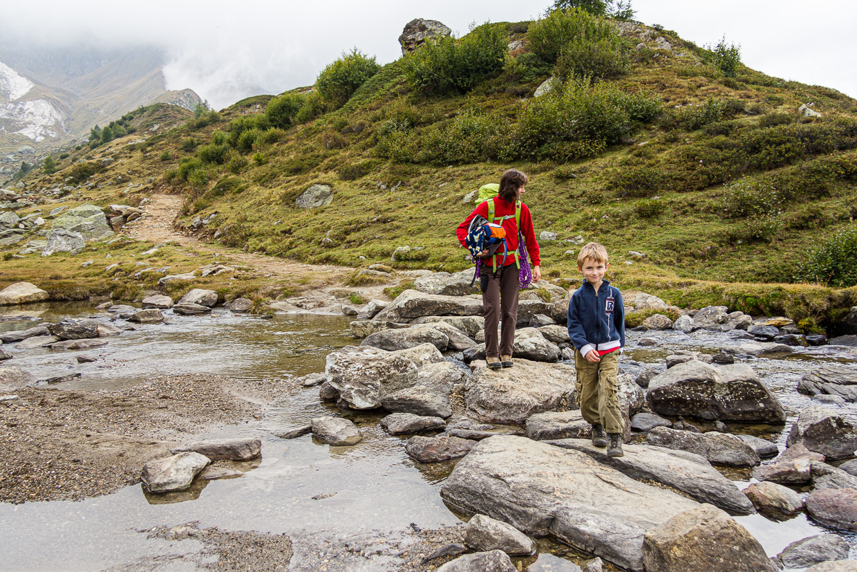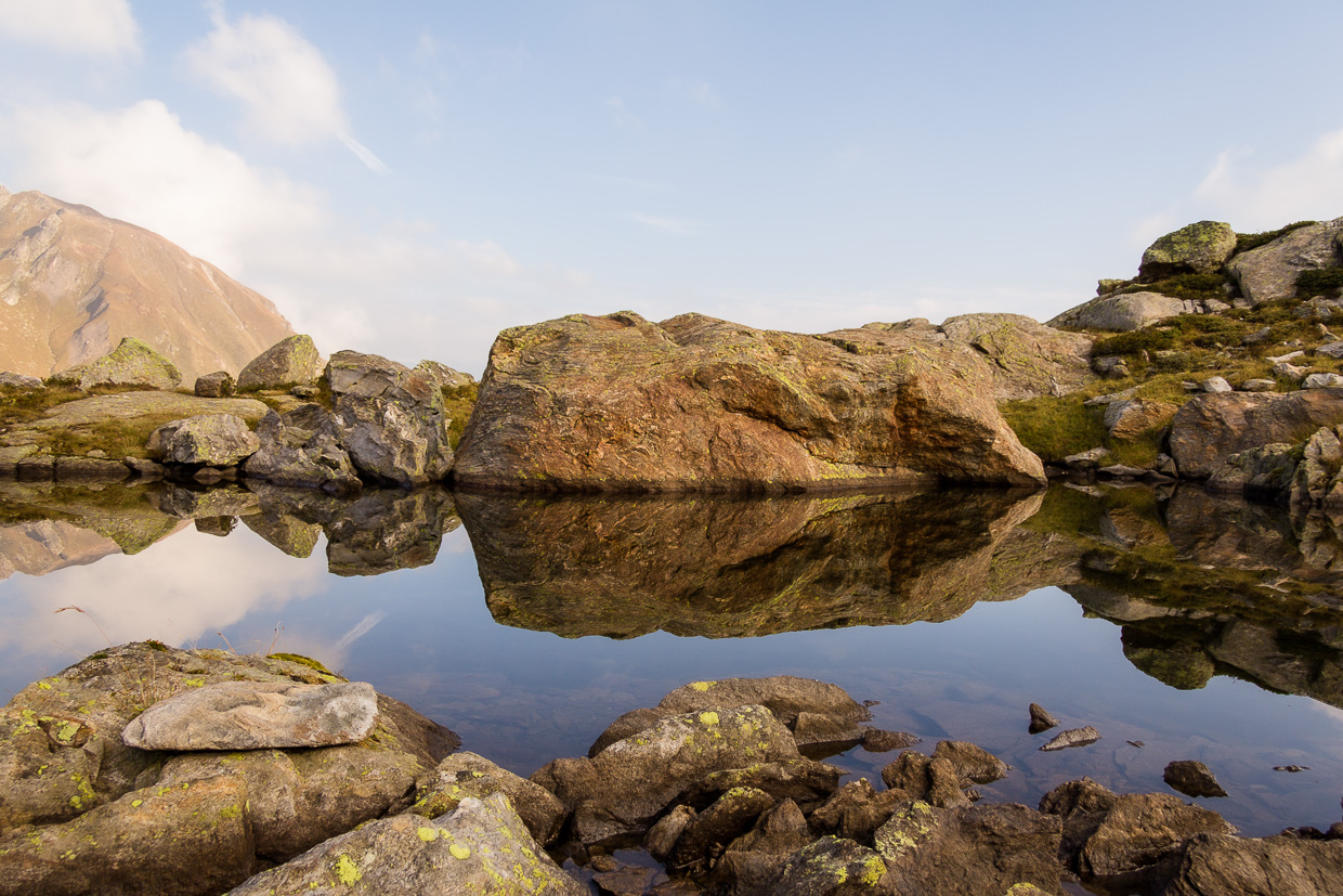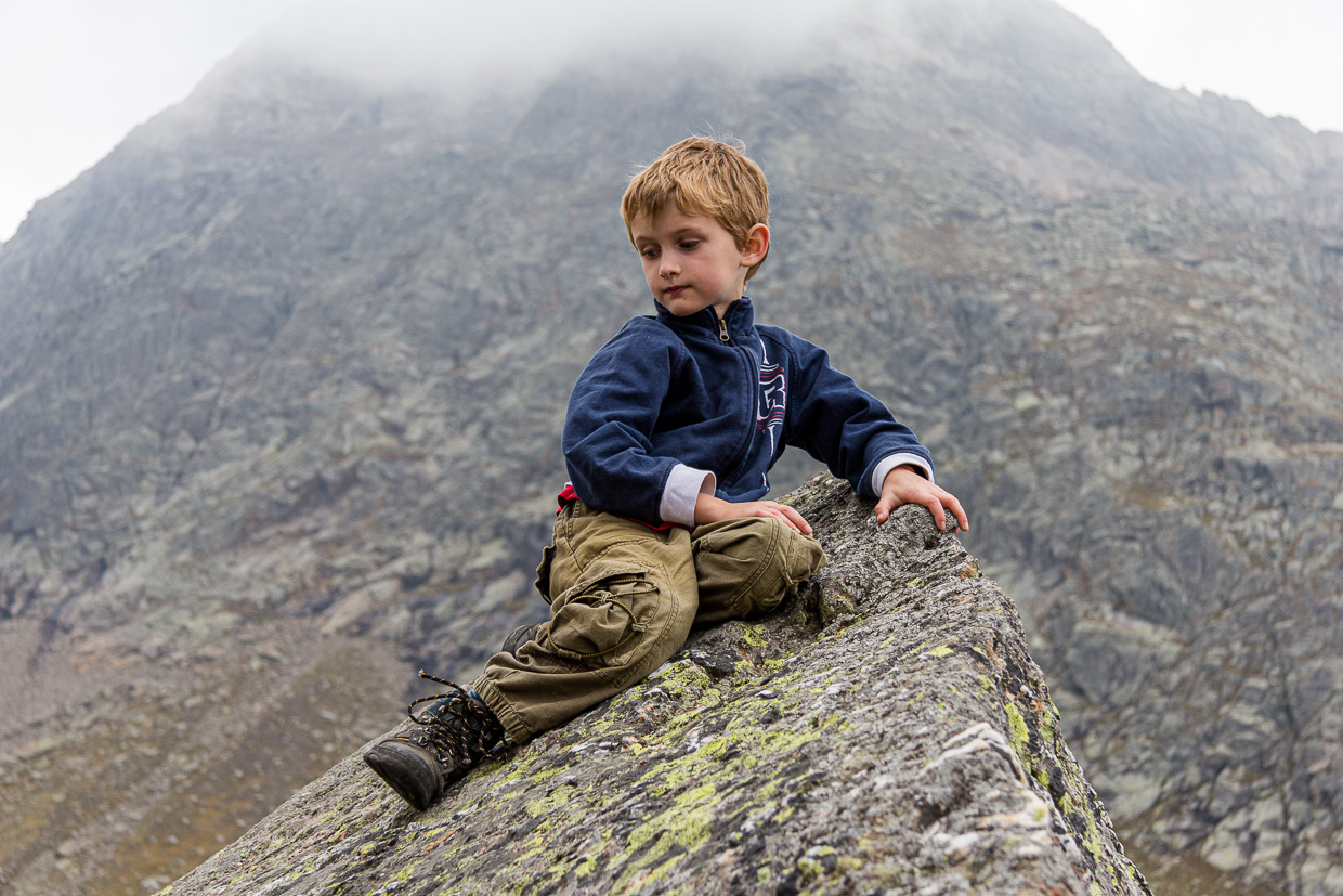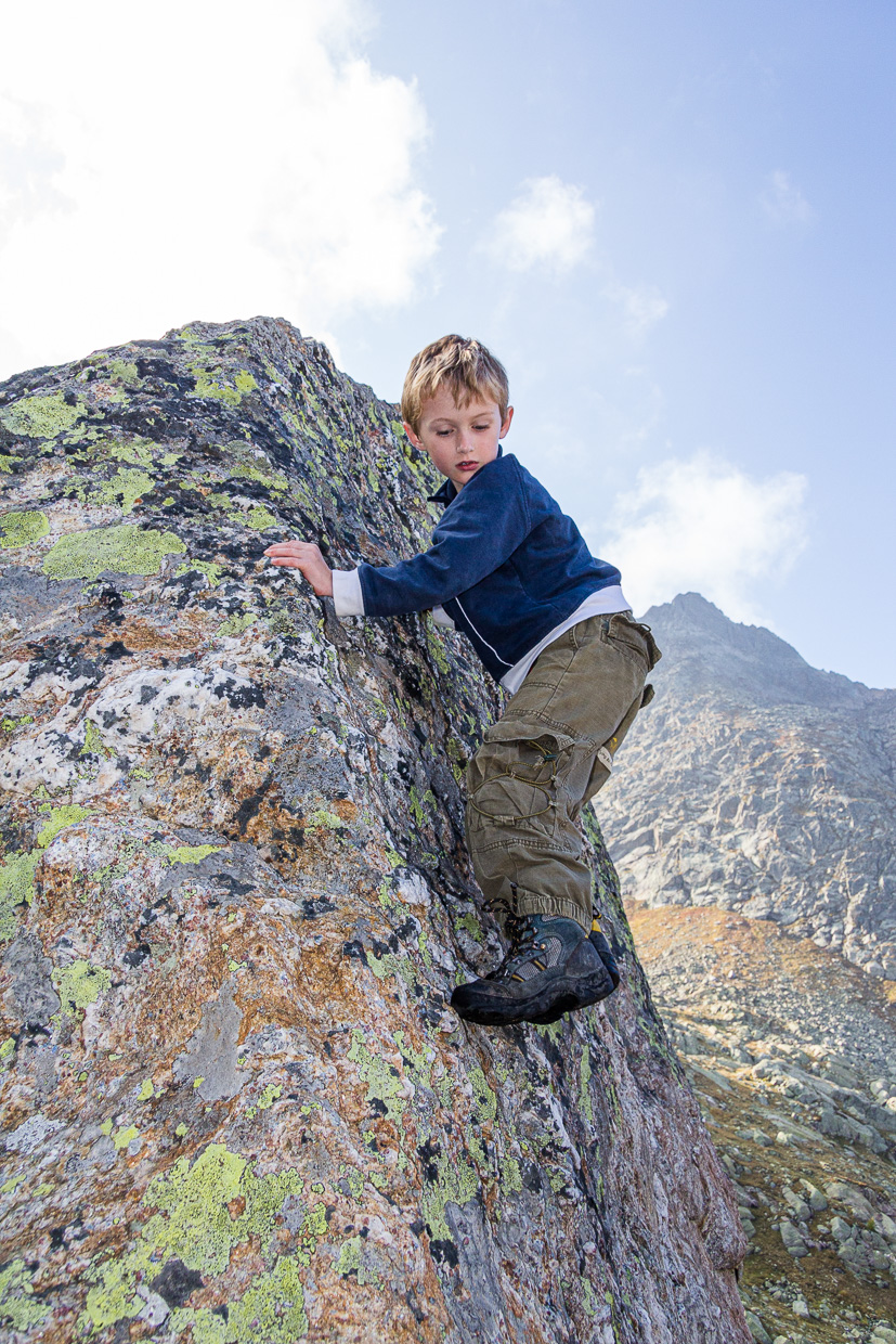 Auf der Terrasse genehmigen wir uns etwas zu trinken, bevor wir in den nächsten Klettergarten aufbrechen, der knapp 300 Meter südlich der Hütte liegt. Zum Vorsteigen eignet er sich allerdings nicht, die Felsen sind nicht für den Vorstieg eingerichtet. Aber für unsere Kinder genügt das, um sich den ganzen restlichen Nachmittag dort auszutoben. Für Kinder von Eltern, die nicht klettern, gibt es viele kleine Felsblöcke, wo sie gefahrlos herumkraxeln können. Gleich hinter der Hütte ist ein grösserer See, der bei wärmerem Wetter wohl zum Baden einladet. Überhaupt hat es überall kleine Seen, die zum verweilen einladen. Da und dort findet man dann auch einen Frosch.