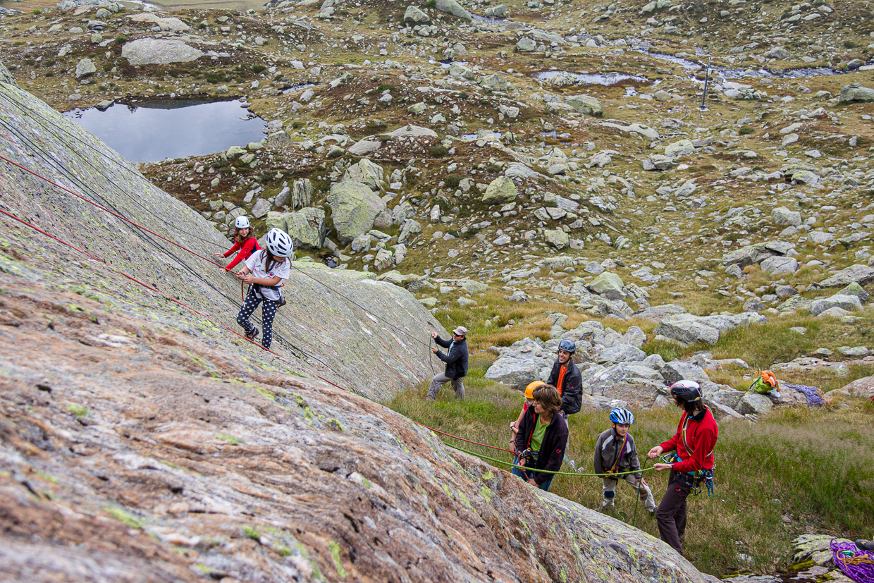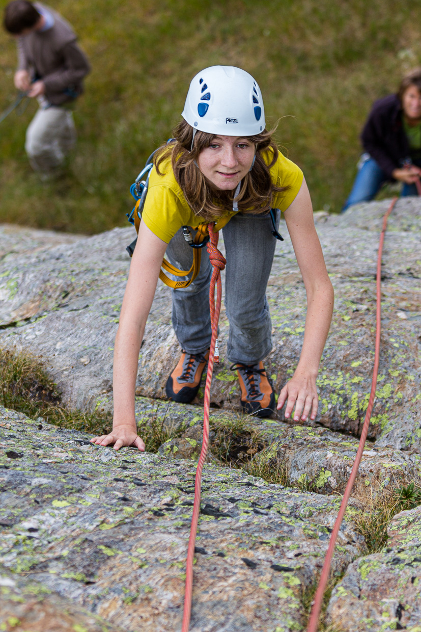 Am nächsten Morgen scheint endlich die versprochene Sonne, wir geniessen die wunderschöne Stimmung. Nach dem Frühstück brechen wir zu anderen Felsen nördlich der Hütte auf und klettern bis zum Mittag. Für den Abstieg von der Hütte wählen wir jetzt einen anderen Weg. Zuerst westwärts, dann Richtung Norden, erreichen wir die Alpe Campolungo und können diese wunderschöne Alp der Länge nach durchqueren. Im riesigen „Sandkasten“ gibt es natürlich nochmals einen Halt, bevor wir wieder zum Tremorgiosee absteigen und mit der Bahn nach Rodi hinunterfahren.