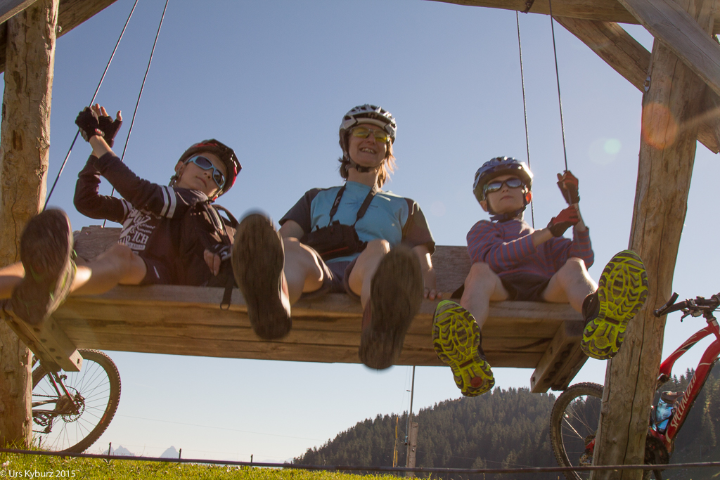 Für eine Reportage über das Biken mit Kindern wollten wir die „Goldiroute“ in Emmetten ausprobieren. Die Beschreibung tönt verlockend: Mit der Seilbahn von Beckenried hoch zur Klewenalp, rüber zur Stockhütte, runter nach Emmetten, weiter nach Seelisberg und runter bis nach Treib am Vierwaldstättersee, von wo es mit dem Schiff zurück nach Beckenried geht. Das haben wir auch gemacht, aber nicht immer auf der Originalroute. Und was soll ich sagen, es war der Hammer! Wir nannten sie deshalb „Goldiroute superplus“.