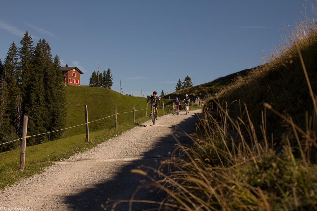 Wir fahren zuerst auf der Seelisbergstrasse hinunter bis zum „Blätz“ und zweigen dort, der Beschilderung folgend (aber der weinroten), nach links ab und fahren an einer Kapelle vorbei. Ab hier steigt nun die Strasse an, ist aber immer noch asphaltiert. Am Waldrand legen wir eine Pause ein und fahren dann auf der Schotterstrasse weiter. Nun wird sie aber wirklich steil und wir wissen nun, was Herr Christen gemeint hat.