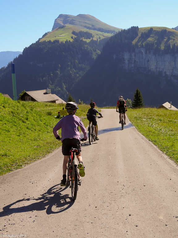 Für kleine Kinder gibt es einen Spielplatz und einen Streichelzoo. Wir fahren los, wollen zur Stockhütte rüber. Schon bei der ersten Verzweigung bleiben wir stehen: Zwei Wege führen zur Stockhütte. Wir nehmen jenen, wo auch der Bikewegweiser hinzeigt. Statt eines Aufstieges erwartet uns erst mal eine Abfahrt auf einer Schotterstrasse. Beim Tannibüel fahren wir in eine Steigung hinein. Jetzt geht es hoch! Ja, aber nur ein paar Meter, dann ist auch schon die nächste Abfahrt fällig. Bis jetzt war diese Route weder technisch noch konditionell anspruchsvoll, so wie sie sein muss für eine Familientour. Wir fahren weiter ab auf der Alpstrasse, halten ab und zu an und bestaunen die herrliche Bergwelt. Und ehe wir uns versehen, sind wir bei der Stockhütte, wo wir diesen Sommer schon mal waren. Pause oder nicht? Klar, wir haben ja Zeit, und Durst ebenfalls.