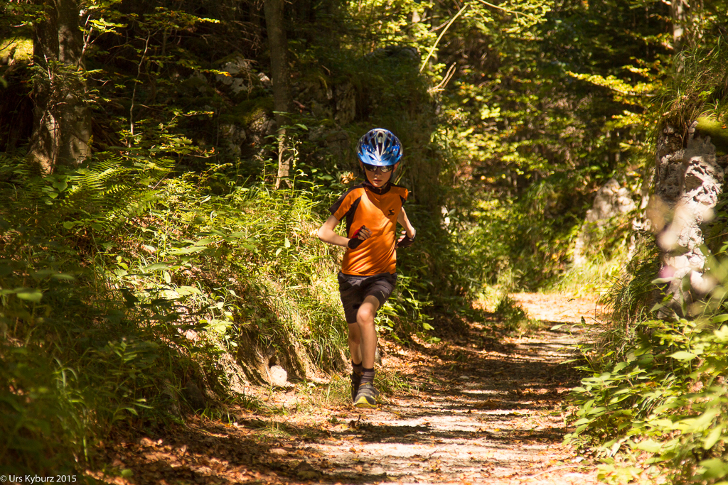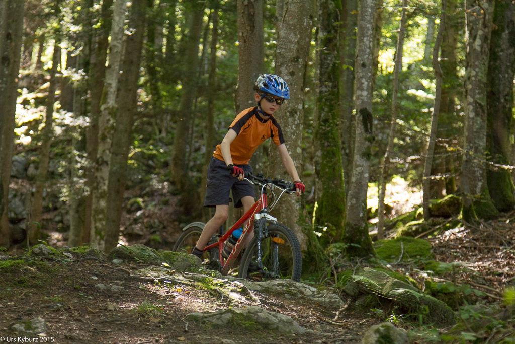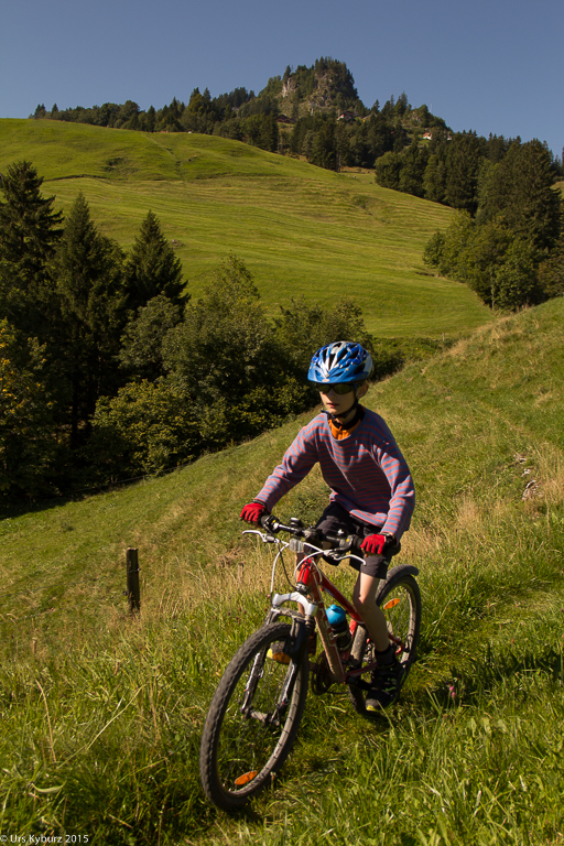 Für die Goldiroute empfiehlt uns Herr Christen Varianten. „Für euch ist das nichts, ihr müsst hier runter fahren, hier hat es tolle Singletrails.“, und zeichnet uns die Möglichkeiten gleich auf der Karte ein. Das hat kaum Steigungen in dieser Route, die ist ideal für Kinder, finden wir. „Ach ja? Andere finden, das sei sehr steil und habe lange Aufstiege.“ Was wir zu diesem Zeitpunkt noch nicht wissen: Die Steigungen kommen tatsächlich erst noch. Nun wollen wir weiter, wir bedanken uns und fahren weiter, ich mit „Goldi“ im Rucksack.