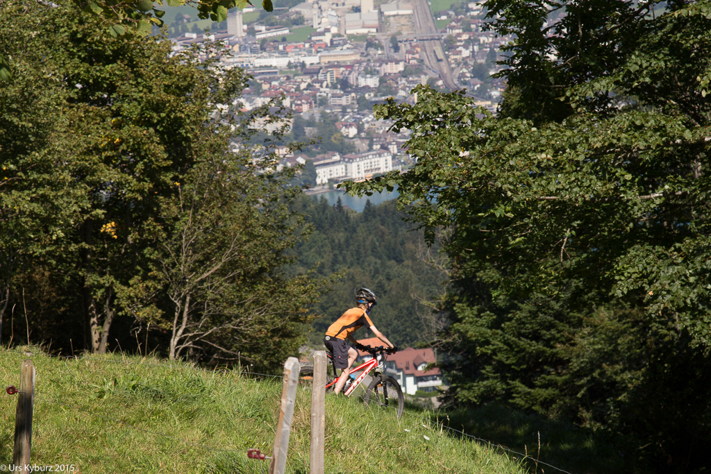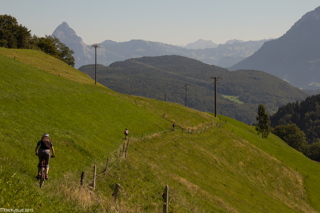 Der weitere Weg ist jetzt nicht mehr so ruppig, dafür mit engen Kurven gespickt. Die erste habe ich eigentlich schon gemeistert, als ich doch noch abstehen muss. Fabian, der vor mir fährt, macht diese trotz seinen grossen Rädern locker. Wir fahren bis zur nächsten Aussichtskanzel, mit Panorama wird nicht gegeizt auf diesem Trail. Die Jungs drängen zum Weiterfahren, es warten noch mehr Singlerails. Durch den Wald und über Wiesen jagen wir Seelisberg entgegen.