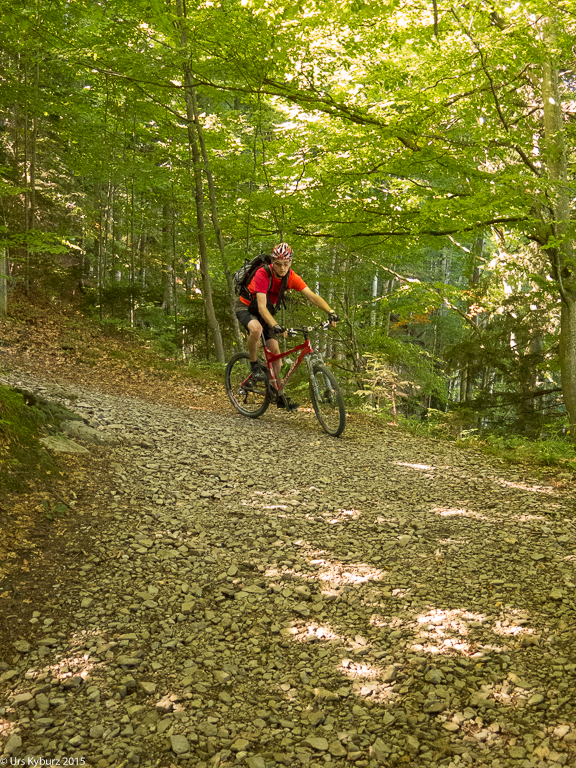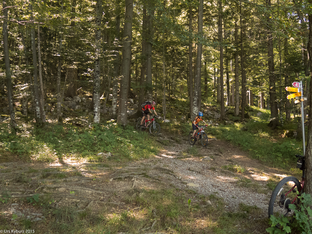 Nach dieser grandiosen Aussicht haben wir nun aber einen Singletrail in Aussicht. Schon kurz nach dem Start kommt eine Verzweigung: Links der Wanderweg, geradeaus der Biketrail. Wir wollen aber nicht auf die Strasse runter! Wir fahren trotzdem mal in diese Richtung, vielleicht wird das ja was. Zuerst geht es aber steil zwischen Steinen hoch, ich schaffe es nicht bis zuoberst und muss schieben.