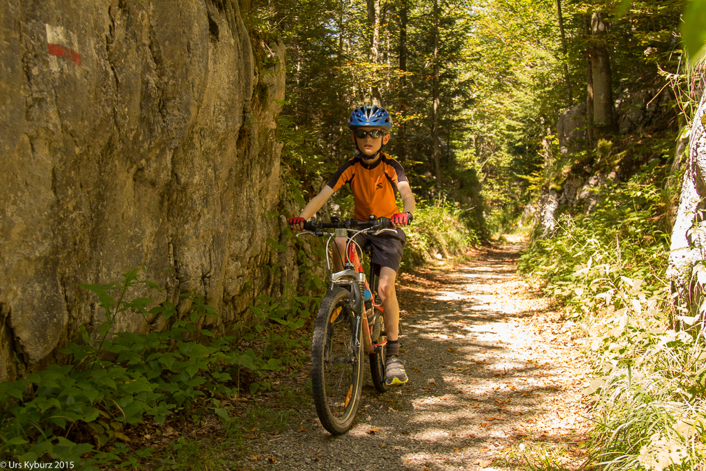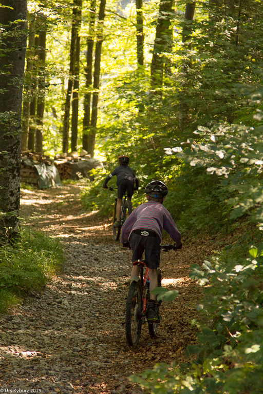 Nach der Pause geht es weiter, die Strecke kennen wir nun. Zuerst auf der Strasse, dann irgendwo im Wald rechts abbiegen in eine Waldstrasse. Damit verlassen wir zum ersten Mal die Goldiroute, aber nur so die Asphaltstrasse hinunter zu fahren ist ein bisschen, na ja, langweilig. Wir brettern also runter, bis sich mit einem Knall eine Premiere ankündigt: Zum ersten Mal auf einer Tour habe ich eine Panne, der Schlauch ist geplatzt. Zehn Minuten verschnaufen für die anderen, zehn Minuten Arbeit für mich. Weiter geht es, wir fahren vorbei an Rotifluh, weiter zum Eggeli. Und danach einbiegen in den Singletrail über die Weide, wir kennen ihn ja. Wir haben das Gefühl, dass wir diesmal lockerer fahren, ich steige jedenfalls nie ab, im Gegensatz zum letzten Mal. Dann in den Wald einbiegen, auf dem Weg locker nach unten fahren, und schon bald stehen wir auf der Strasse. Irgendwie geht alles schneller als vor eineinhalb Monaten.