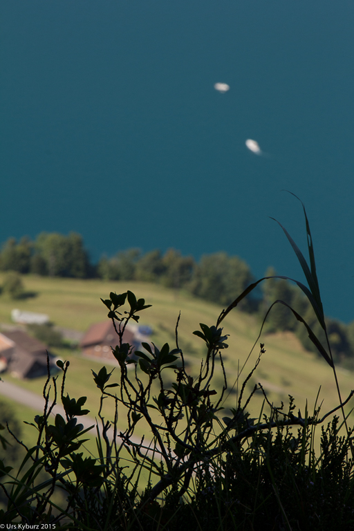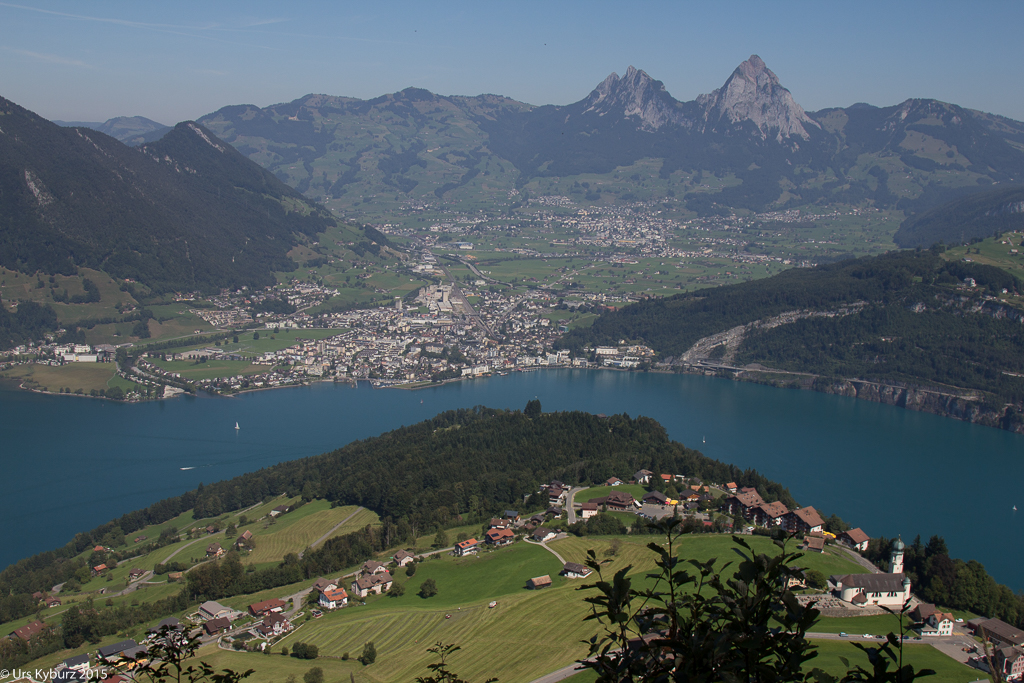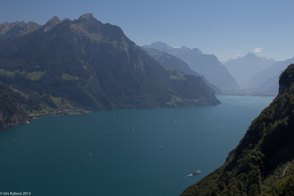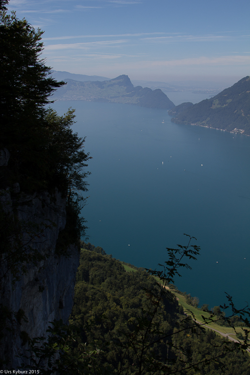 Nach dieser Zusatzschlaufe durch den Brennwald (Route 924) wechseln wir auf die Route Höch Flue (Route 925). Zuerst kommen wir aber an einen Aussichtspunkt. Und was für eine Aussicht wir da haben! Da bleibt einem die Spucke weg: Wir stehen über einer senkrechten Felswand, der tiefblaue Vierwaldstättersee liegt fast 600 Meter weiter unten, vis-à-vis die Rigi, weit hinten Luzern, in die andere Richtung die beiden Mythen mit Schwyz zu deren Füssen.